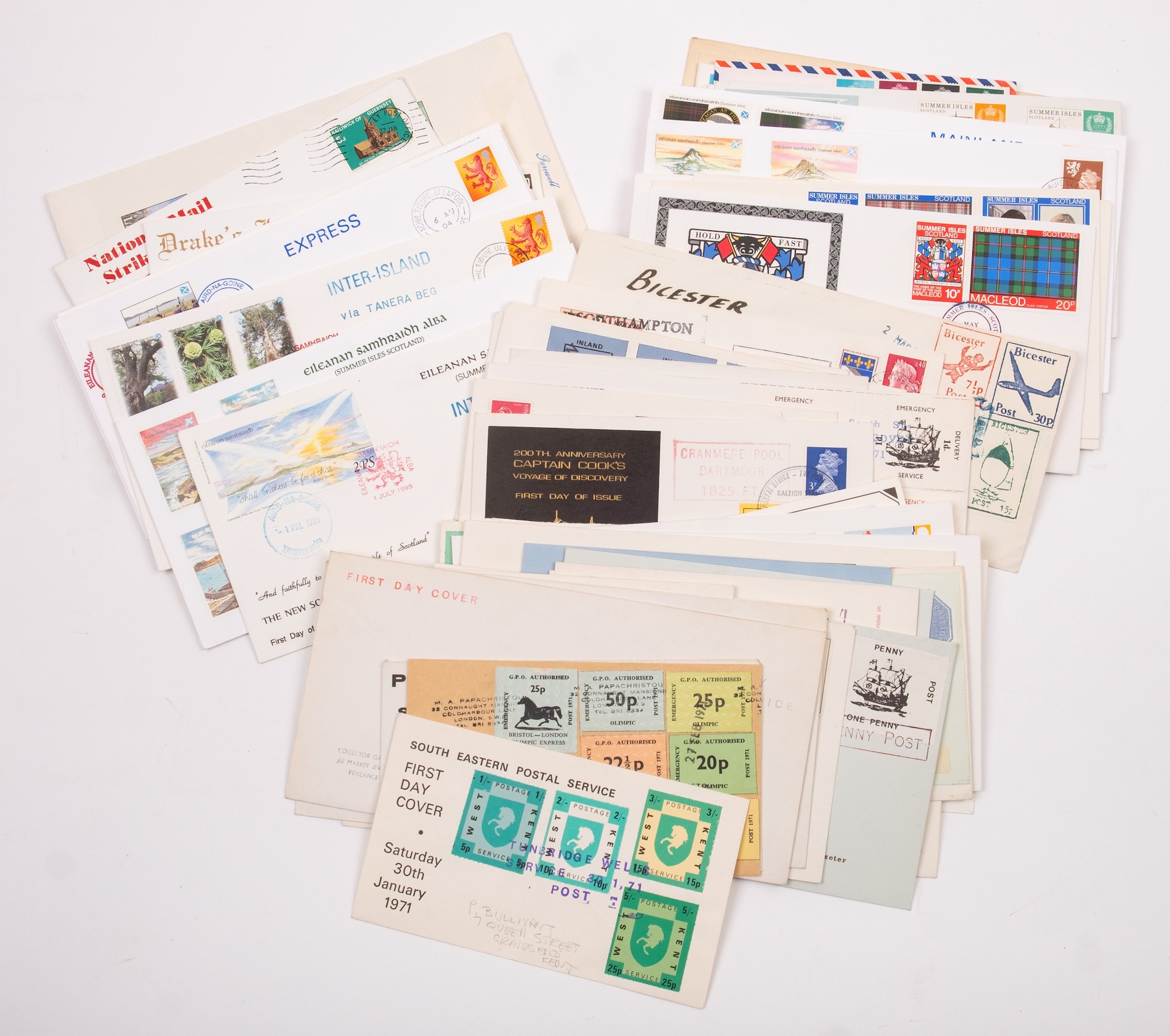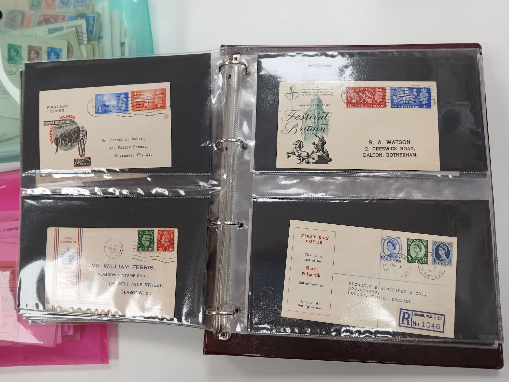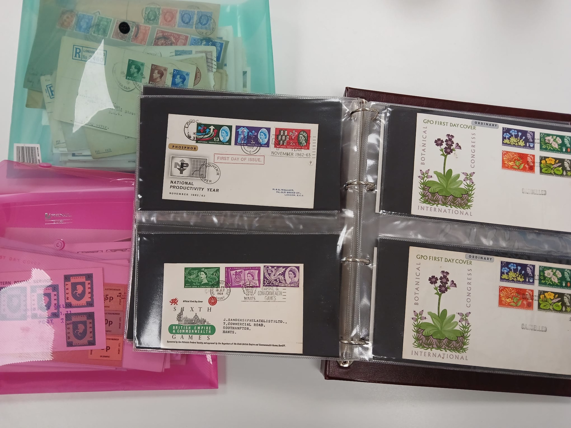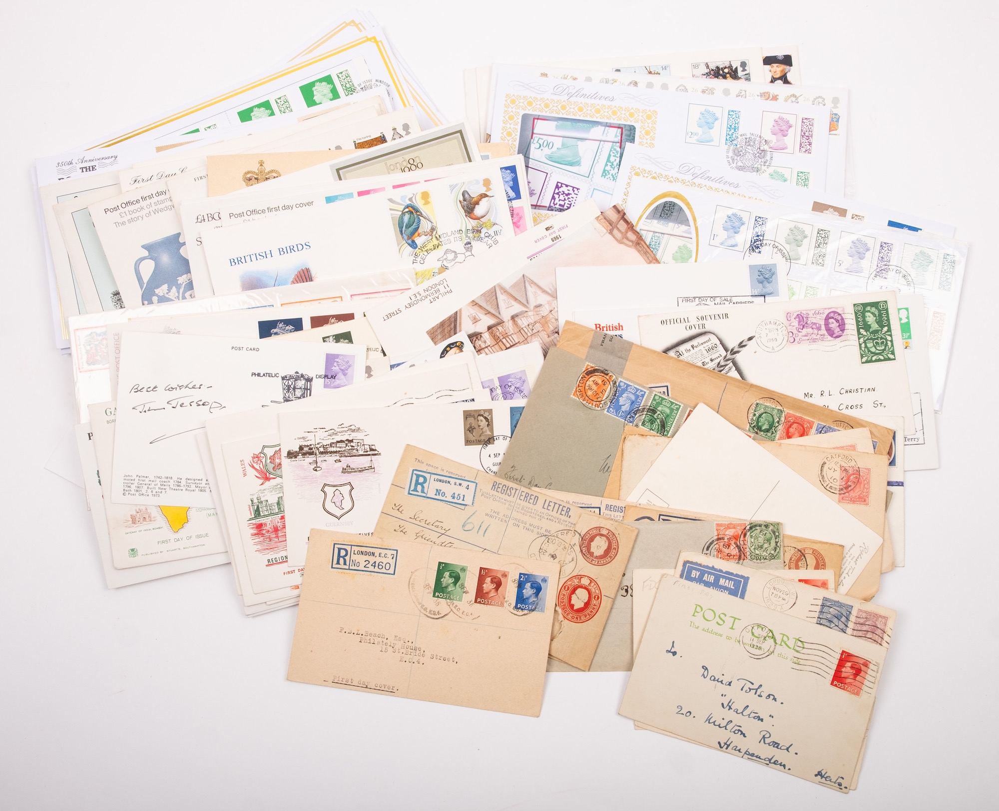 Great Britain. An album of mostly better First Day Covers and others, including King George VI Illustrated First Day Cover 10th May 1937, £1 Castle 1st September 1955, Wilding 4d,1/3,1/6 on illustrated FDC 2 Nov 1953, two 1965 Botanical illustrated FDC stamped ''CANCELLED'', 1963 NPY illustrated Phosphor, 1958 Games Empire Games Slogan, 1957 Scouts Jamboree slogan, the difficult 1967 Flowers with RSH Health Congress on Eastbourne Health Congress cover, various signed including 1967 Paintings Denys James Watkins-Pitchford ''BB'', also QV 2d Blue and 6d tied to Malta JA 16 1874, Westcountry Air Service and Railway Service KGV covers, 1890 Penny Postage Jubilee cards with cancels, and a good run of Channel Island Wartime covers including Bisects (four covers), and FDCs etc. (60 items in album), plus a qty of various others loose in two plastic folder including strike mail, local, useful.