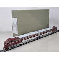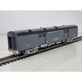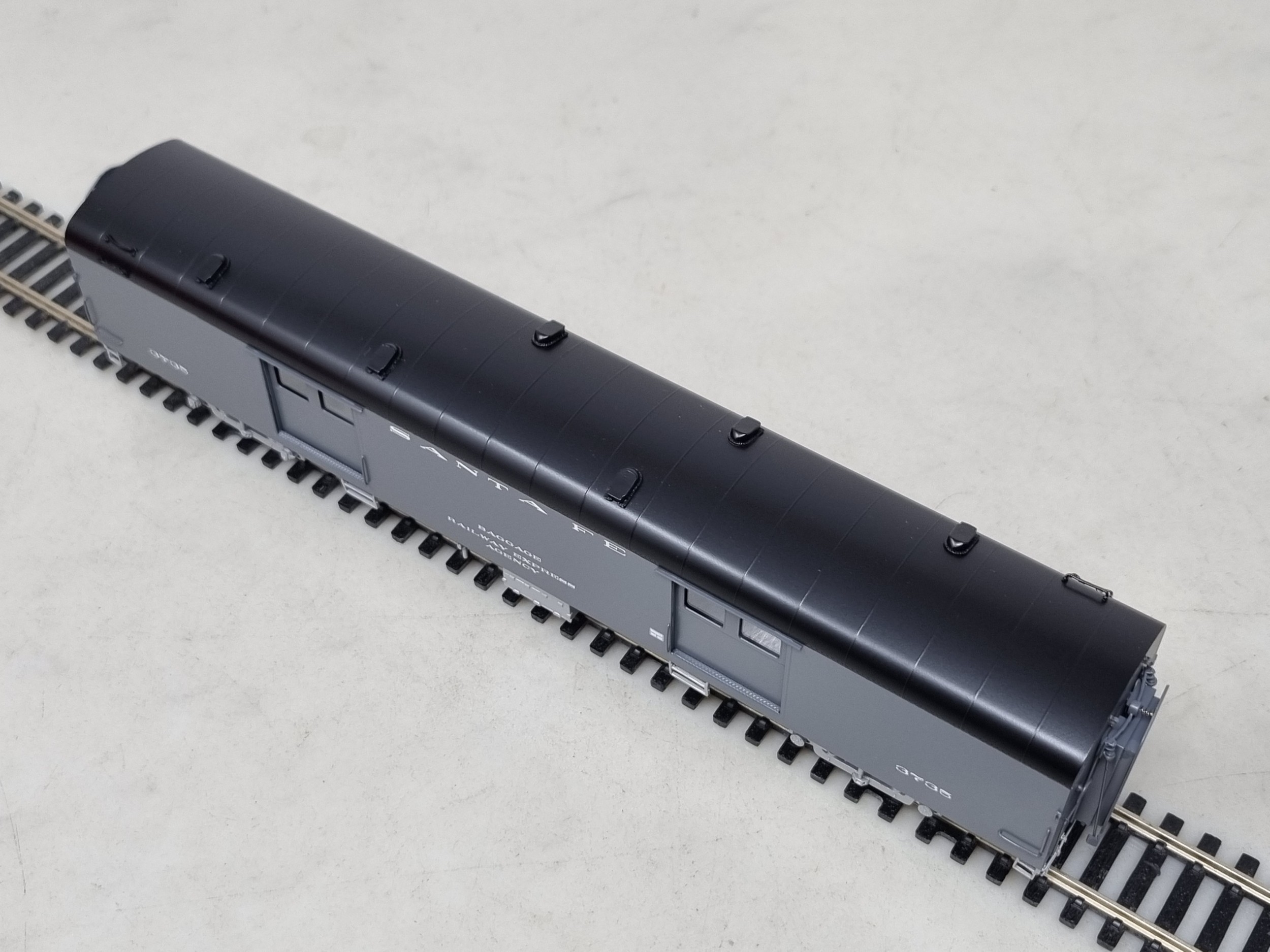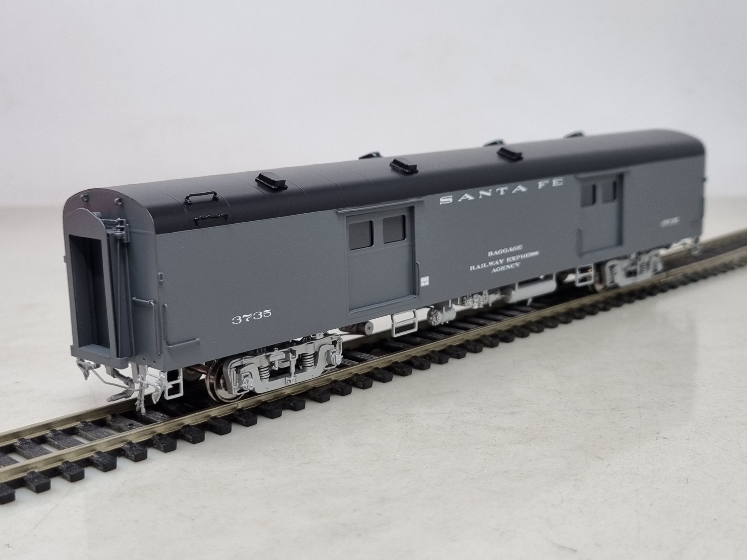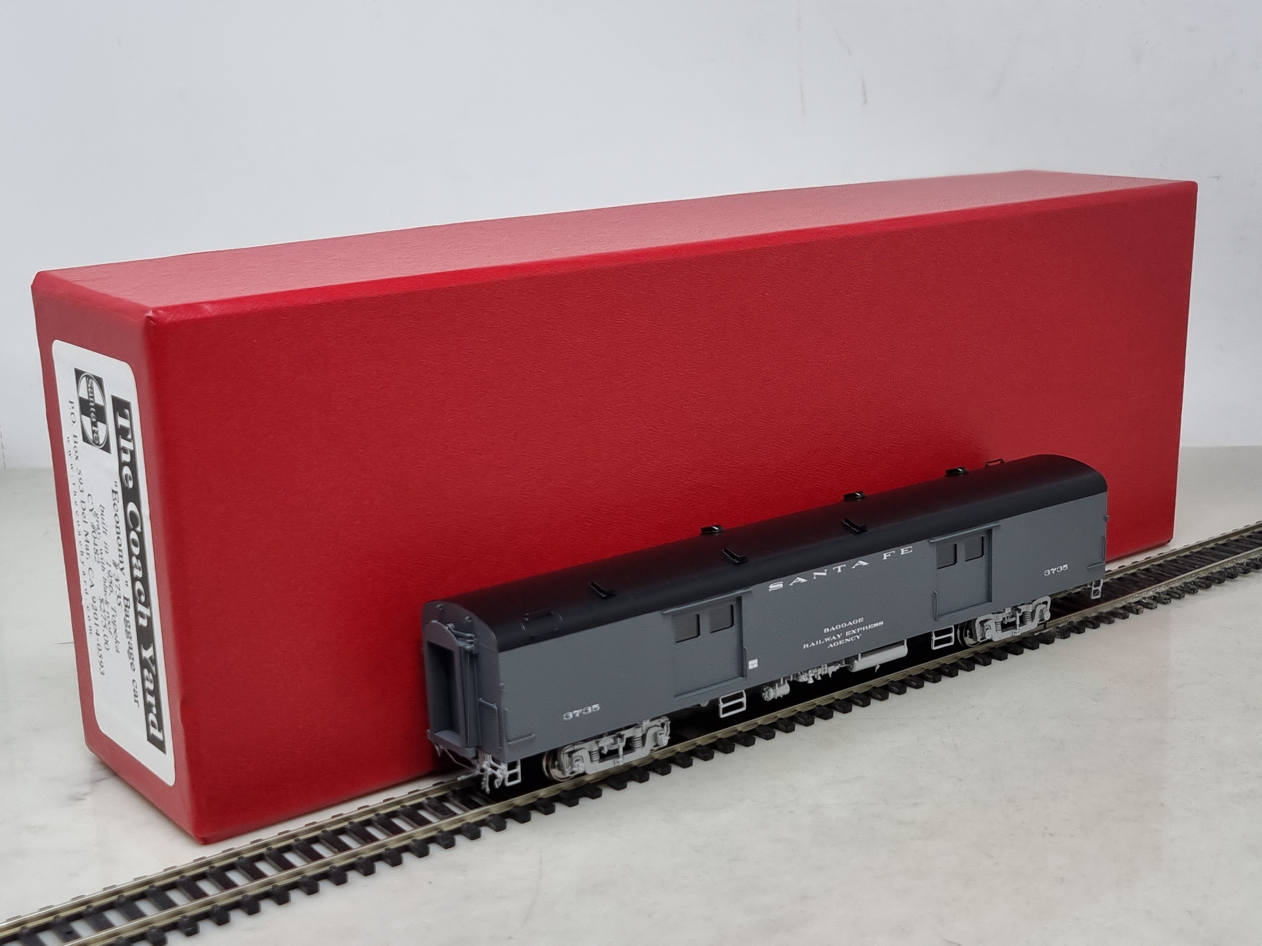 A boxed The Coach Yard brass H0 scale 'Economy' Baggage Car, factory painted in Santa Fe grey livery No.3735, unused in perfect box