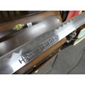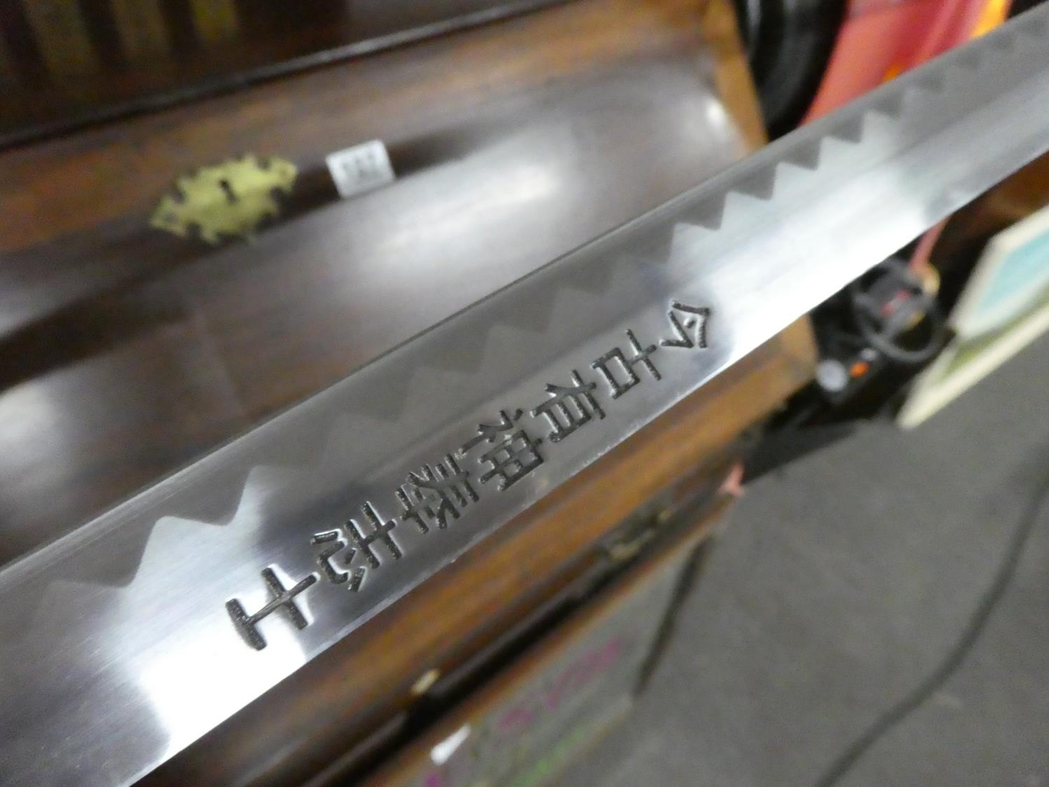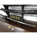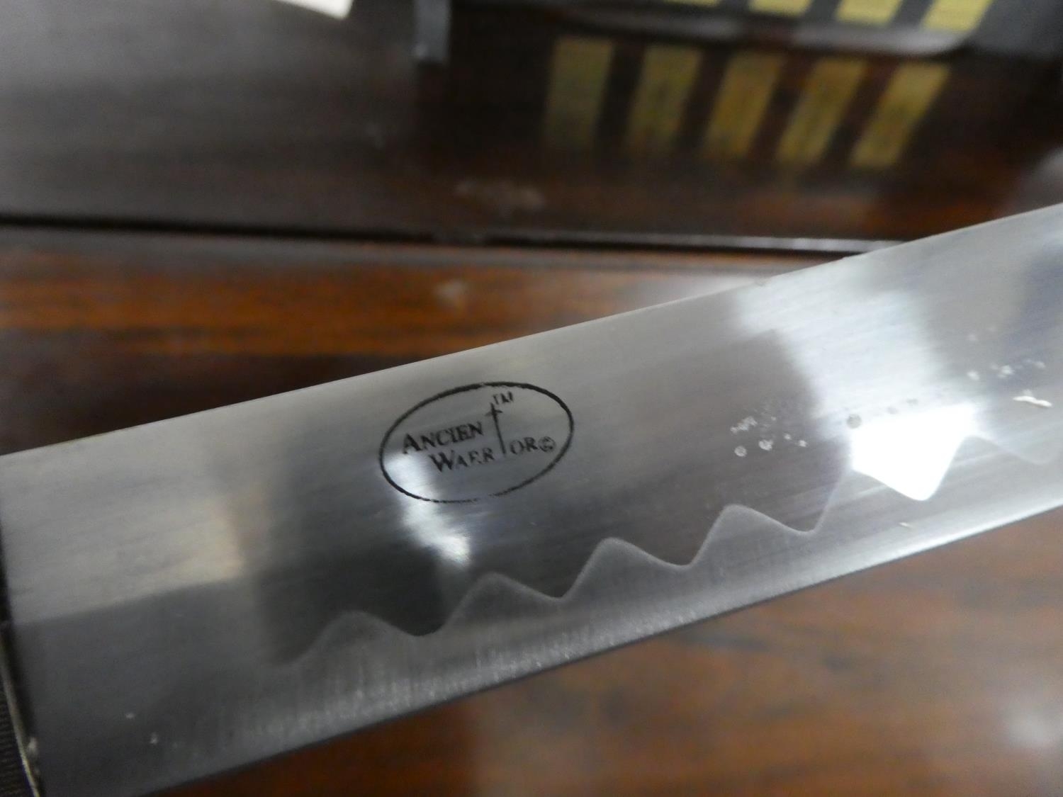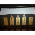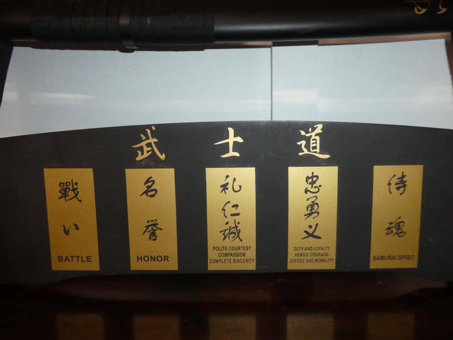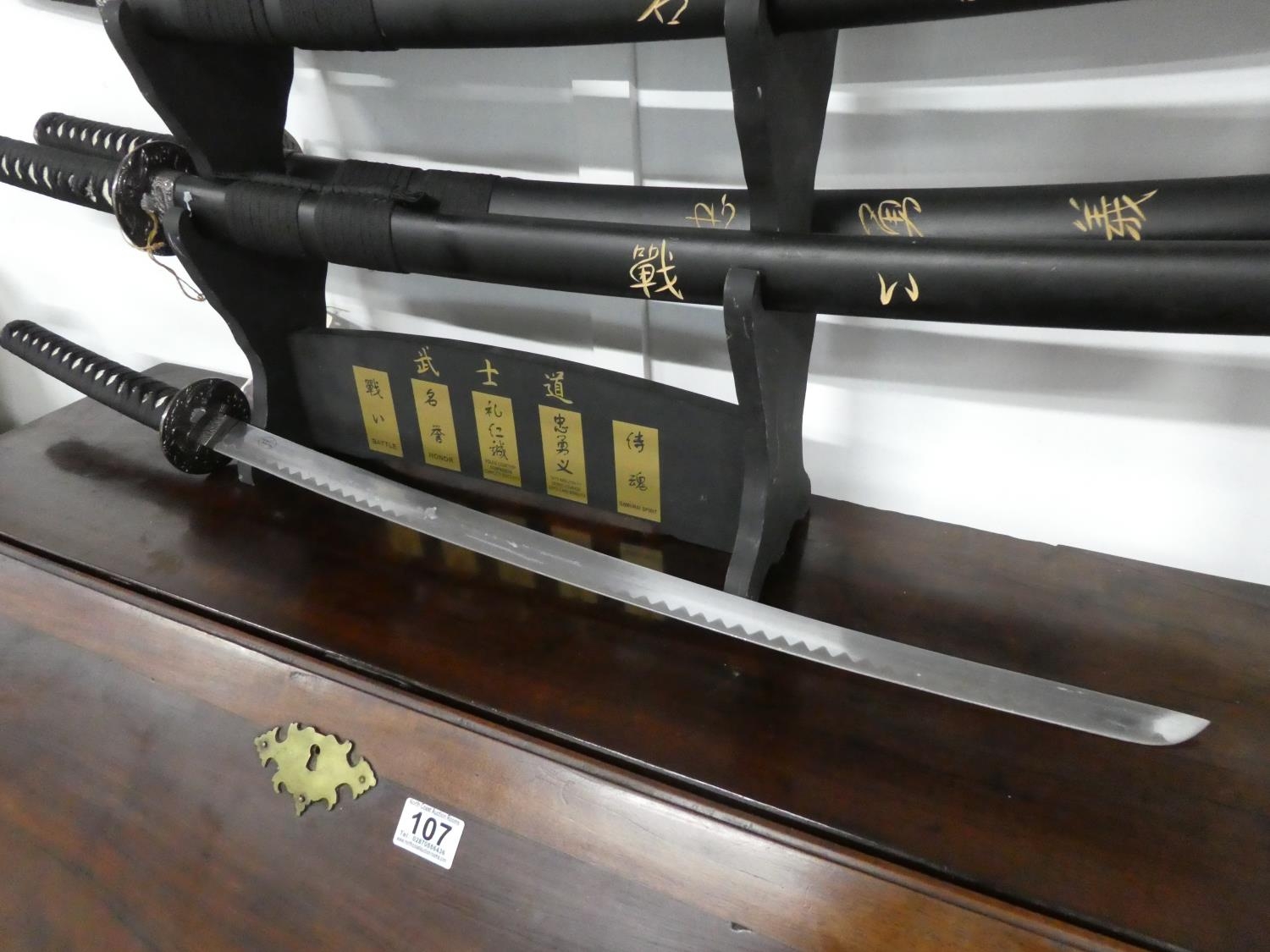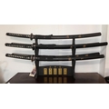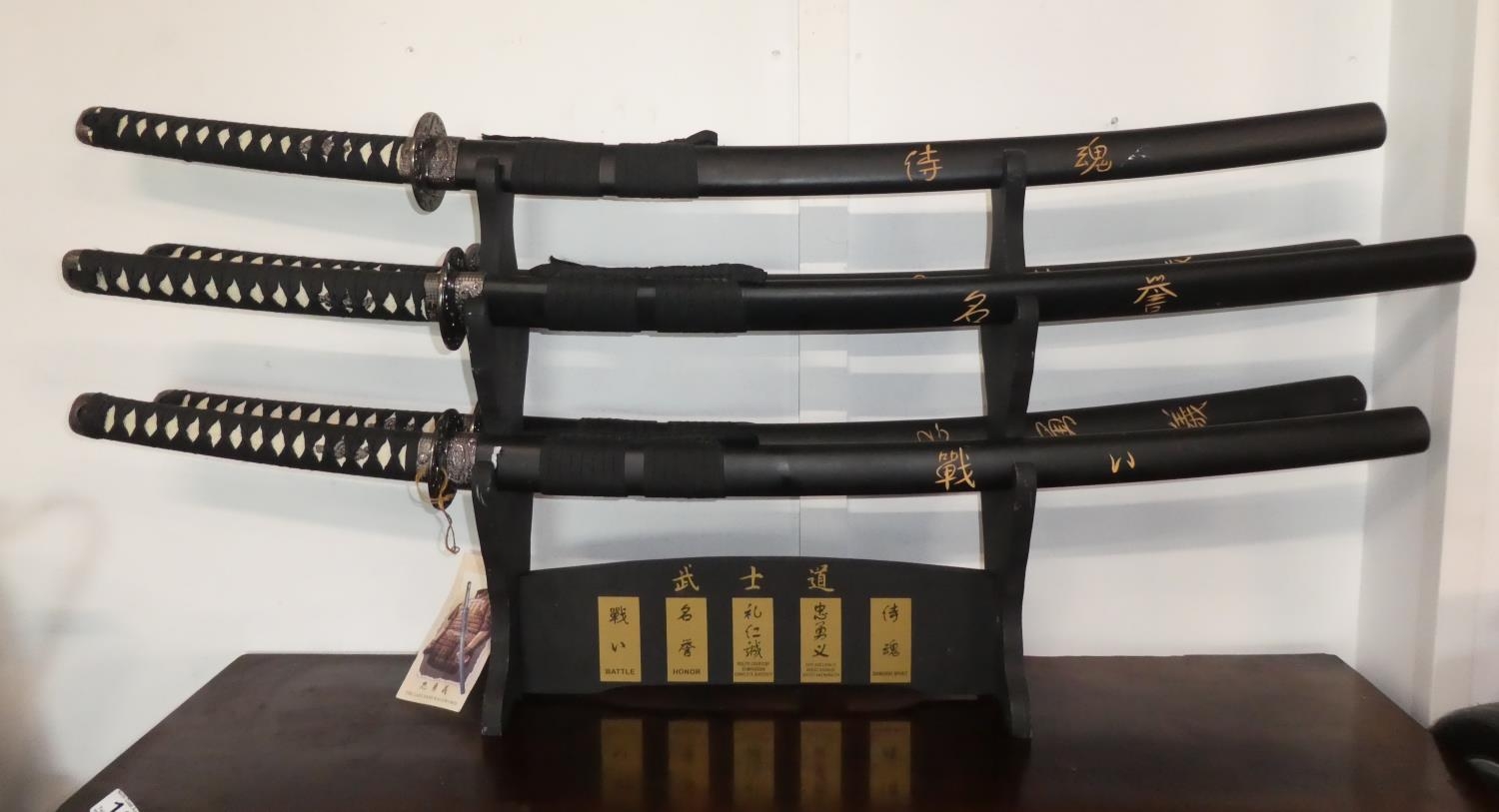 A set of five martial art samurai swords on presentation stand.