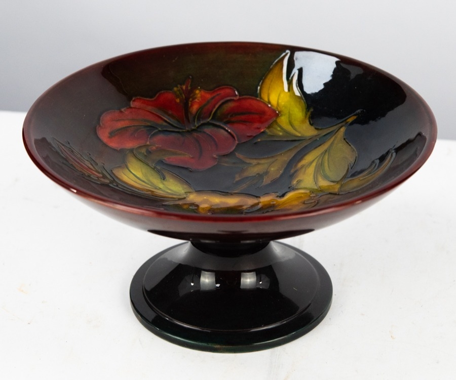 WALTER MOORCROFT HIBISCUS PATTERN TUBE LINED AND FLAMBE GLAZED POTTERY PEDESTAL DISH, of typical form, decorated in tones of red, yellow and green, 3 ¾” (9.5cm) high, 7 ¼” (18.4cm) diameter, impressed marks C/R- some scratching, mostly to the interior, otherwise appears good