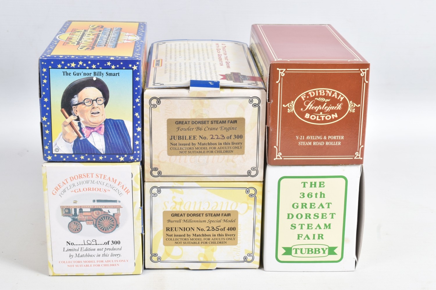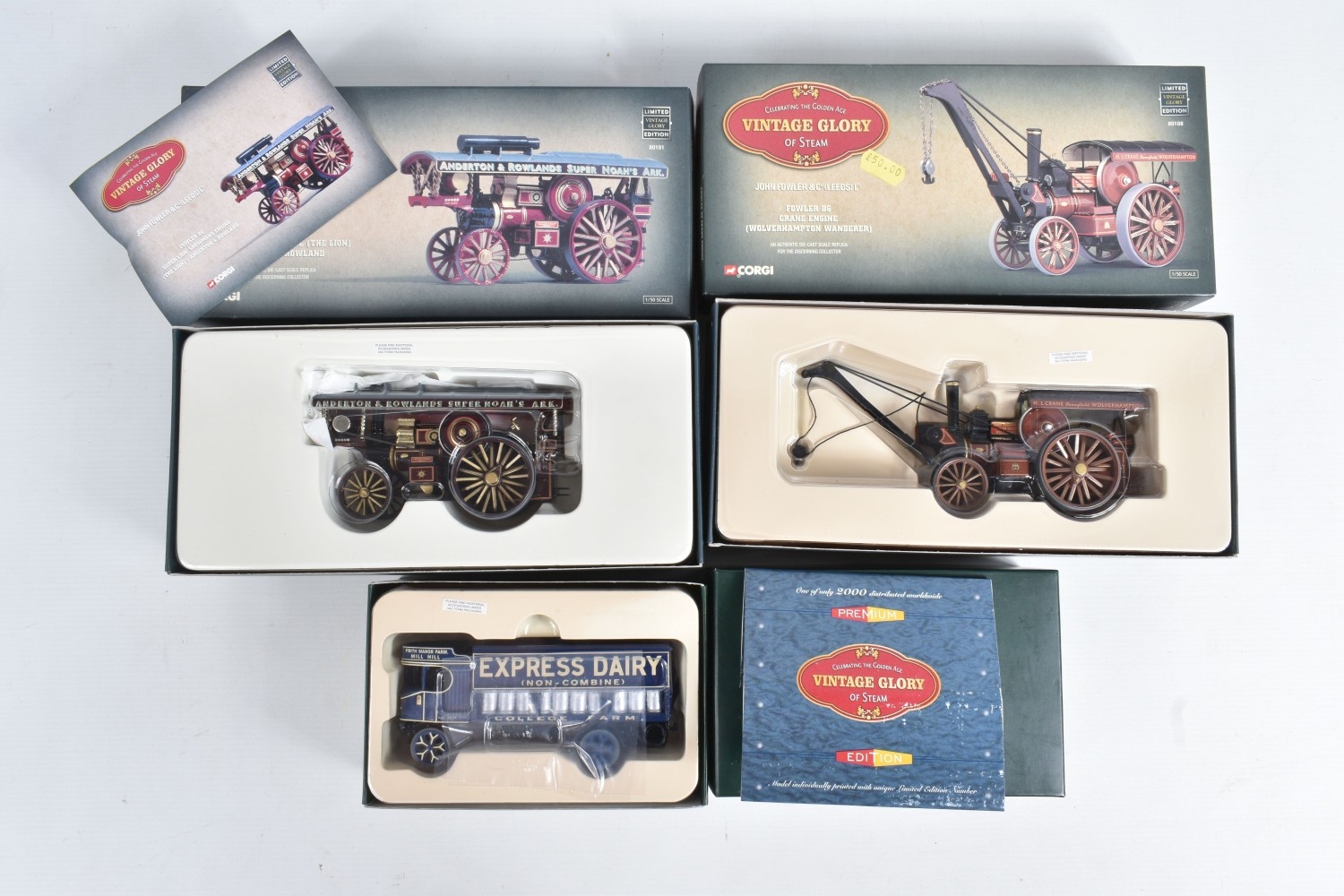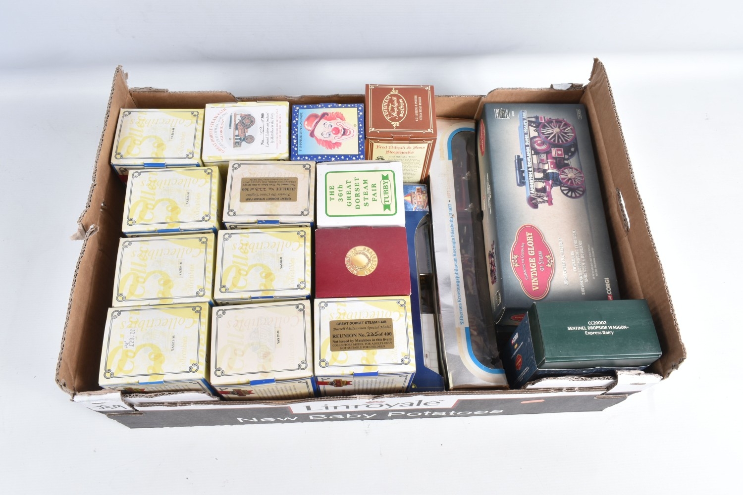 A COLLECTION OF BOXED CORGI VINTAGE GLORY OF STEAM AND MATCHBOX COLLECTIBLES/MODELS OF YESTERYEAR STEAM POWERED VEHICLES, to include Vintage Glory of Steam Fowler B6 Showmans Locomotive 'The Lion' - Anderton & Rowlands, No.80101, similar Fowler B6 Crane Engine - H.L. Crane, No.80108, Matchbox Collectibles & Models of Yesteryear including four different limited edition Code 4 Great Dorset Steam Fair related models, boxed Mijiped Models limited edition Code 4 Matchbox Models of Yesteryear Foden Steam Wagon, No.Y27 modified to a Tractor - P. Van Houten, Corgi, Lledo, all models appear complete and in very good condition, look to have hardly, if ever, been removed from boxes, majority with limited edition certificate or sticker as appropriate, majority of boxes in good condition with only minor damage, marking and wear (19)