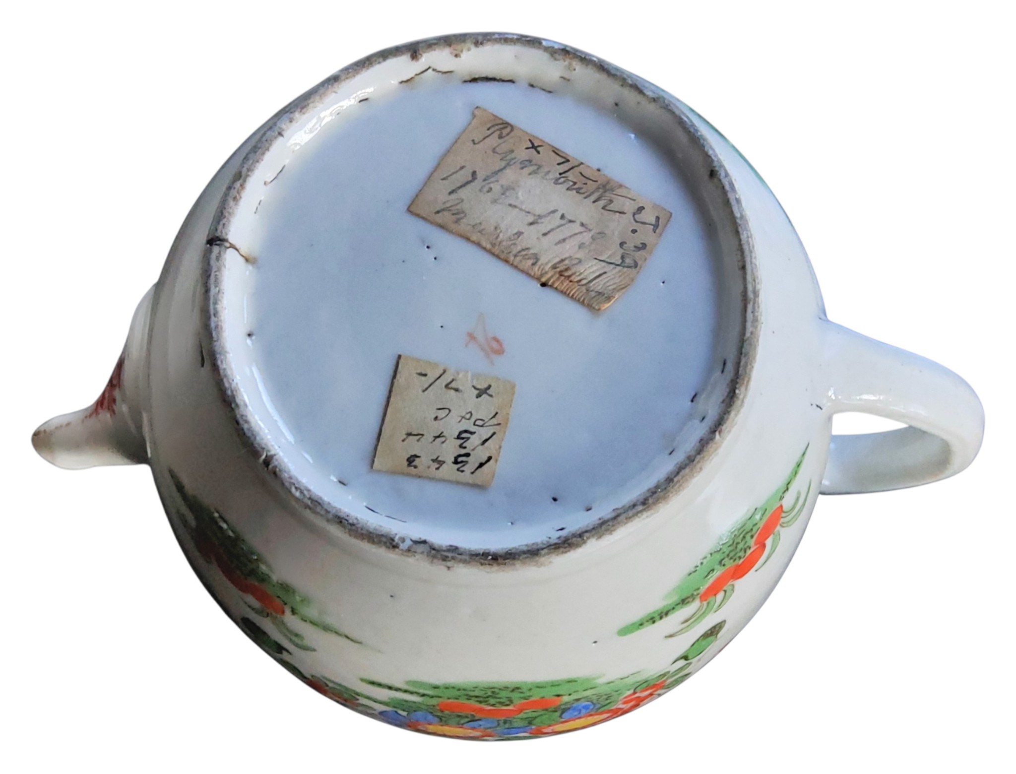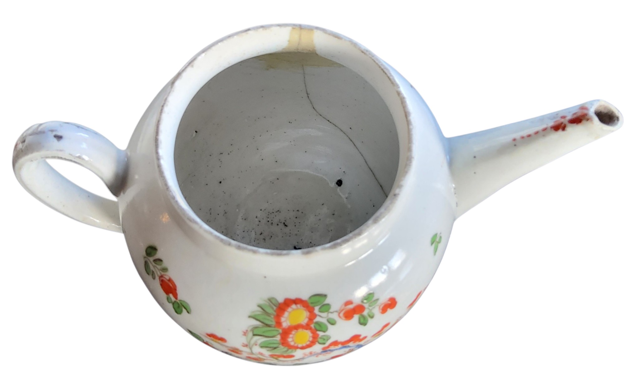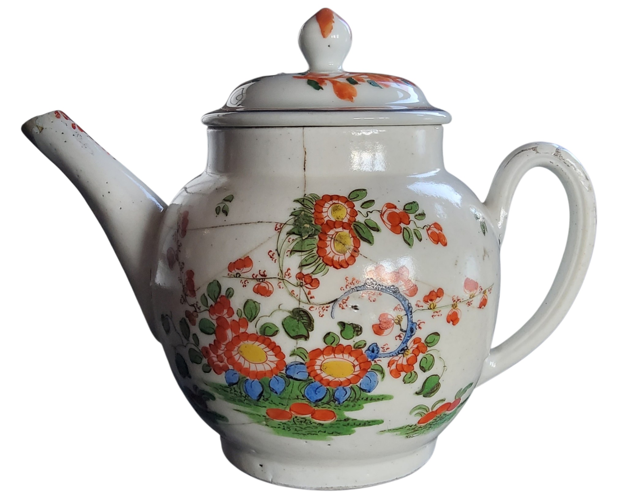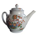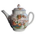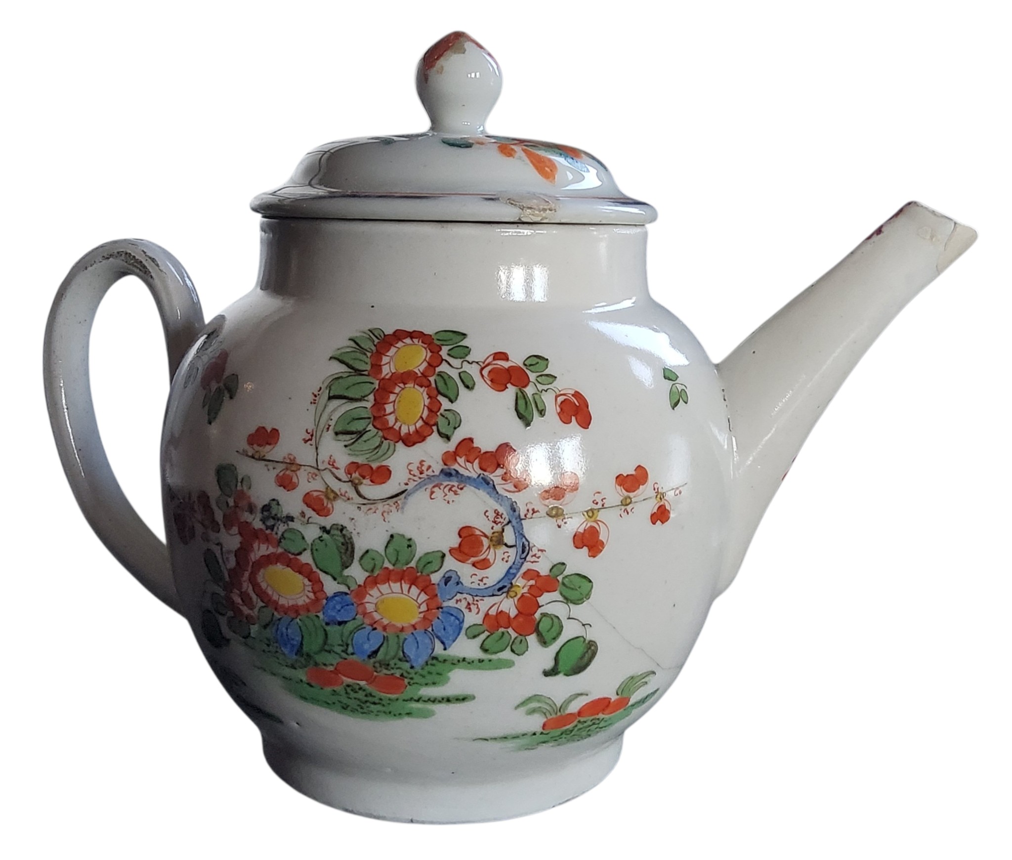 A Plymouth teapot, brightly decorated wtih stylised flowers and foliage, associated Chinese cover, 14cm high, 1768-1770