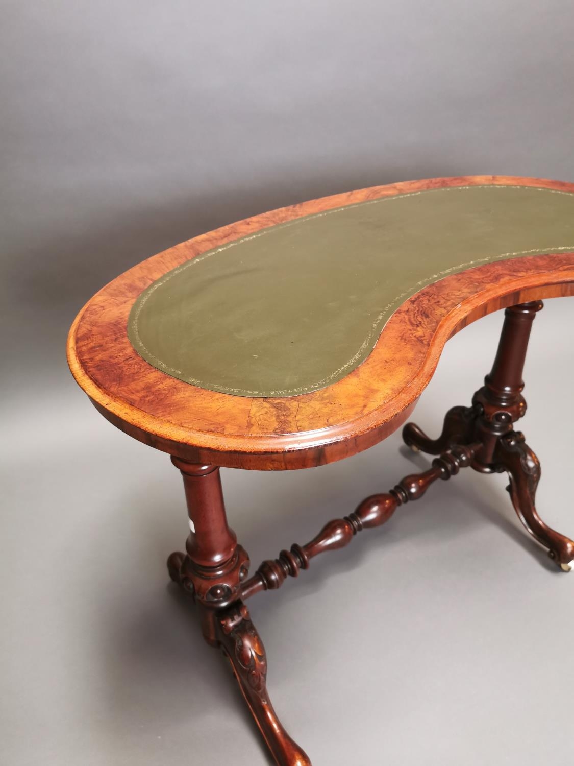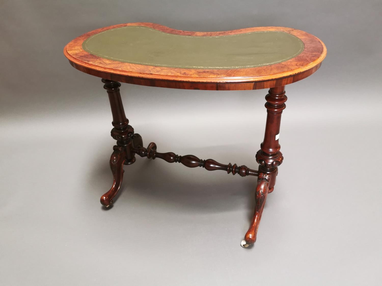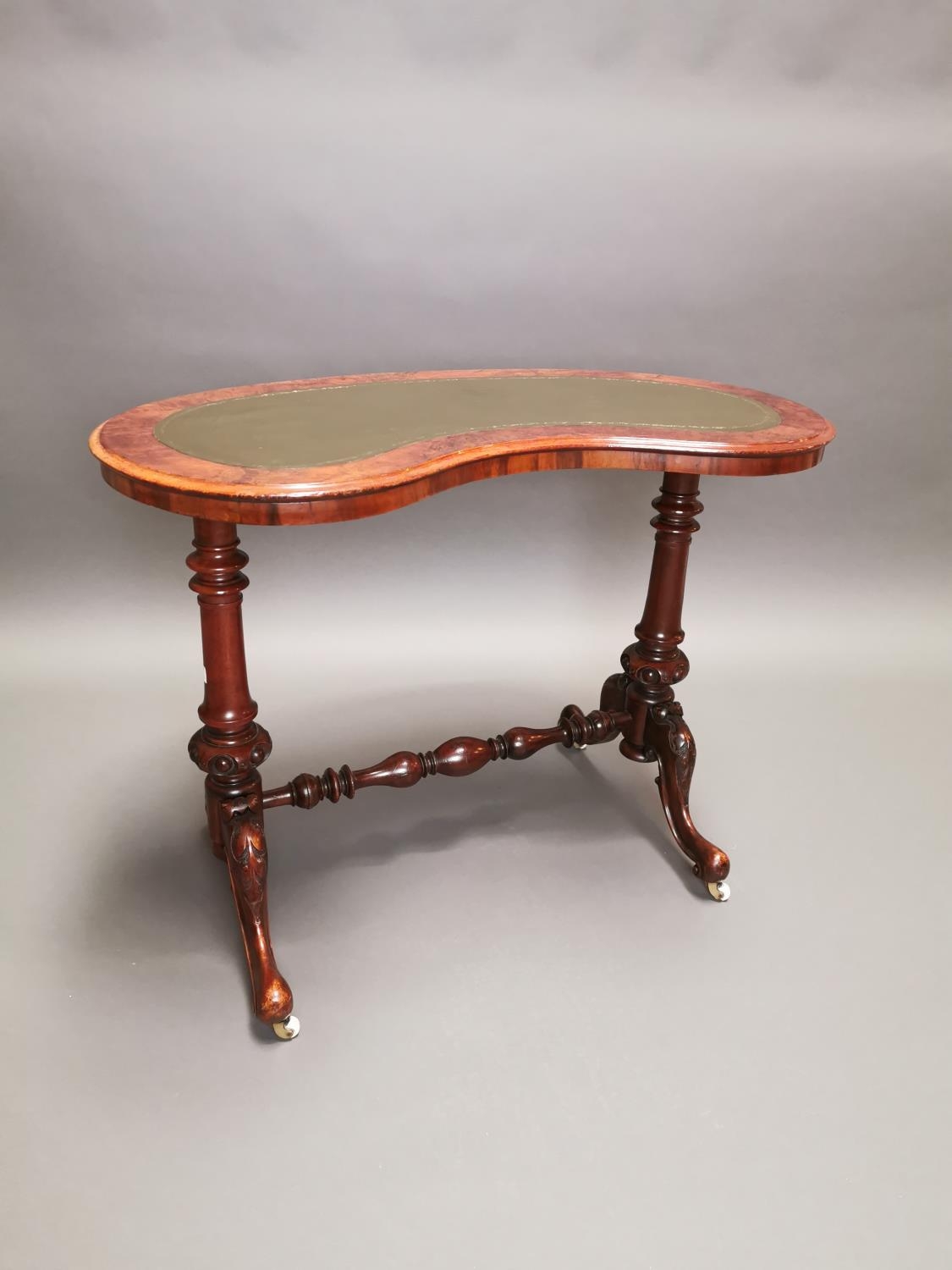19th C. walnut and mahogany kidney shaped desk with inset leather top on carved supports and single stretcher {70 cm H x 92 cm W x 50 cm D}.