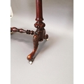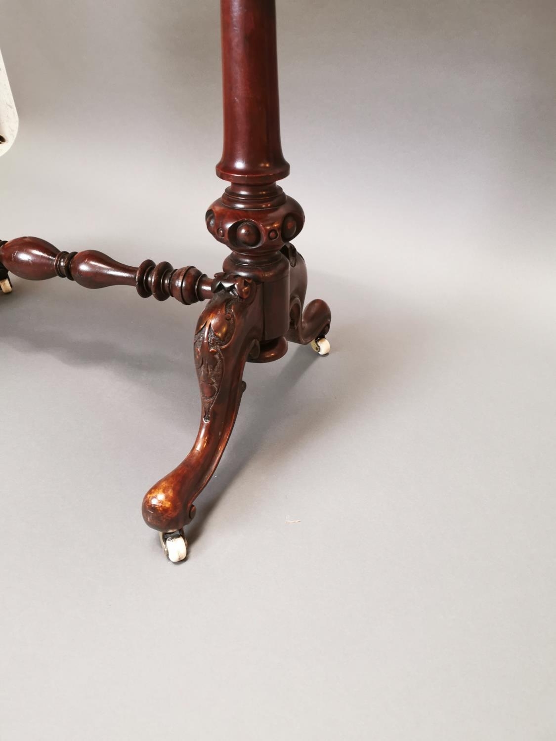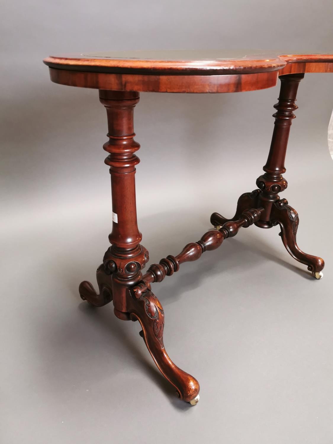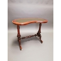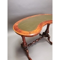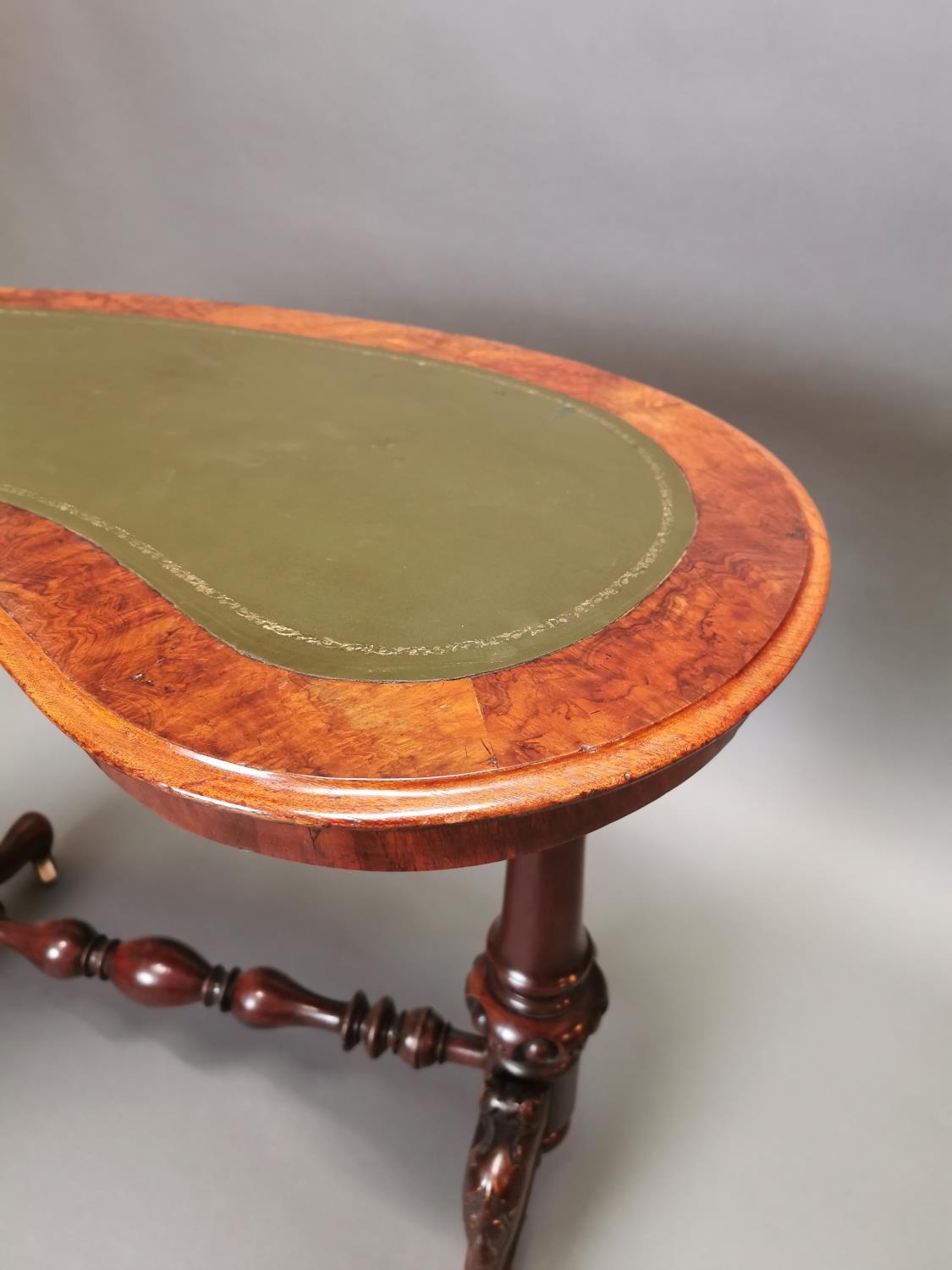 19th C. walnut and mahogany kidney shaped desk with inset leather top on carved supports and single stretcher {70 cm H x 92 cm W x 50 cm D}.