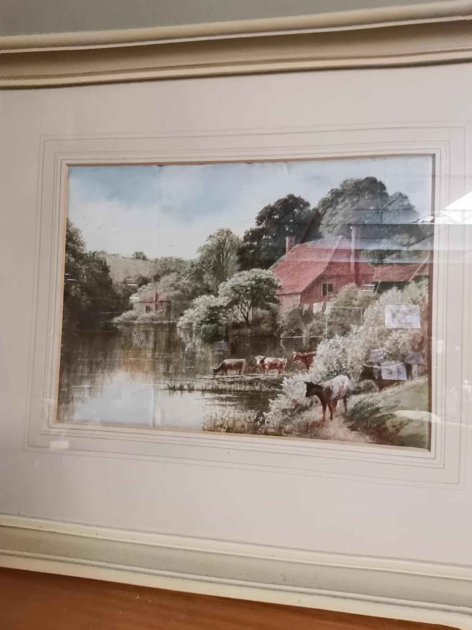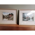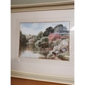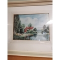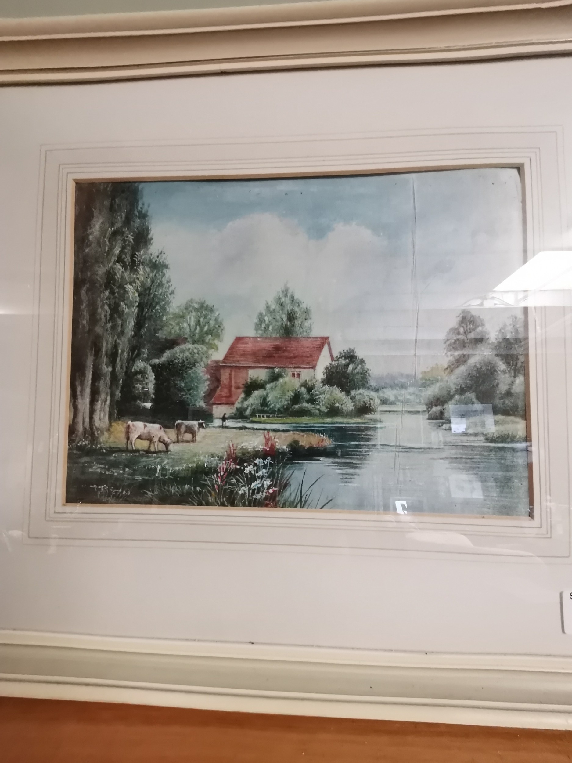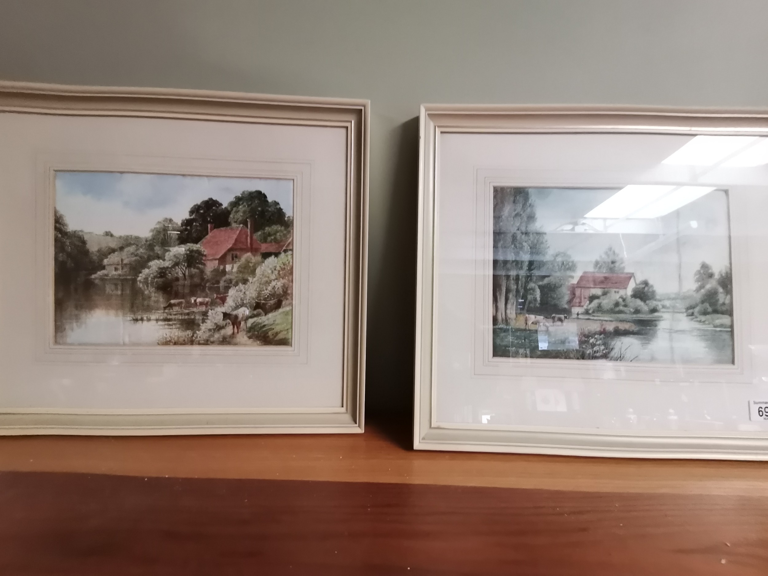 A Pair of Framed watercolours depicting a rural waterscape with mill 49.5cm x 43cm (in frame) no visible signature