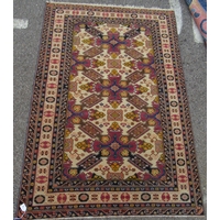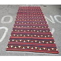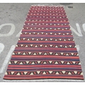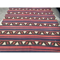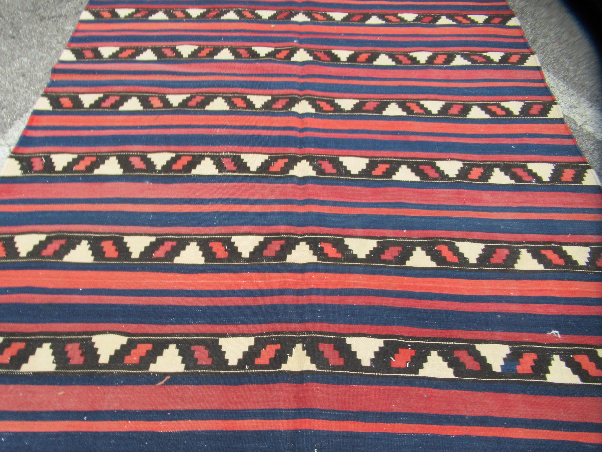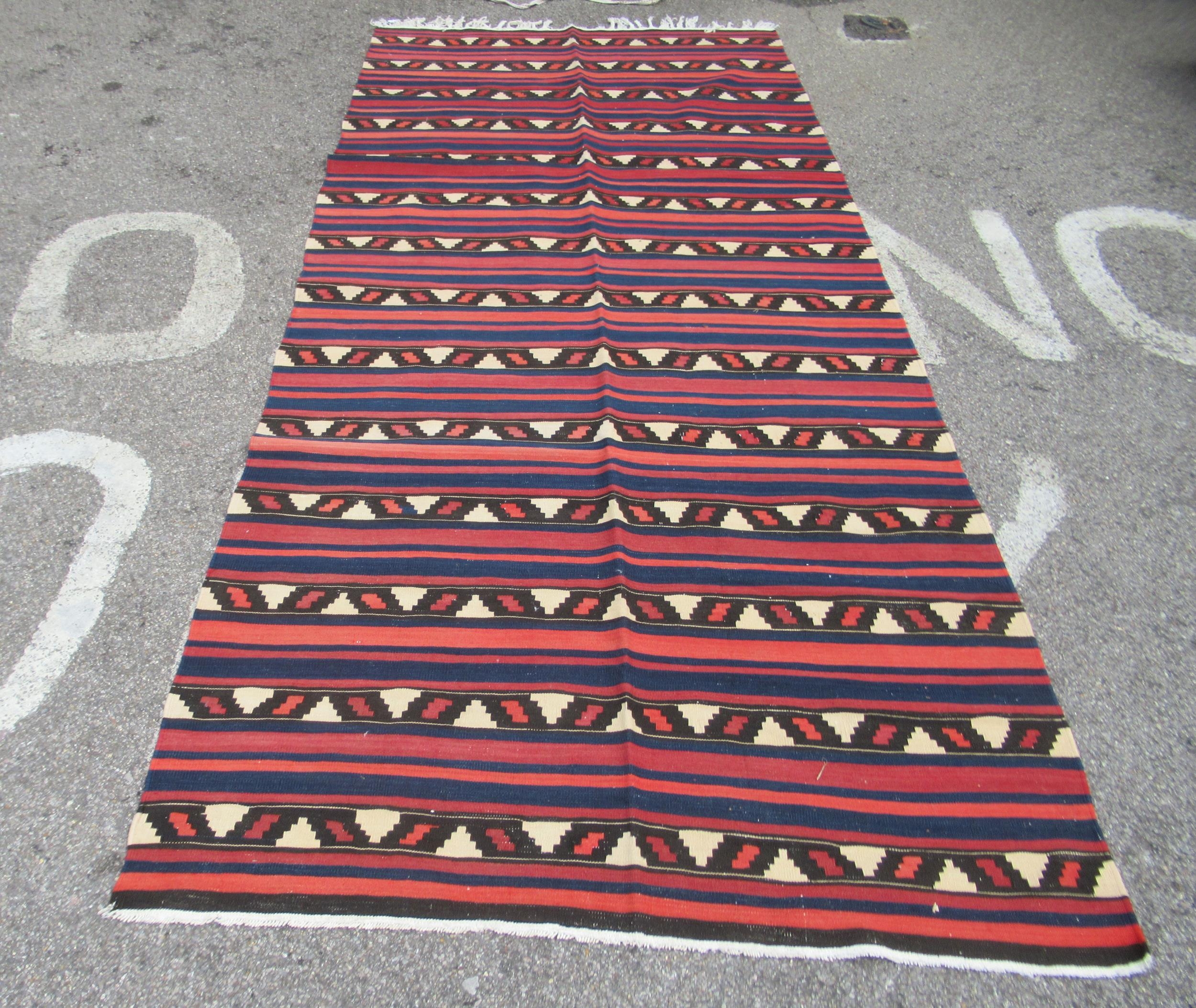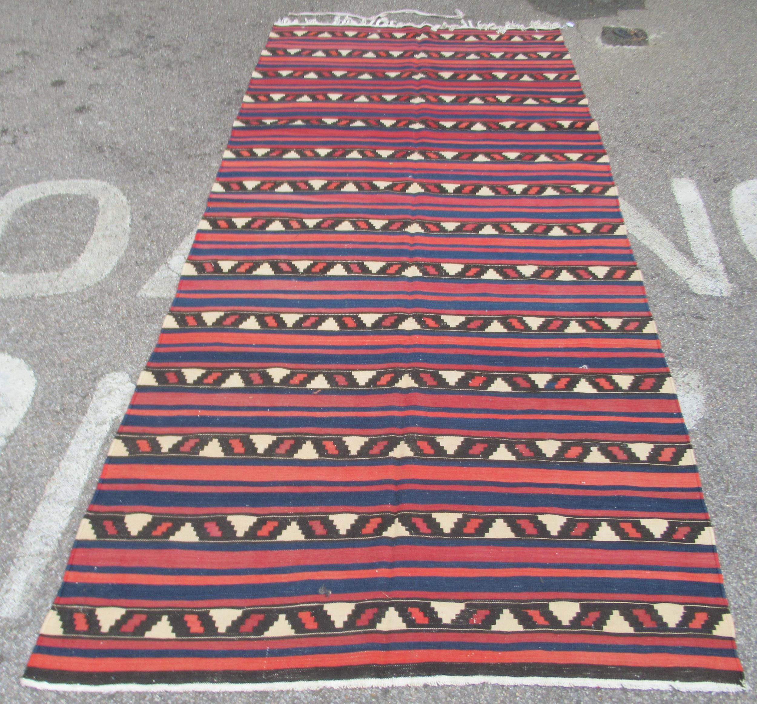 A Kelim rug, decorated with repeating bands of colours and stylised design, on a multi-coloured ground 60" x 133"