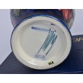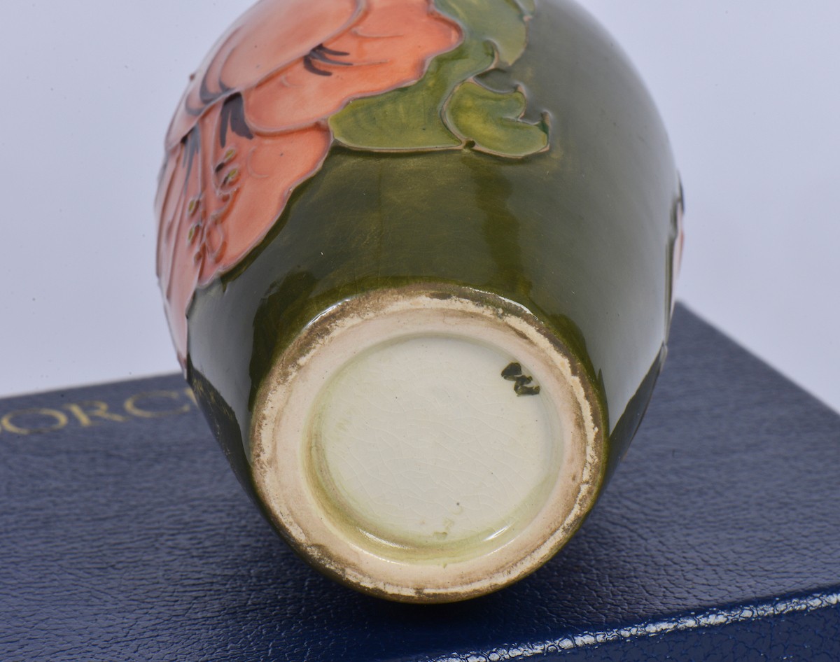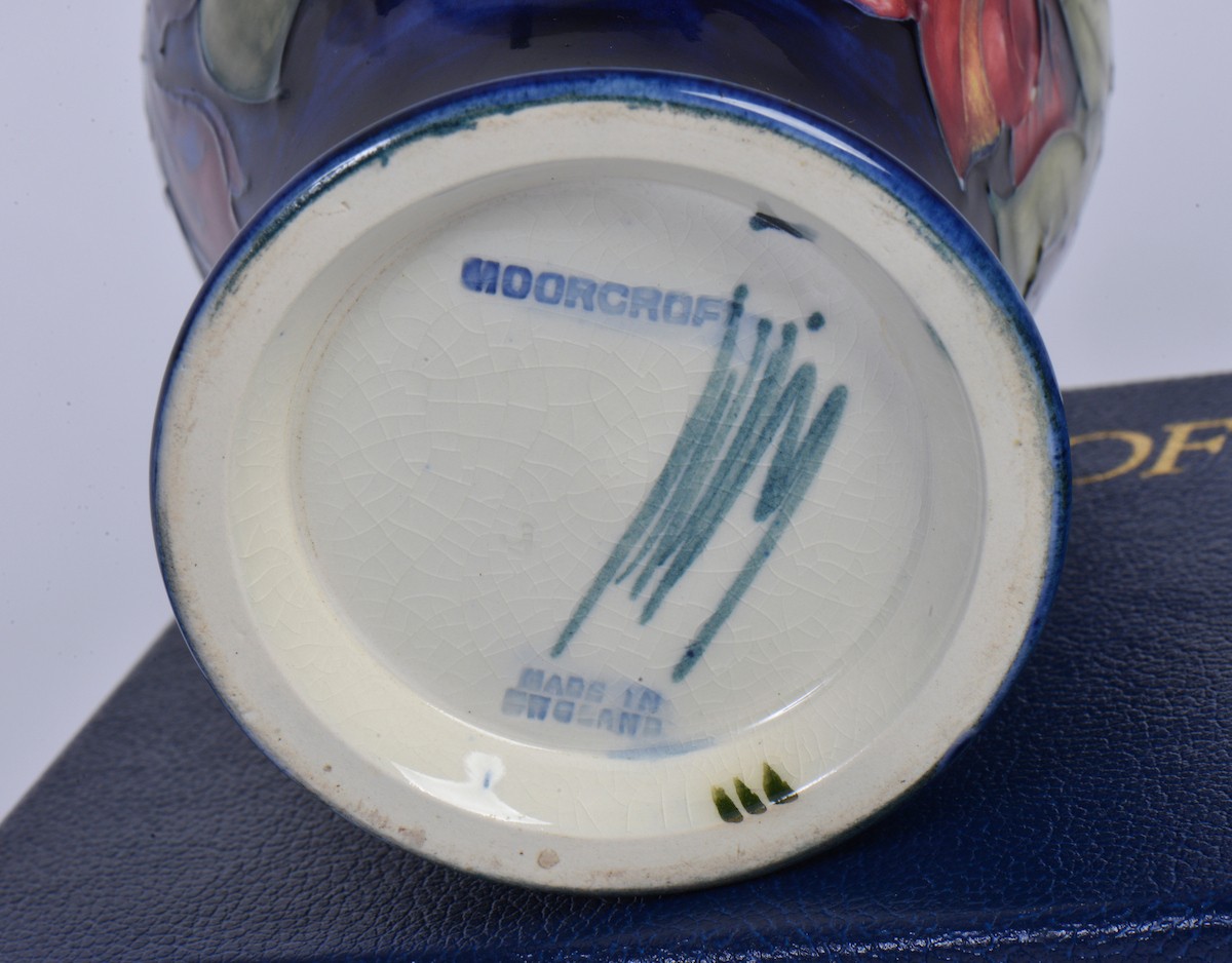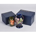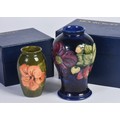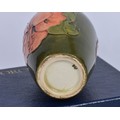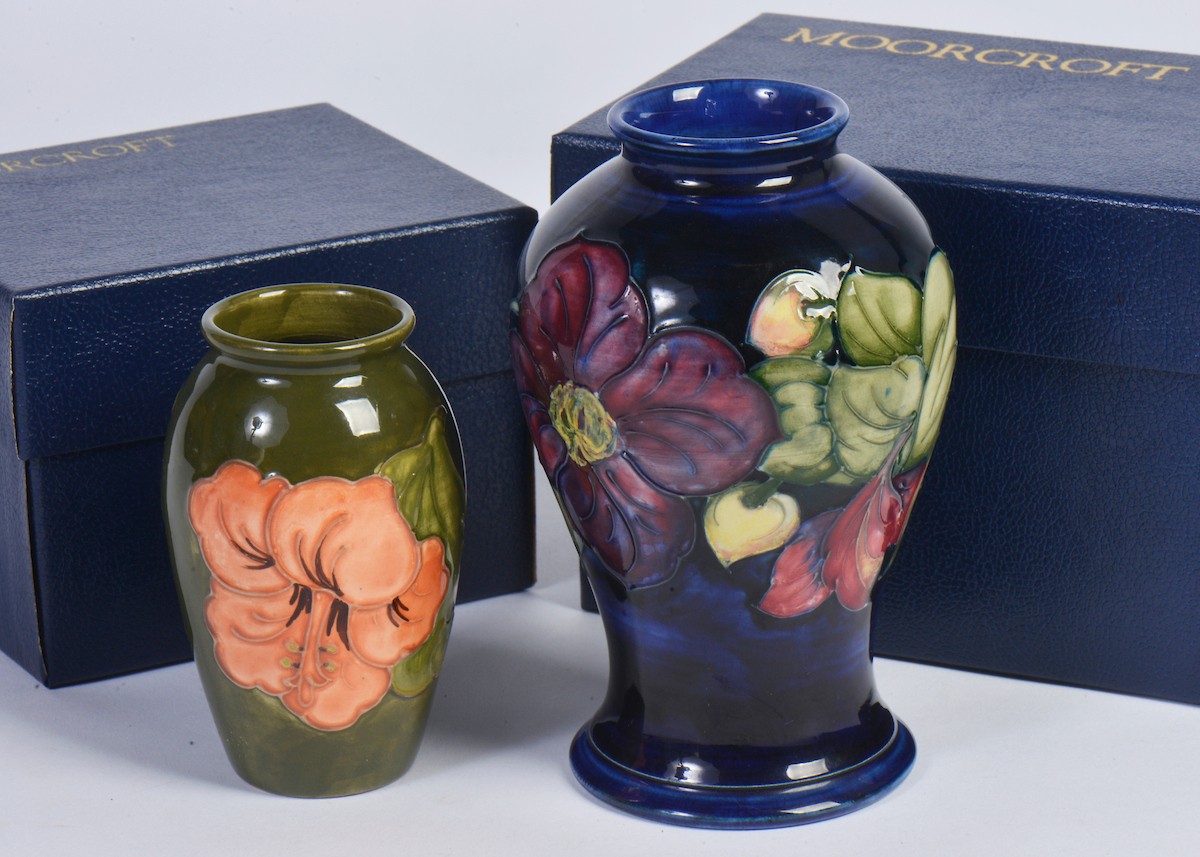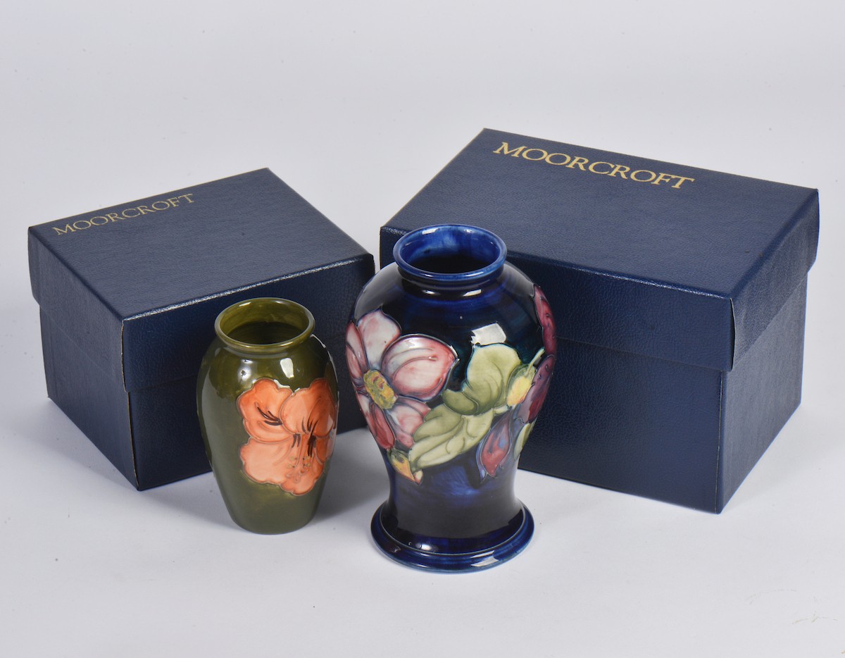 A Boxed "Moorcroft" Green Ground Vase decorated with Flowers. Measuring: 11cms. Along with a Boxed "Moorcroft" Pottery Vase in Under Glaze Blue. Measuring: 15cms.