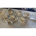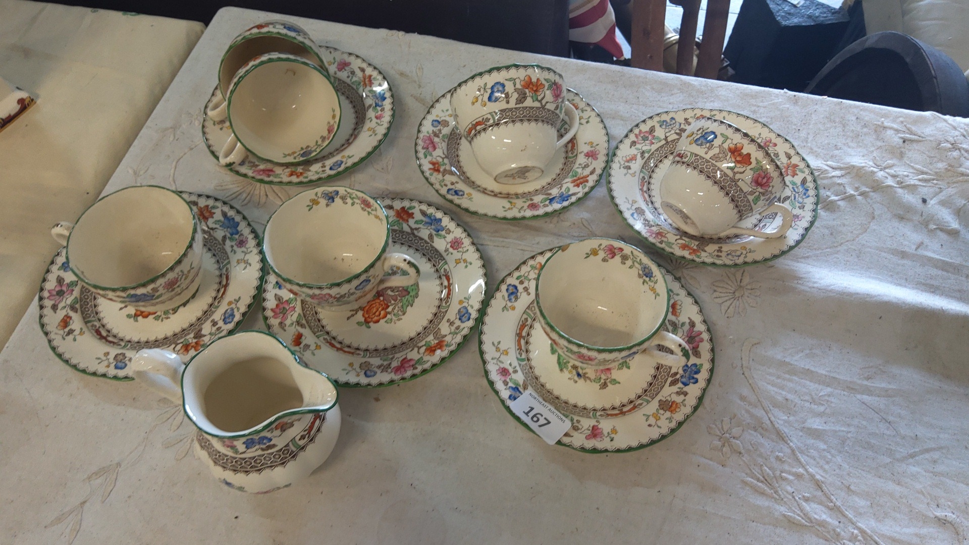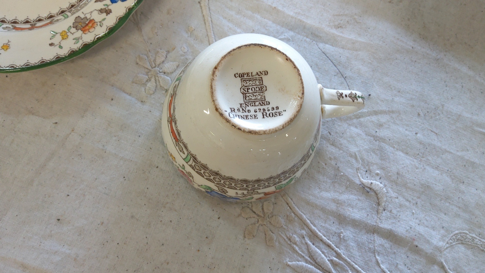 A Copeland Spode ‘Chinese Rose’ bone china part tea service, England—comprising teacups with matching saucers and side plates, and a cream jug; each with polychrome floral sprays and a green-edged rim.(age related marks)