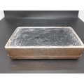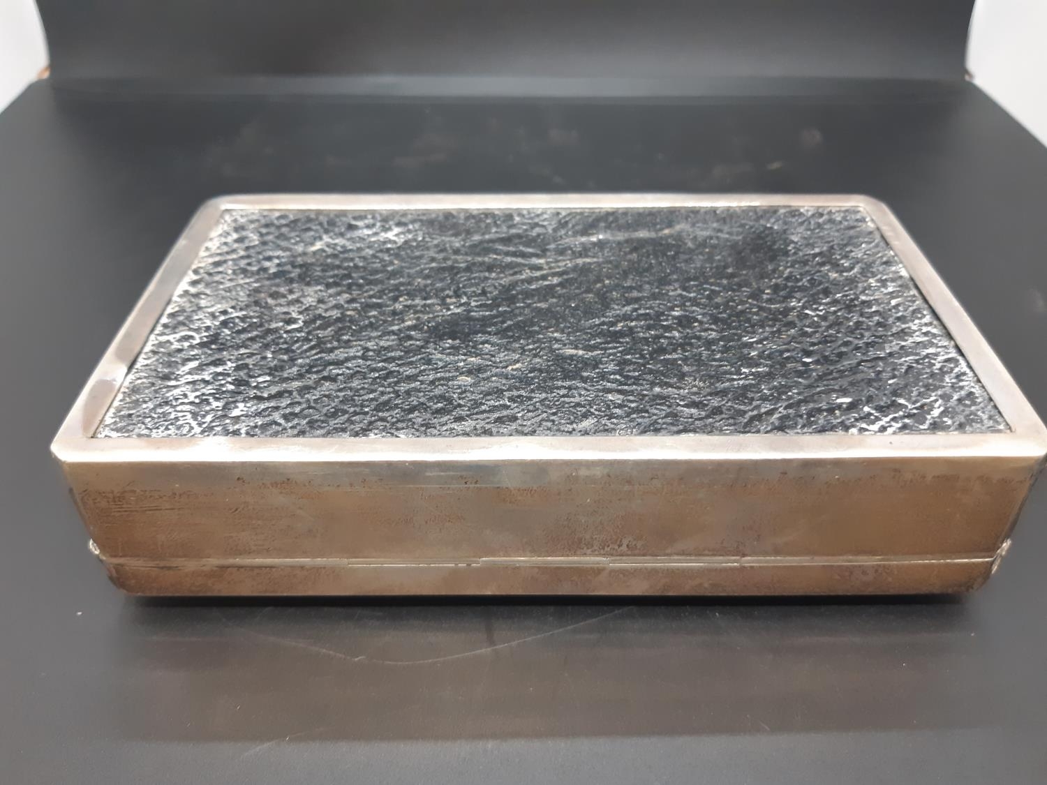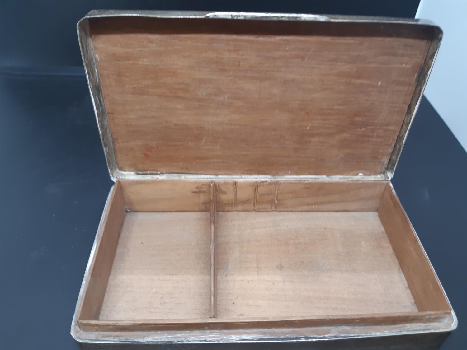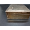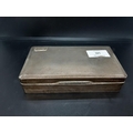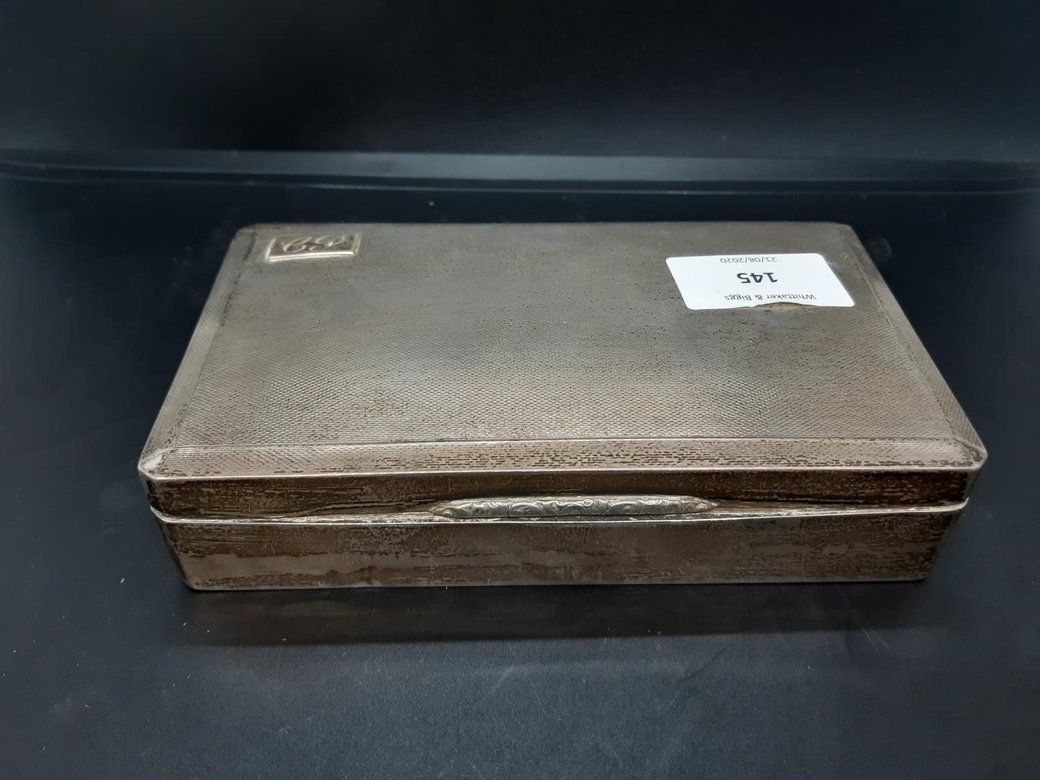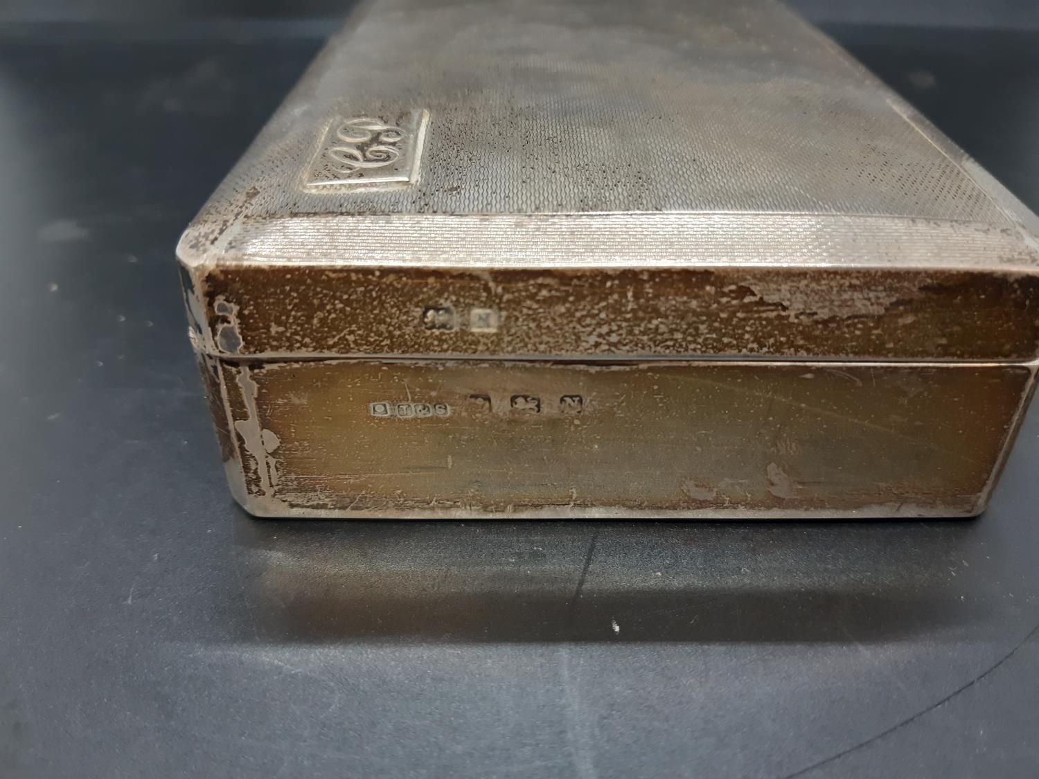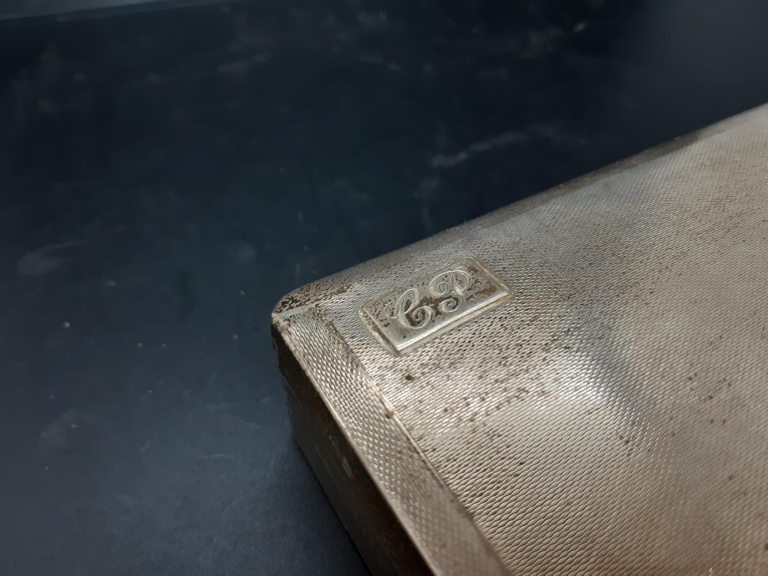 A hallmarked Birmingham silver cigarette box with “EP” initials and engine turned top, dated 1937