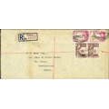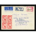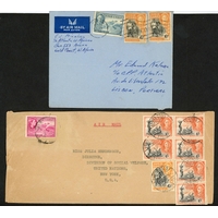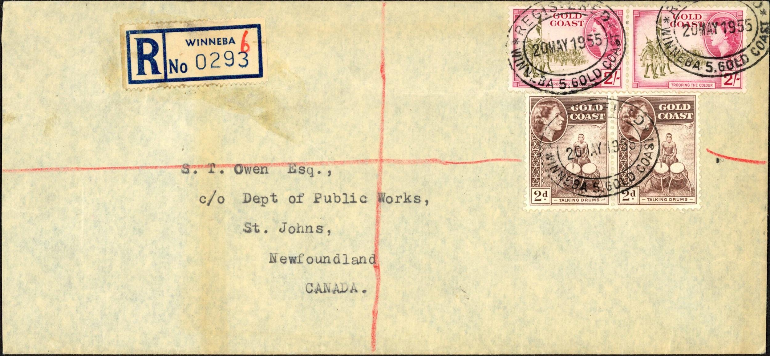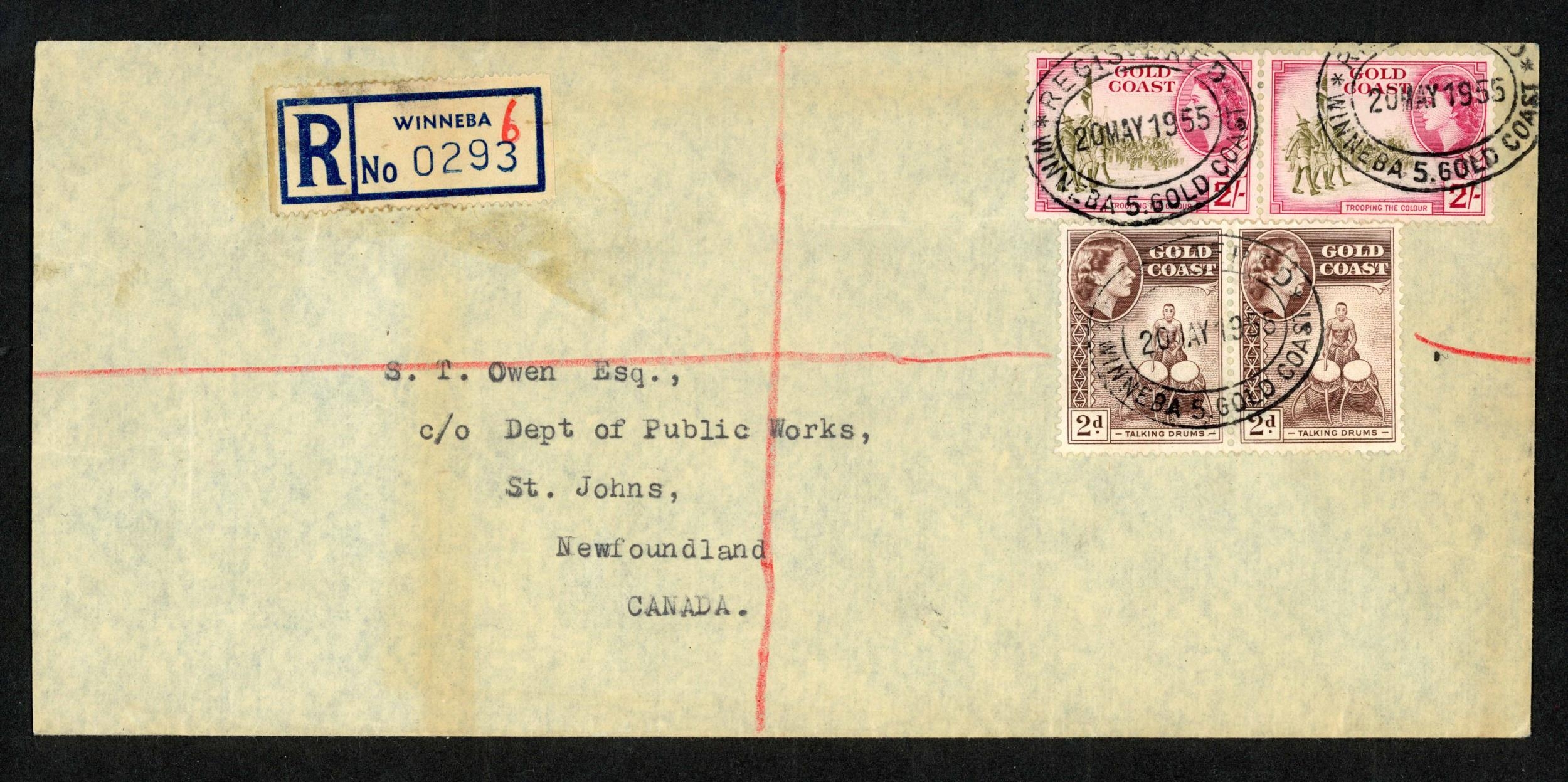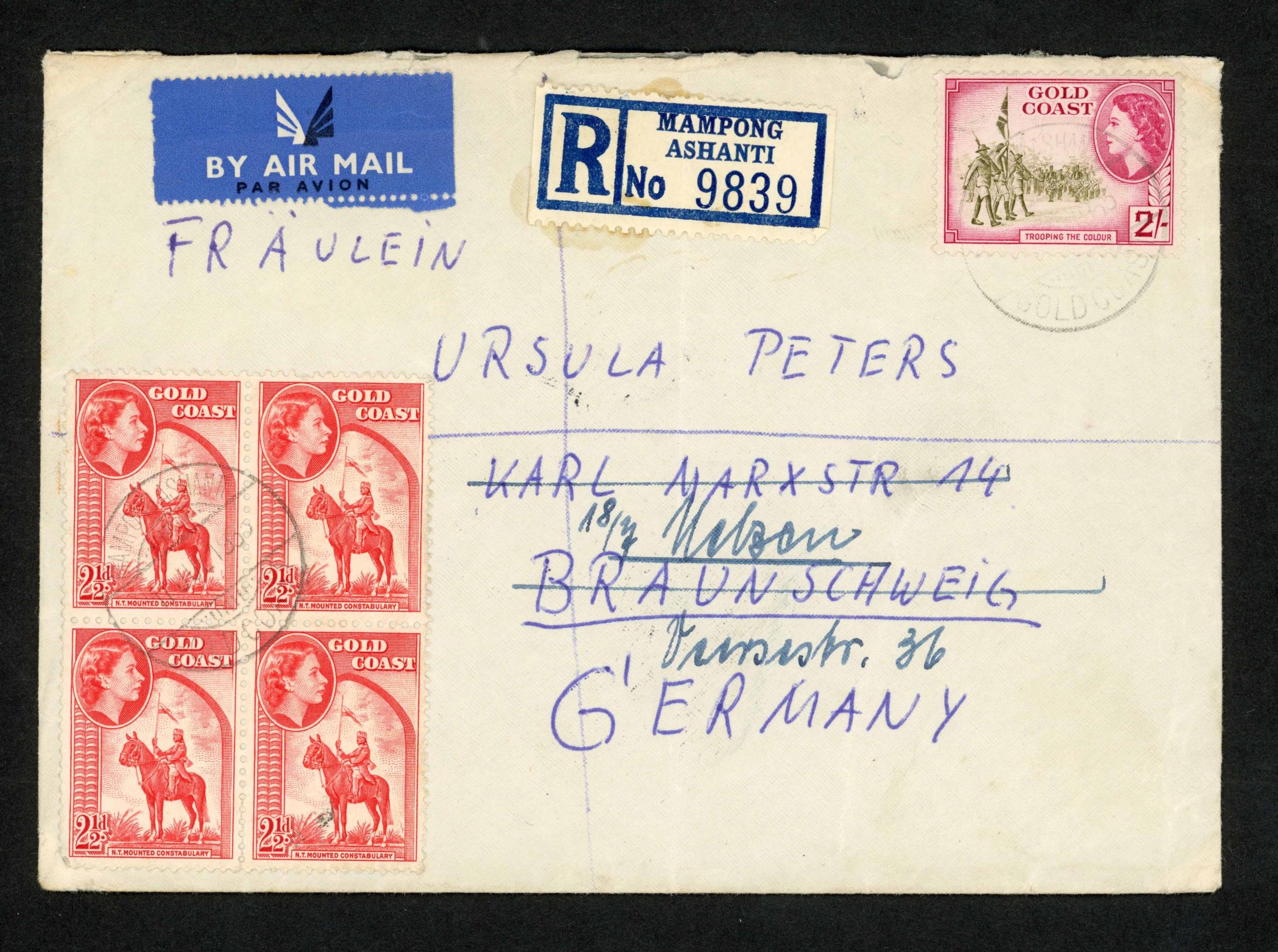 ** QEII PERIOD MAIL; Range to Europe or N.America inc. 1954 airmail env. to USA franked 2/- pair, 6d, 3d & 1d with printed Accra reg. label, 1955 env. to Canada franked 2/- pair + 2d pair tied by Winnera oval d.s. and matched printed reg. label affixed, 1955 airmail env. to Germany franked 2/- + 2½d block of four with Mampong/Ashanti printed reg. label affixed, 1956 airmail env. to Nuremberg franked 1/-, 4d & 1½d pair tied by oval "BIBIANI REGISTERED" d.s. with blank reg. label affixed with ms. 'BIBIANI', 1956 airmail env. to Manchester franked 1/- (2), 6d, 3d & 1½d with blank reg. label endorsed 'SALAGA' and stamps tied by matched cds.and other related examples. (36 covers)Cross Reference: AIR MAIL COVERS, REGISTERED MAIL
