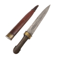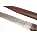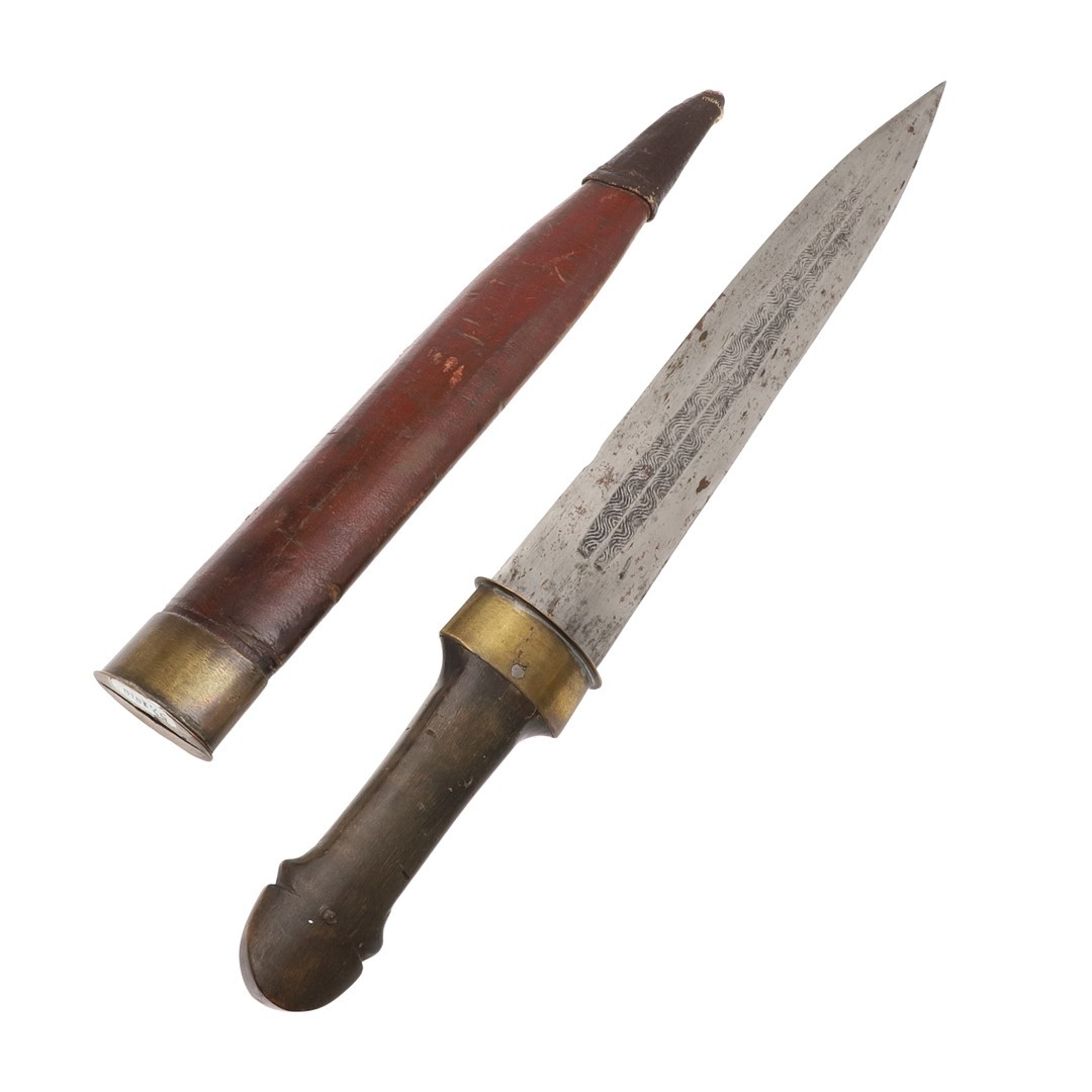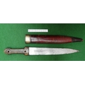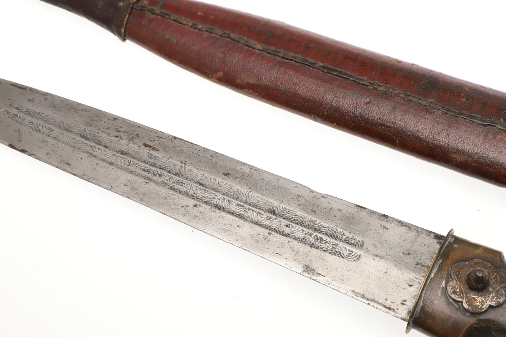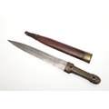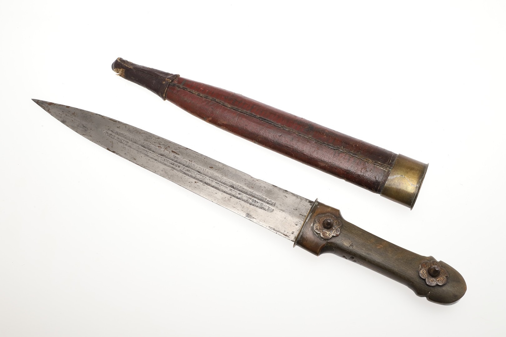 A 19TH CENTURY RUSSIAN KINDJAL KNIFE. The 26.5 cm tapering pointed blade with twin fullers to the centre, the fullers decoratively etched to the inner surfaces. On a horn handle of traditional waisted form with decorative fixings. In a red leather and brass scabbard. 41.5 cm.