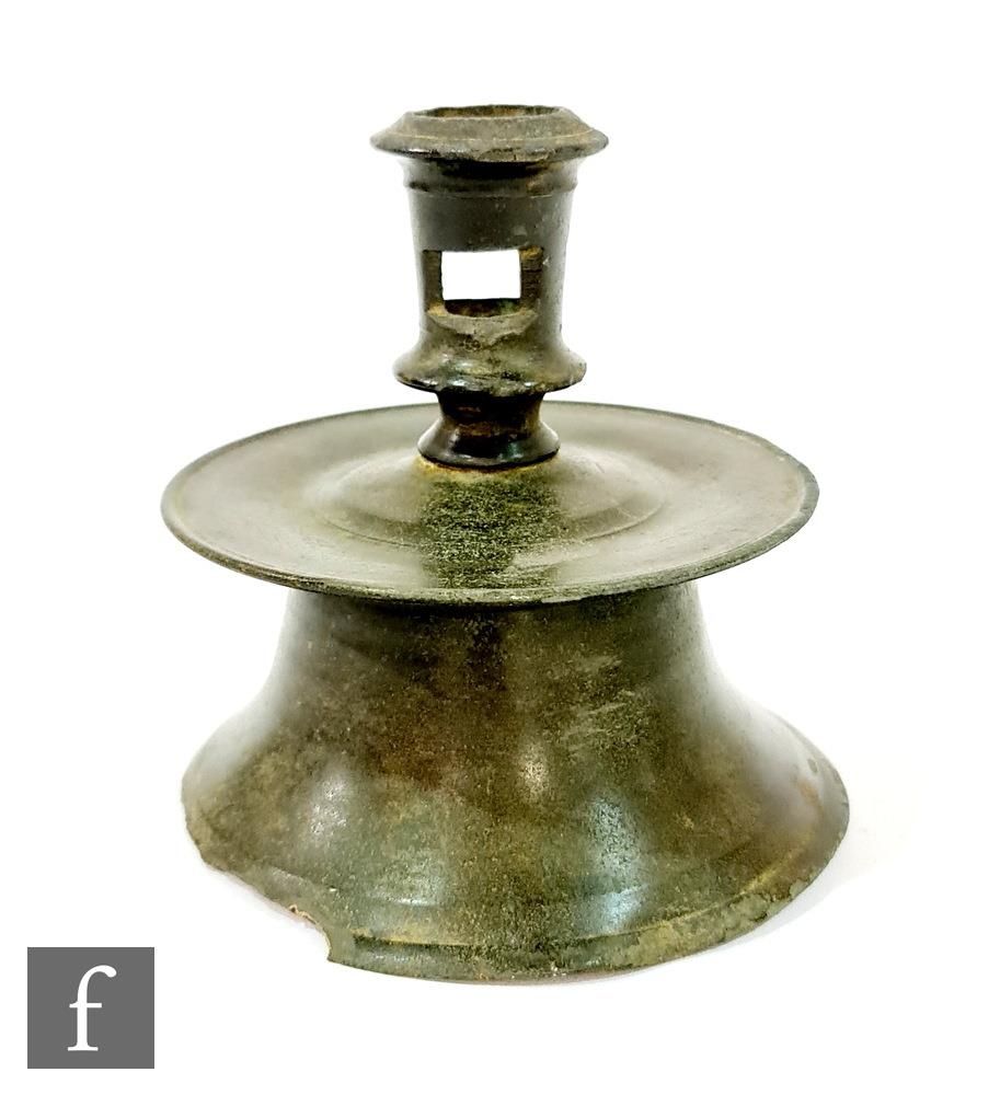 A Tudor period medieval bronze circular candlestick, circa 1450 - 1600, flat dished sconce over a spreading base, no snuffer, height 13cm, A/F.