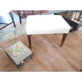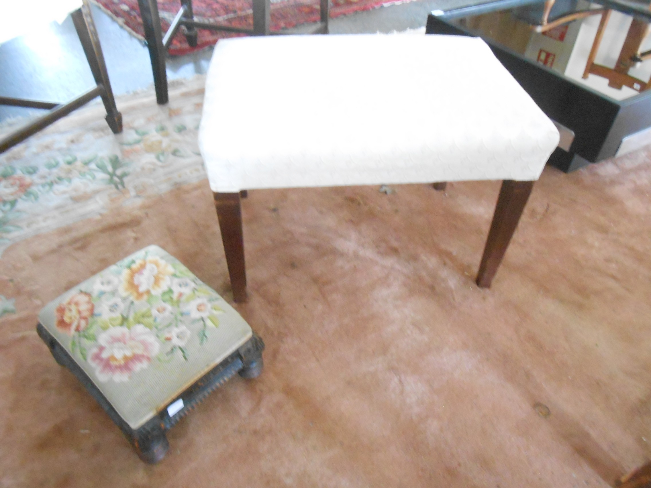 A dressing stool with tapestry seat, on mahogany tapering legs and a small Victorian carved oak footstool with tapestry seat