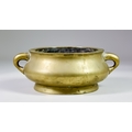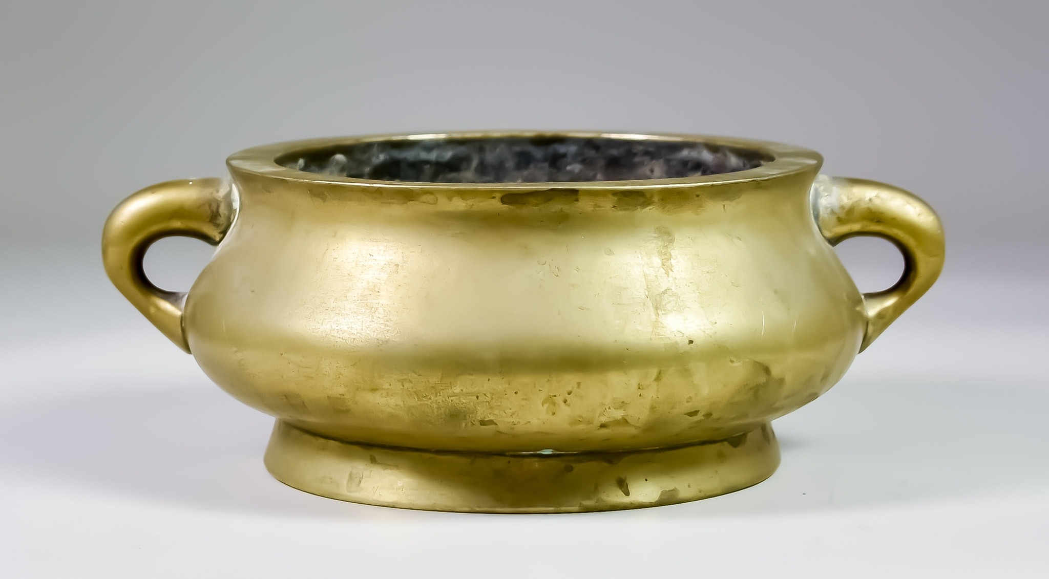 A Chinese Bronze Circular Two-Handled Censer, Gui, of archaistic form, 6.25ins (15.9cm) diameter x 3.25ins (8.3cm) high, the base cast with an apocryphal six-character mark of Xuande within a rectangular cartouche