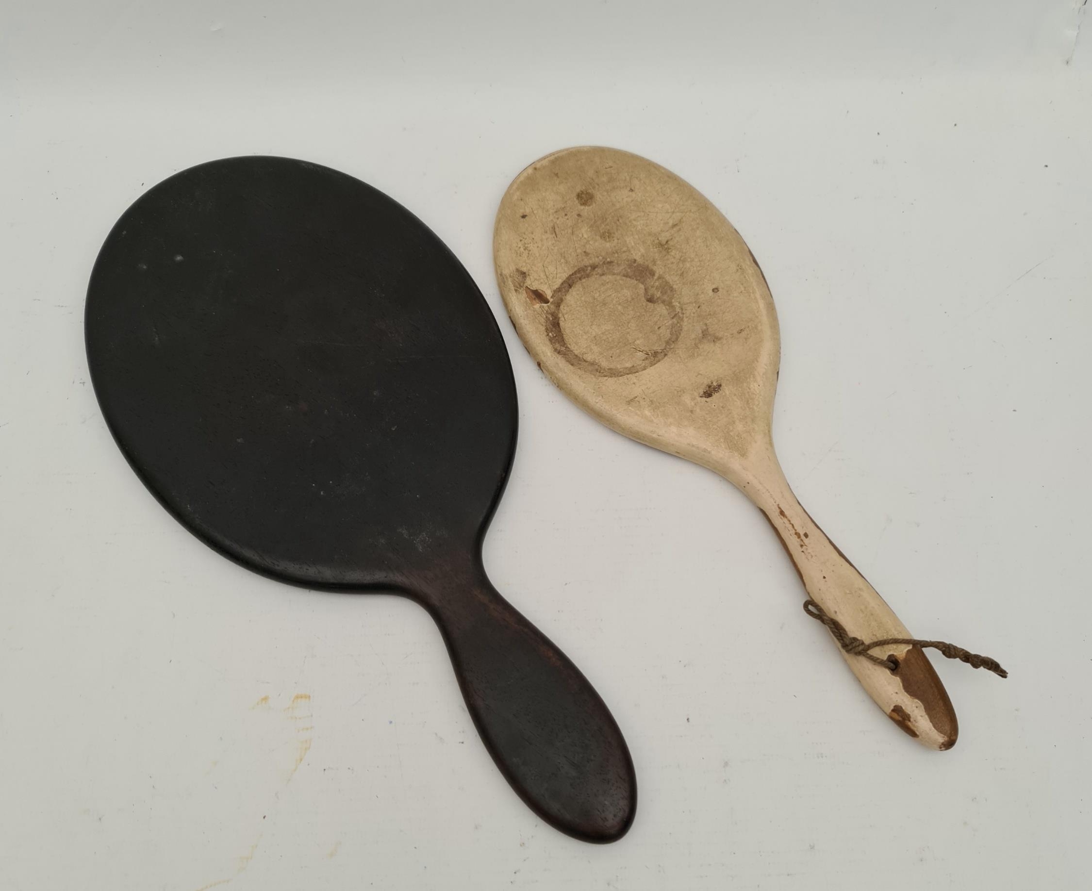 Antique Hand Mirrors One Ebony With Bevelled Glass One Painted Pine With Bevelled Glass. The Ebony one measures 12 inches long by 6 inches wide. Shipping is available. Please ask for a quote before bidding. Where possible we combine shipping costs. Remember, if you are the highest bidder above reserve on this Lot you have bought the item and are legally responsible for the item. Viewing is recommended in either person or via video link. Contact us to arrange.