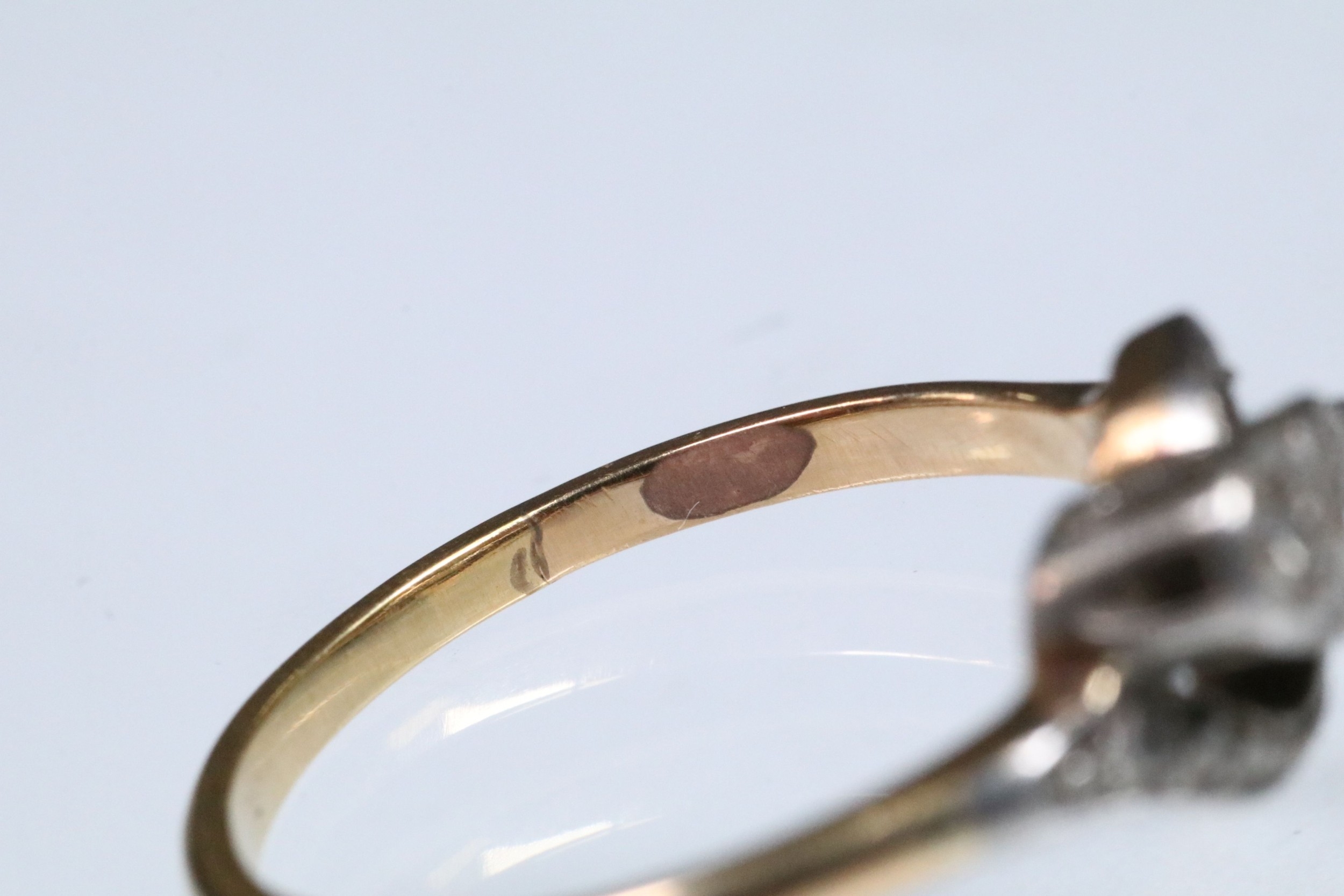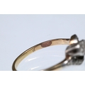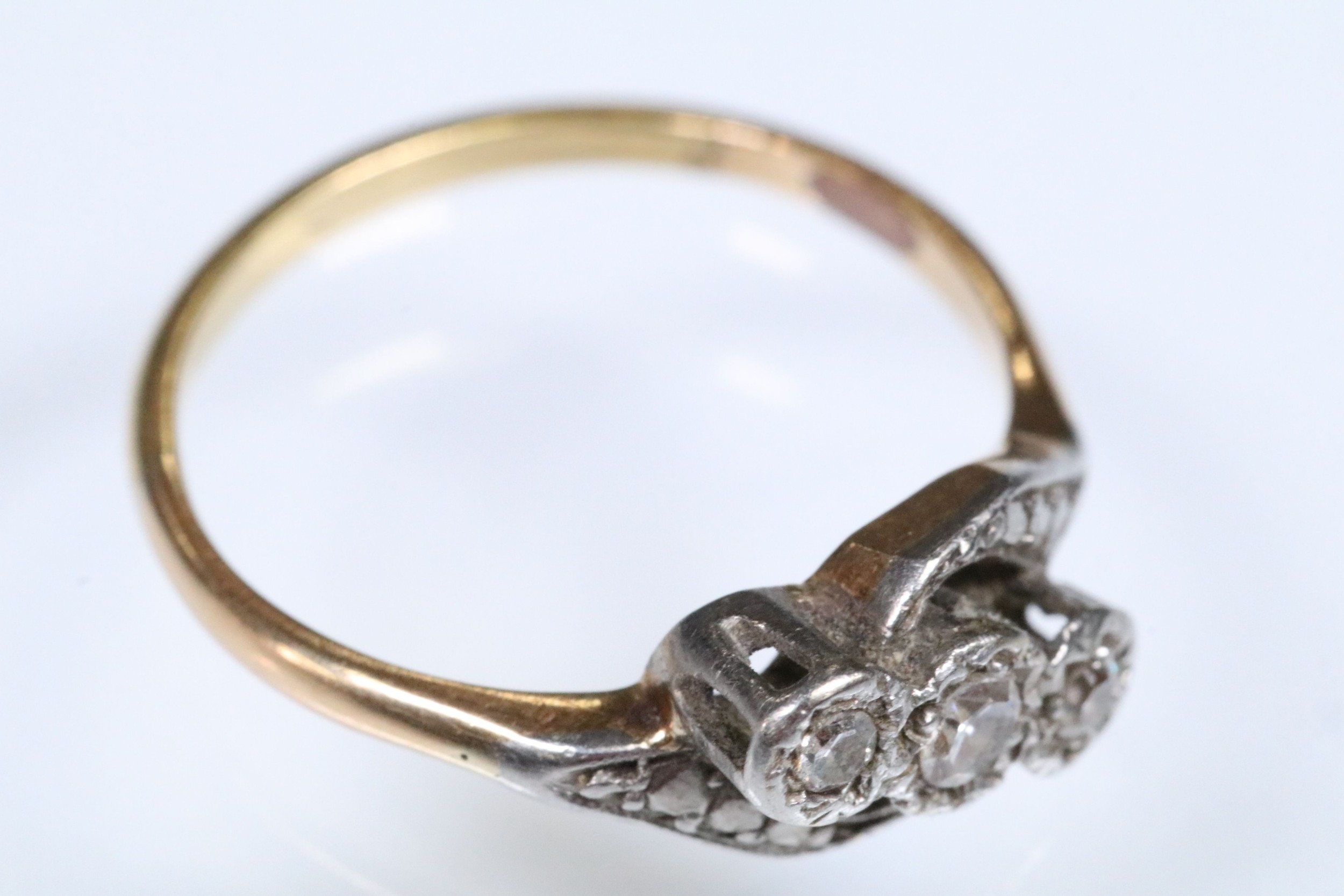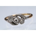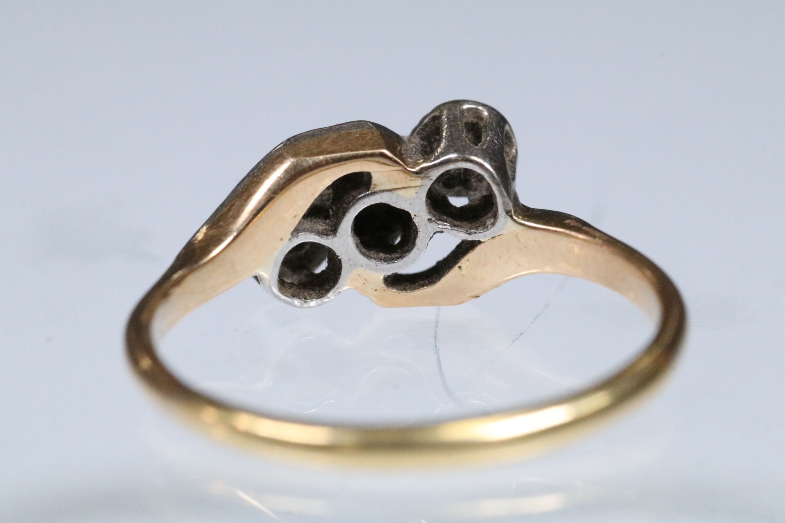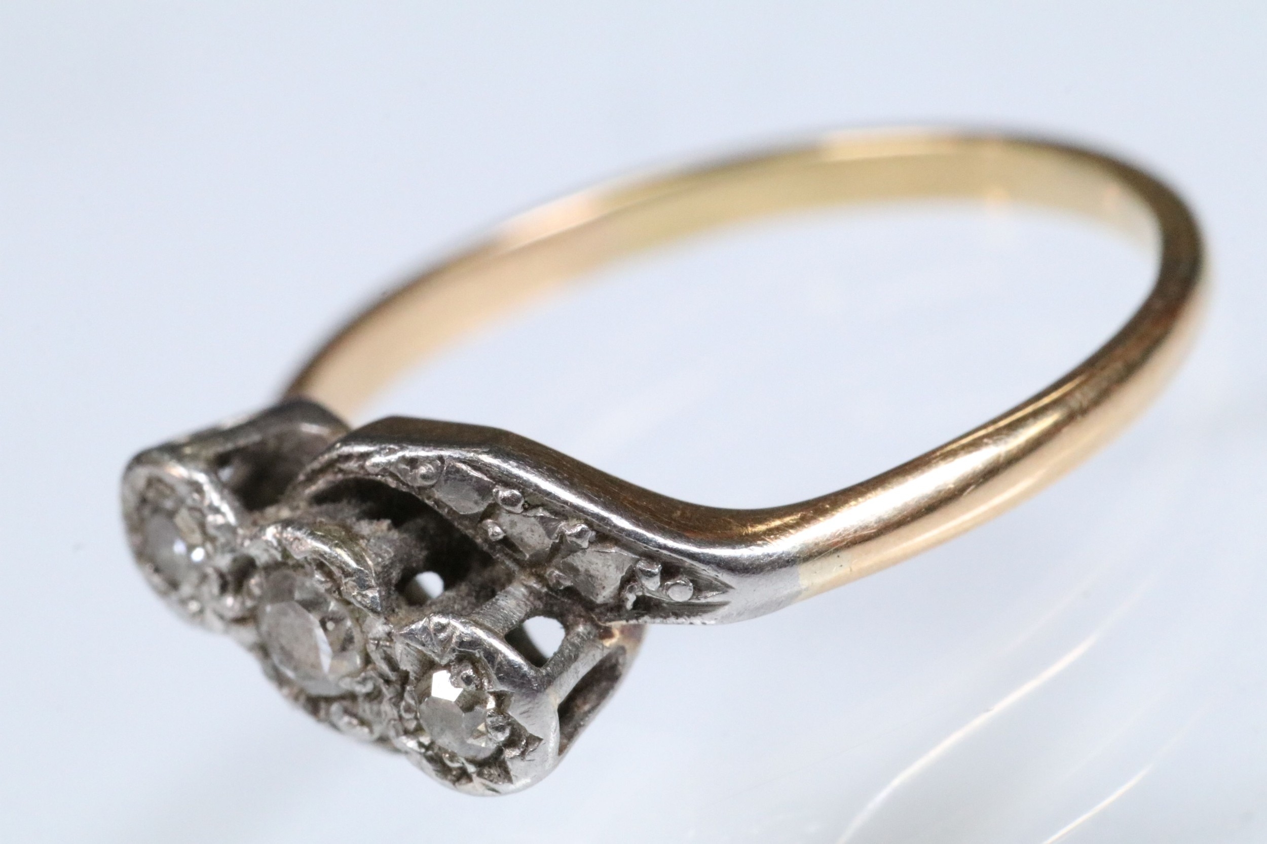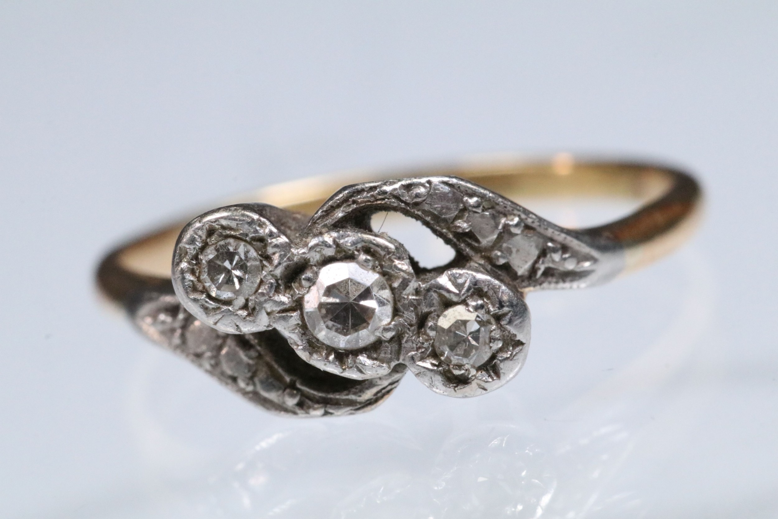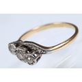 Early 20th Century three stone diamond ring with a cross over setting. Unmarked, tests indicate 18ct gold. Size L.5.