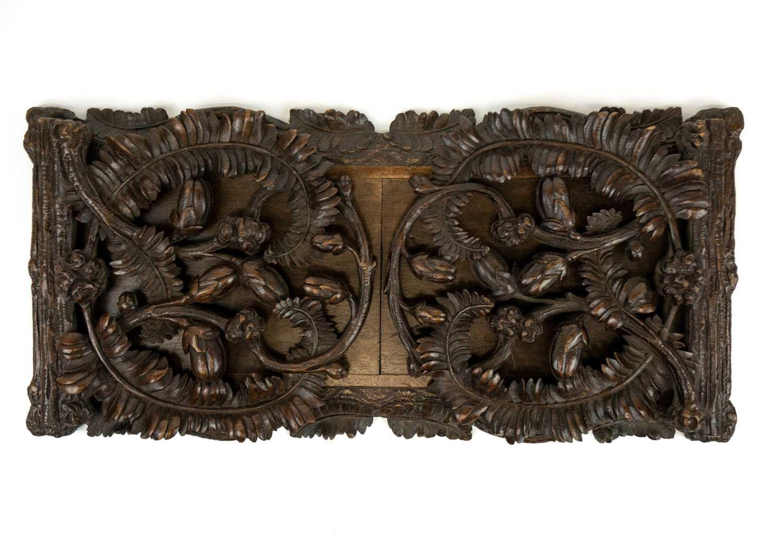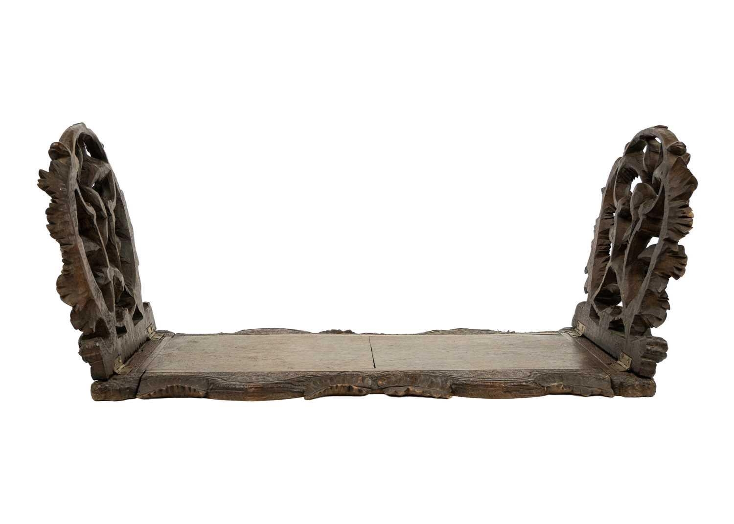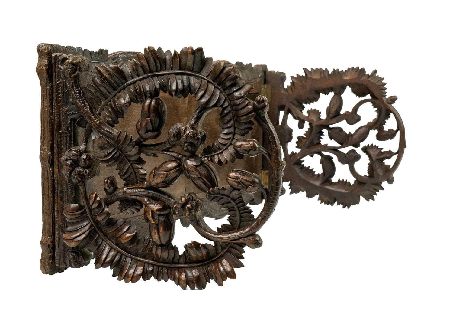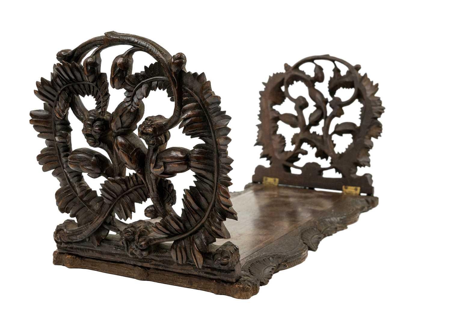 A late 19th century Black Forest book slide. The pierced carved ends decorated with fern leaves and fruit, unextended length 44cm. Small chips to extremities of fern decoration images of affected areas online. No obvious breaks or repairs.