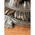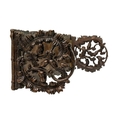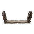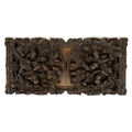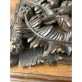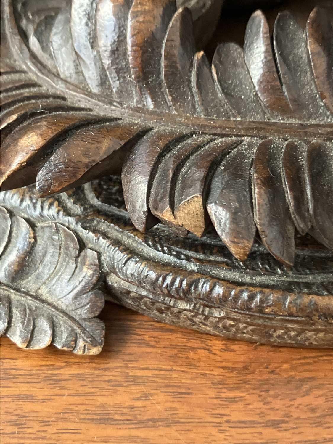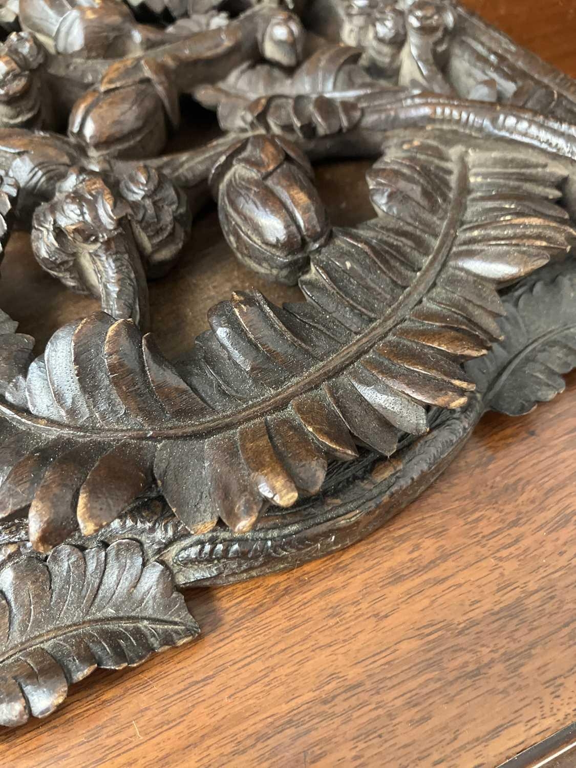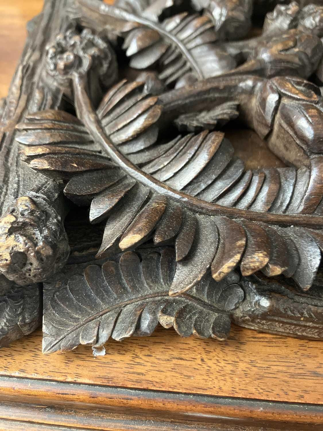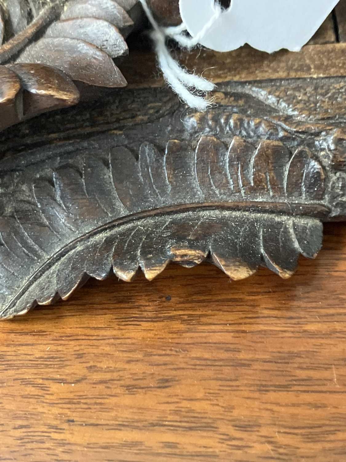A late 19th century Black Forest book slide. The pierced carved ends decorated with fern leaves and fruit, unextended length 44cm. Small chips to extremities of fern decoration images of affected areas online. No obvious breaks or repairs.