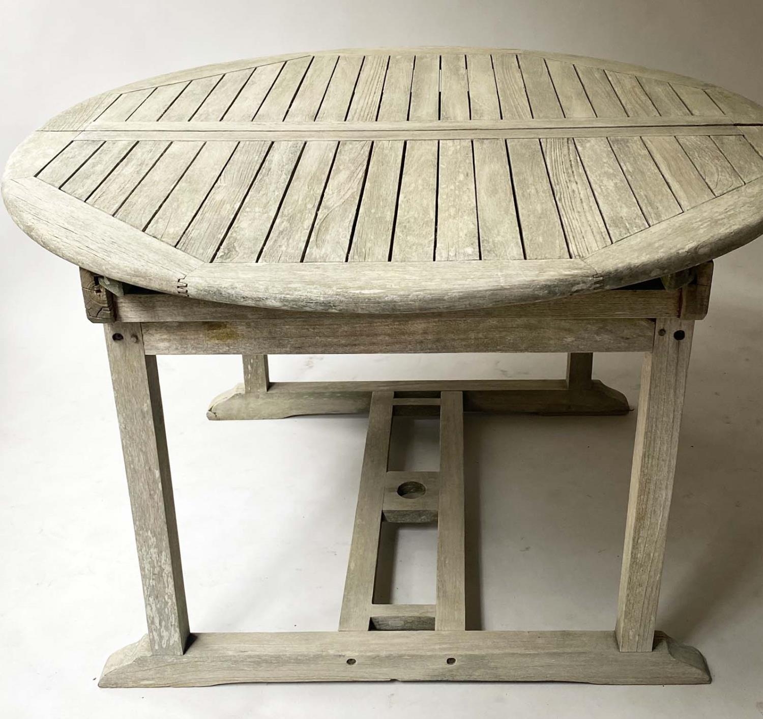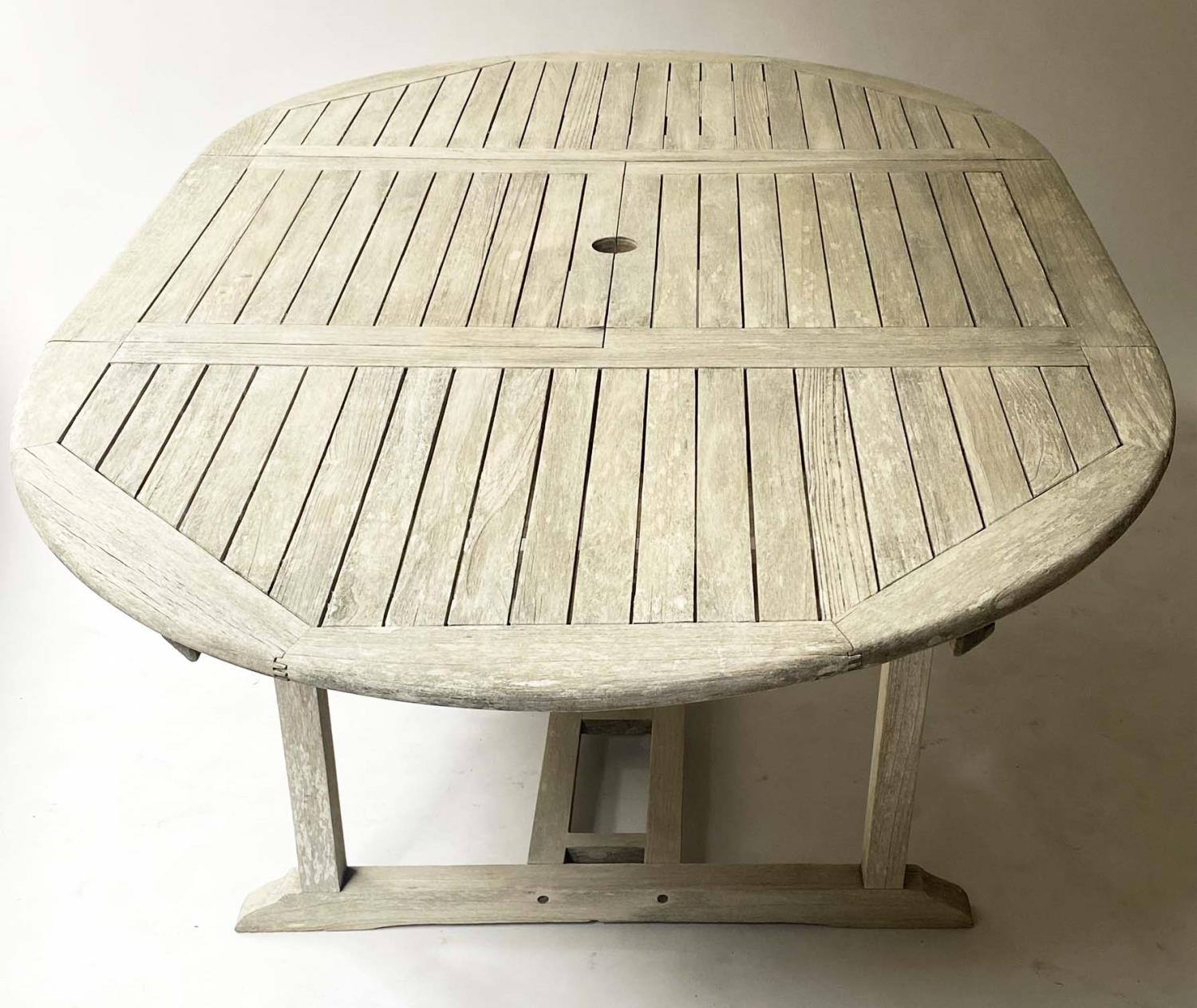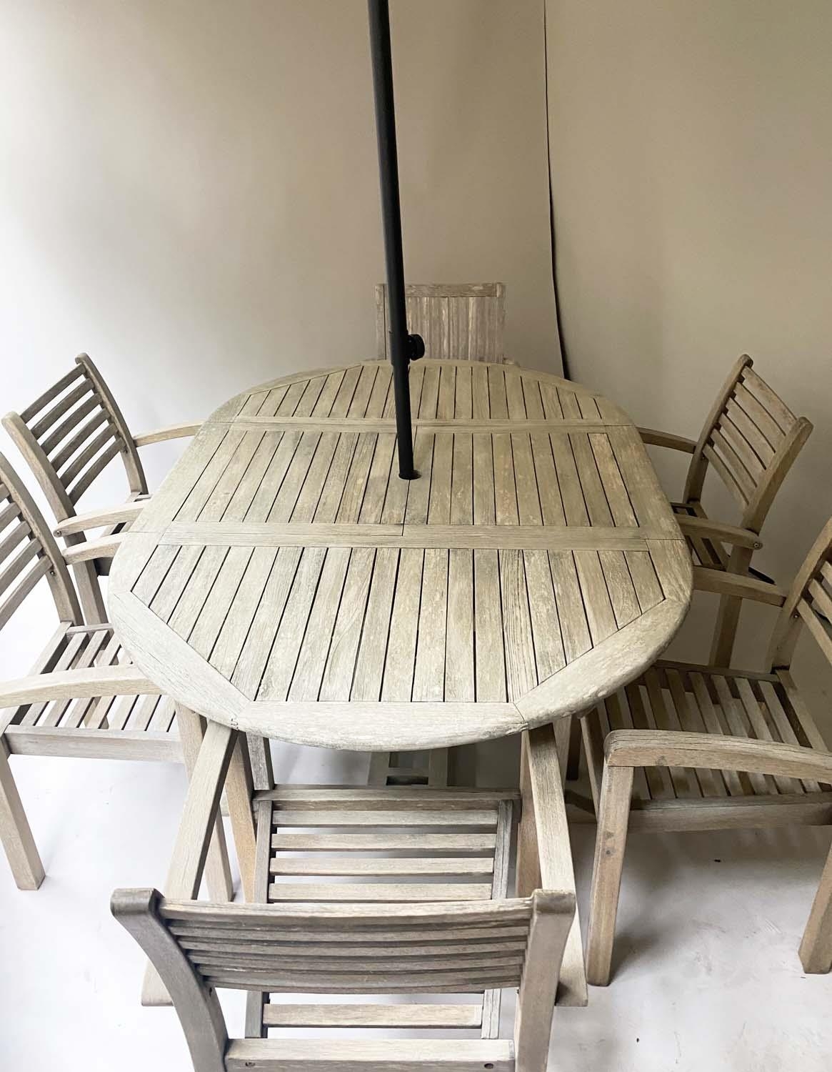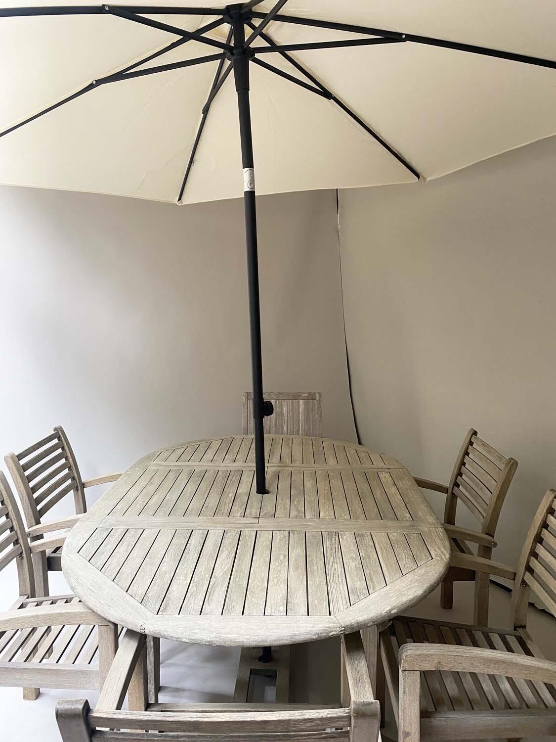 GARDEN SUITE, weathered teak and slatted rounded rectangular table 180cm extended x 119cm x 74cm H with integral foldout leaf with six armchairs and parasol. (8)