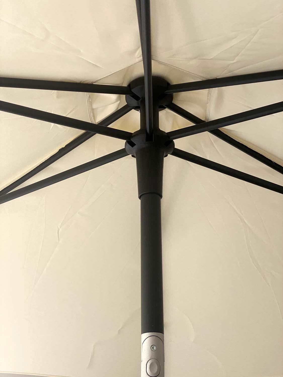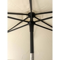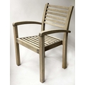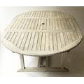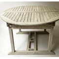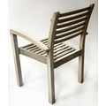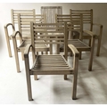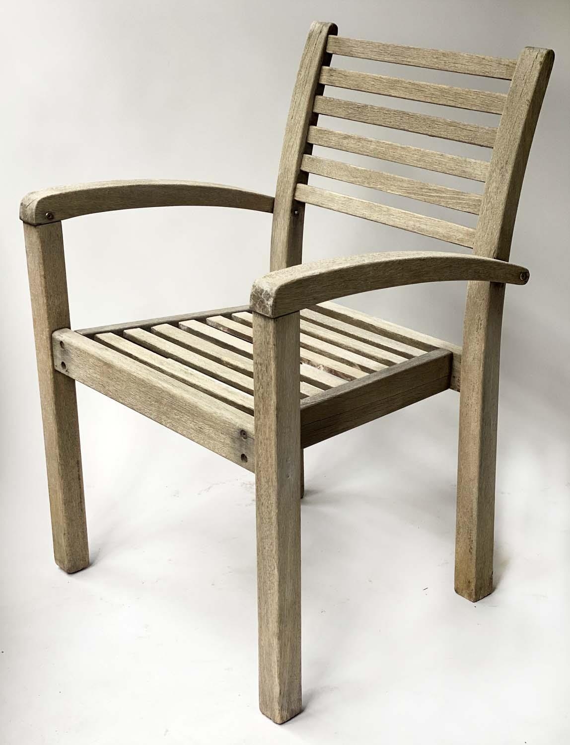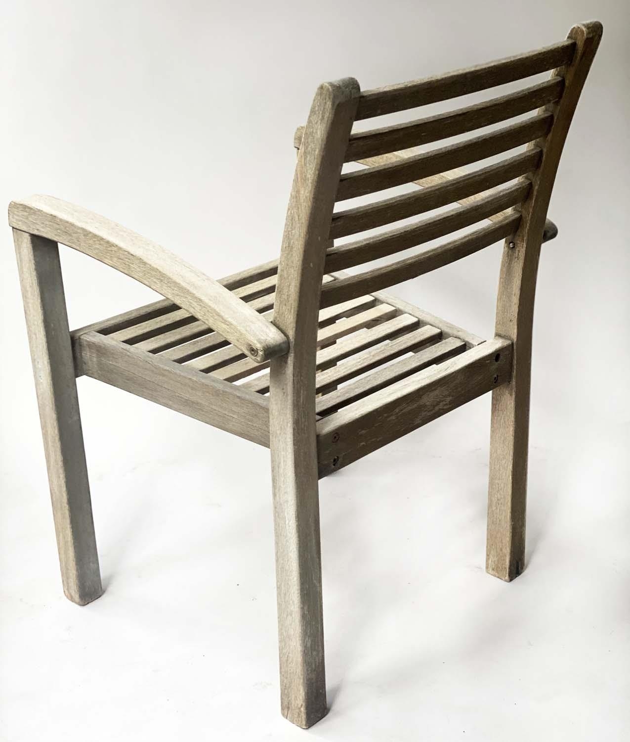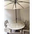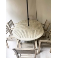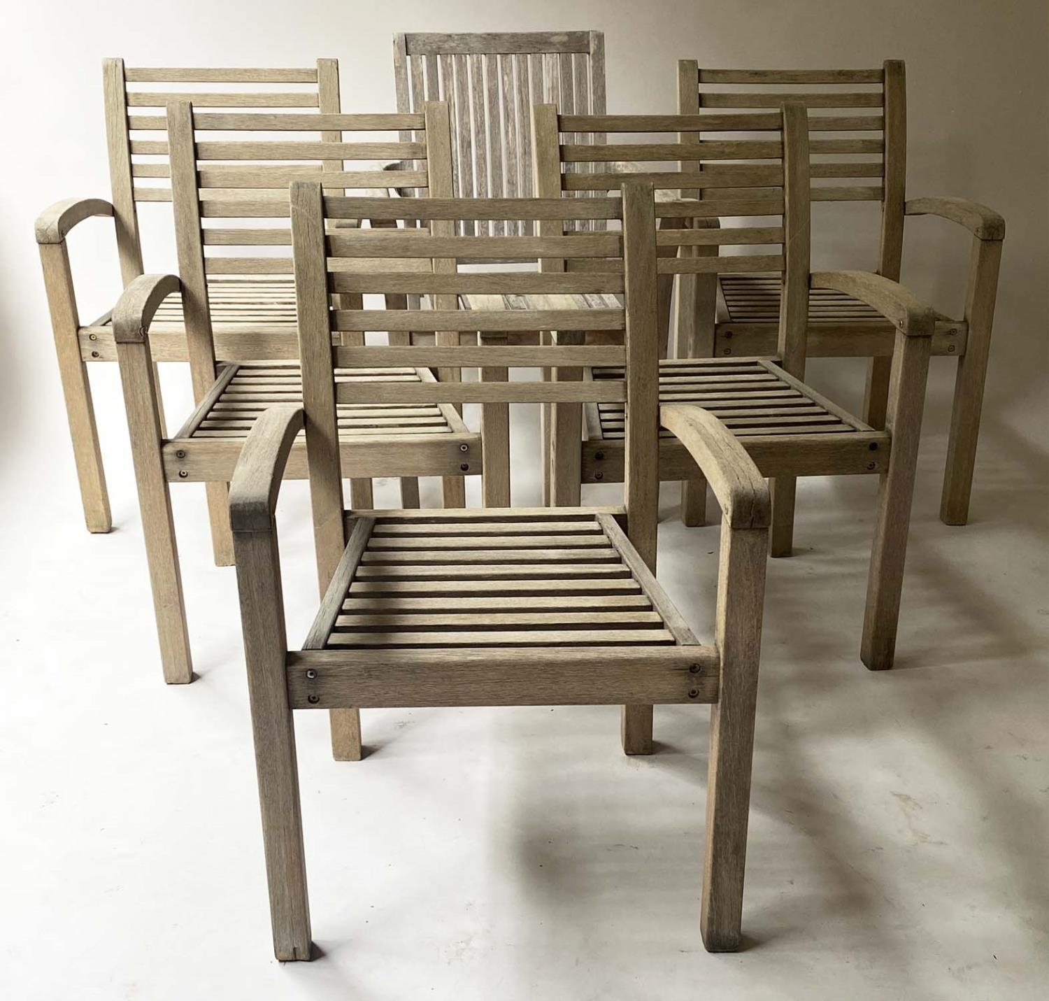 GARDEN SUITE, weathered teak and slatted rounded rectangular table 180cm extended x 119cm x 74cm H with integral foldout leaf with six armchairs and parasol. (8)