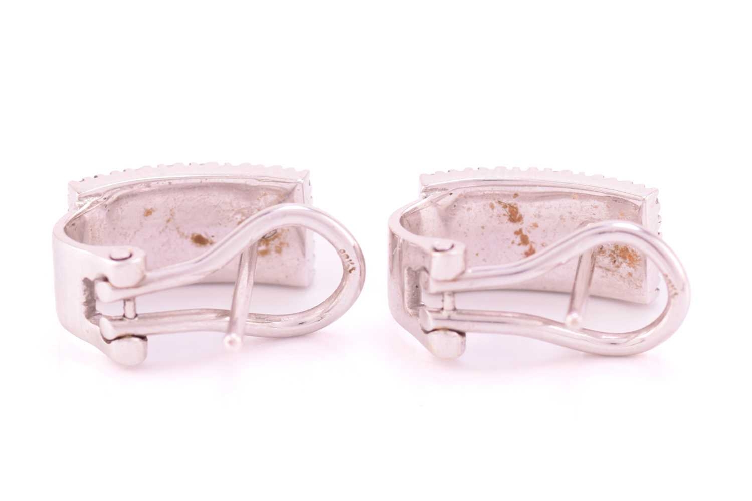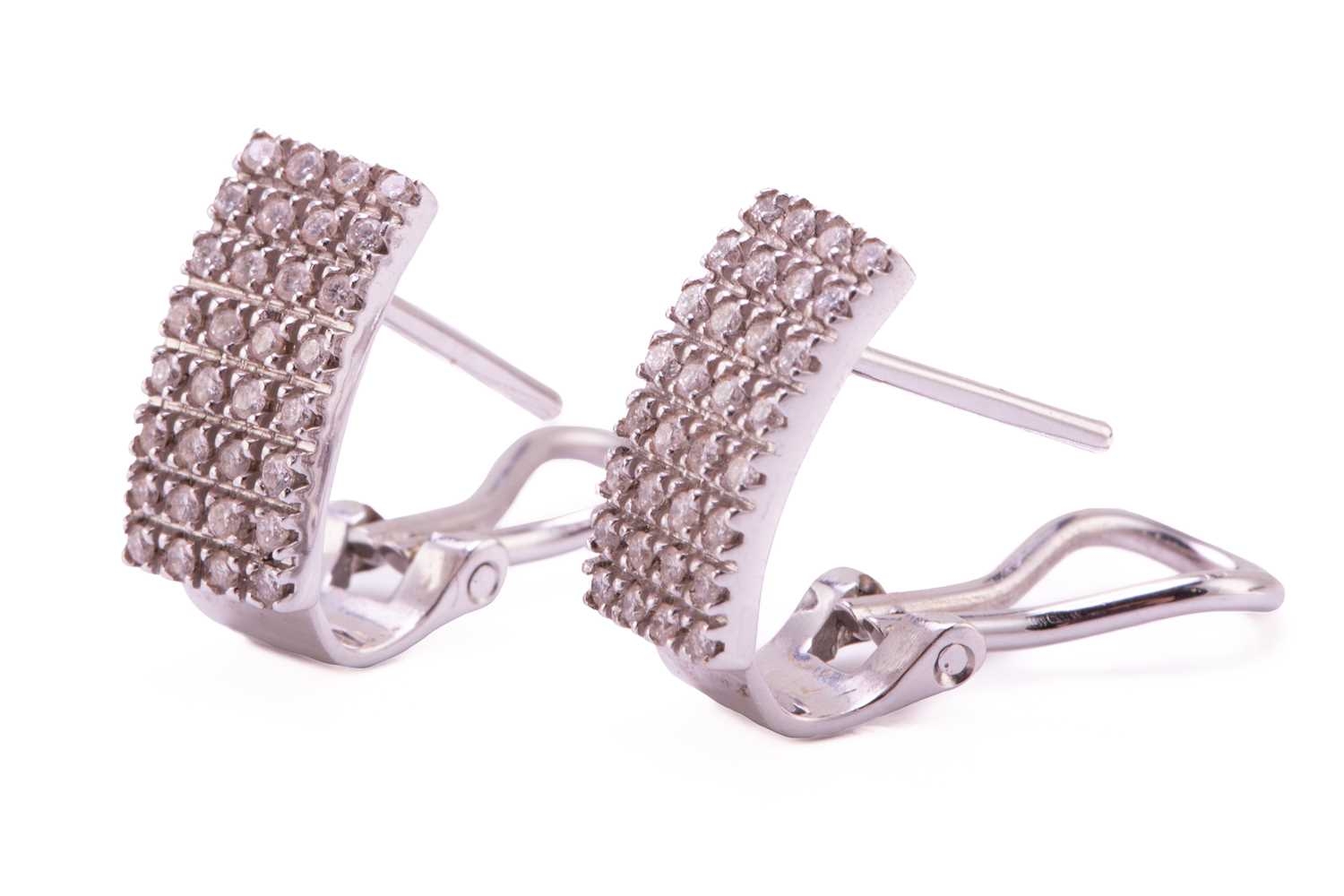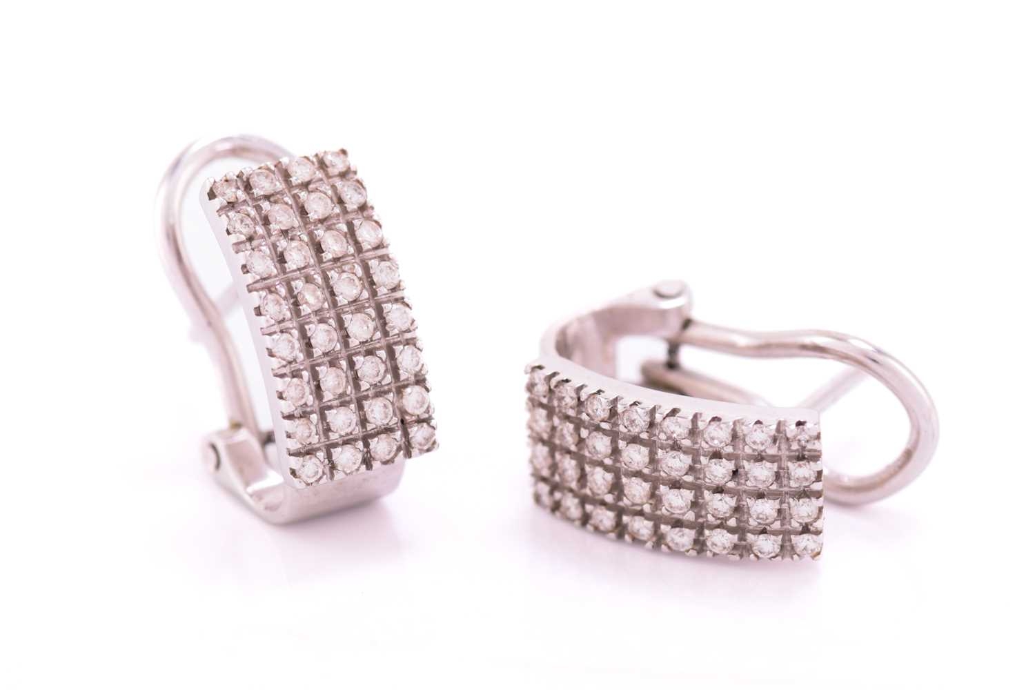 A pair of diamond-set earrings, each consists of brilliant diamond with an estimated total weight of 0.32ct, pavé set on a curved panel in white metal, backed with post and clip fittings, stamped as '18kt', measures 1.4 cm in length, total weight of items 5.9 grams.