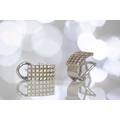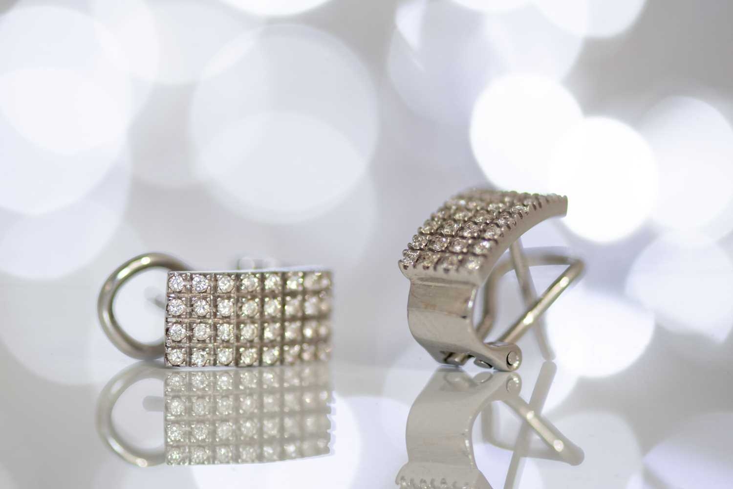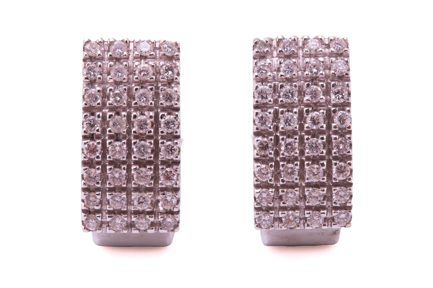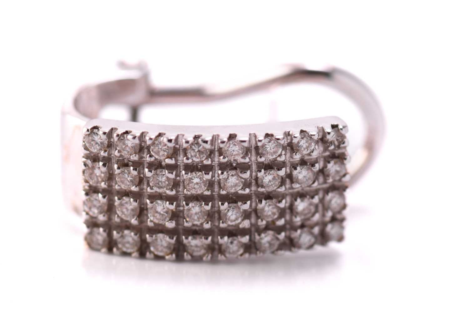 A pair of diamond-set earrings, each consists of brilliant diamond with an estimated total weight of 0.32ct, pavé set on a curved panel in white metal, backed with post and clip fittings, stamped as '18kt', measures 1.4 cm in length, total weight of items 5.9 grams.