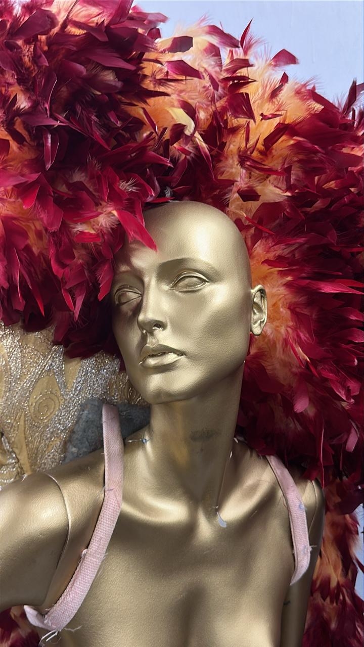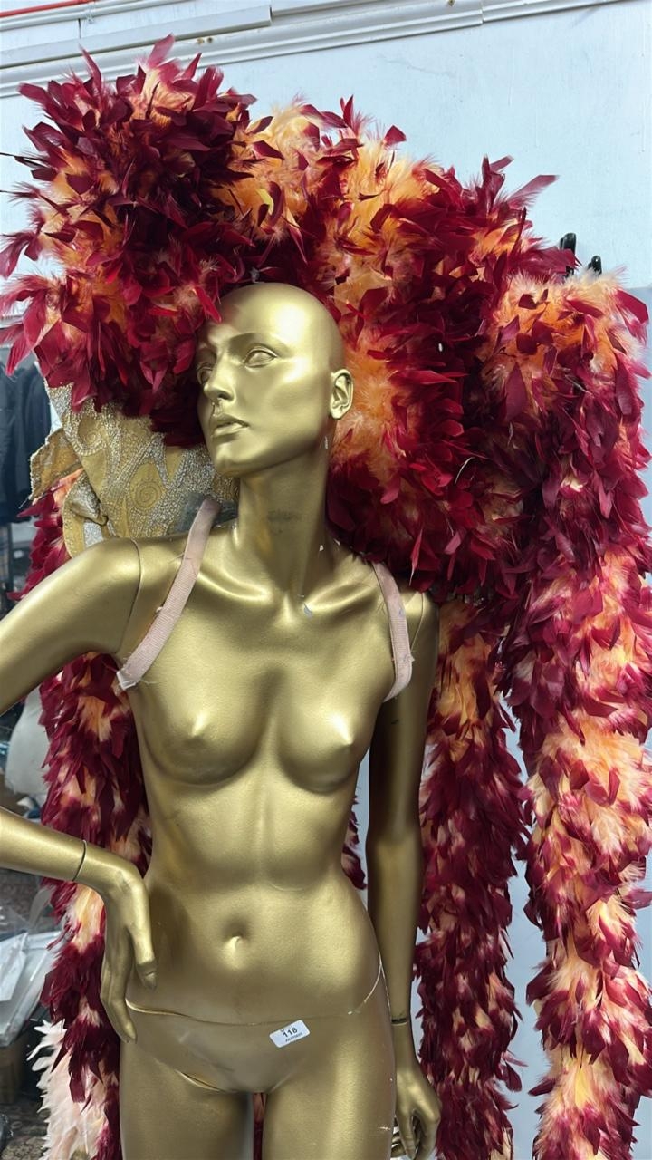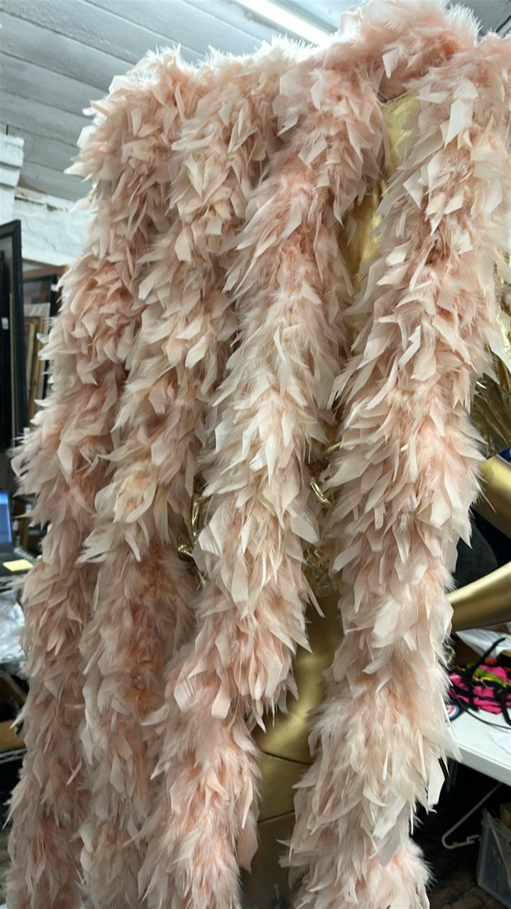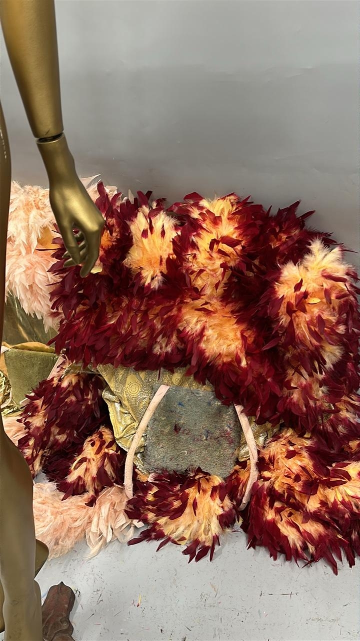 eight stage used showgirl peach and gold feather back pieces with one peach and red feathered back piece / Rail 4