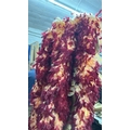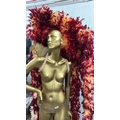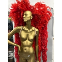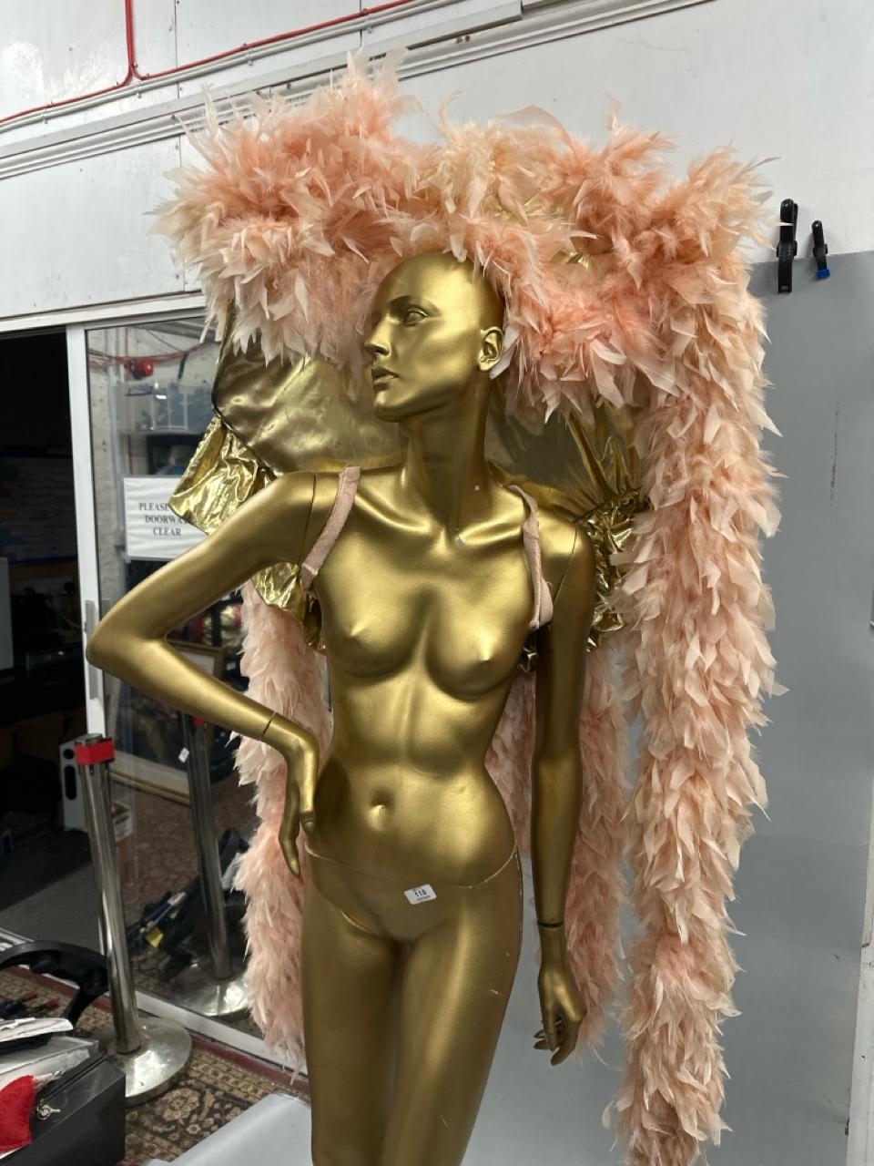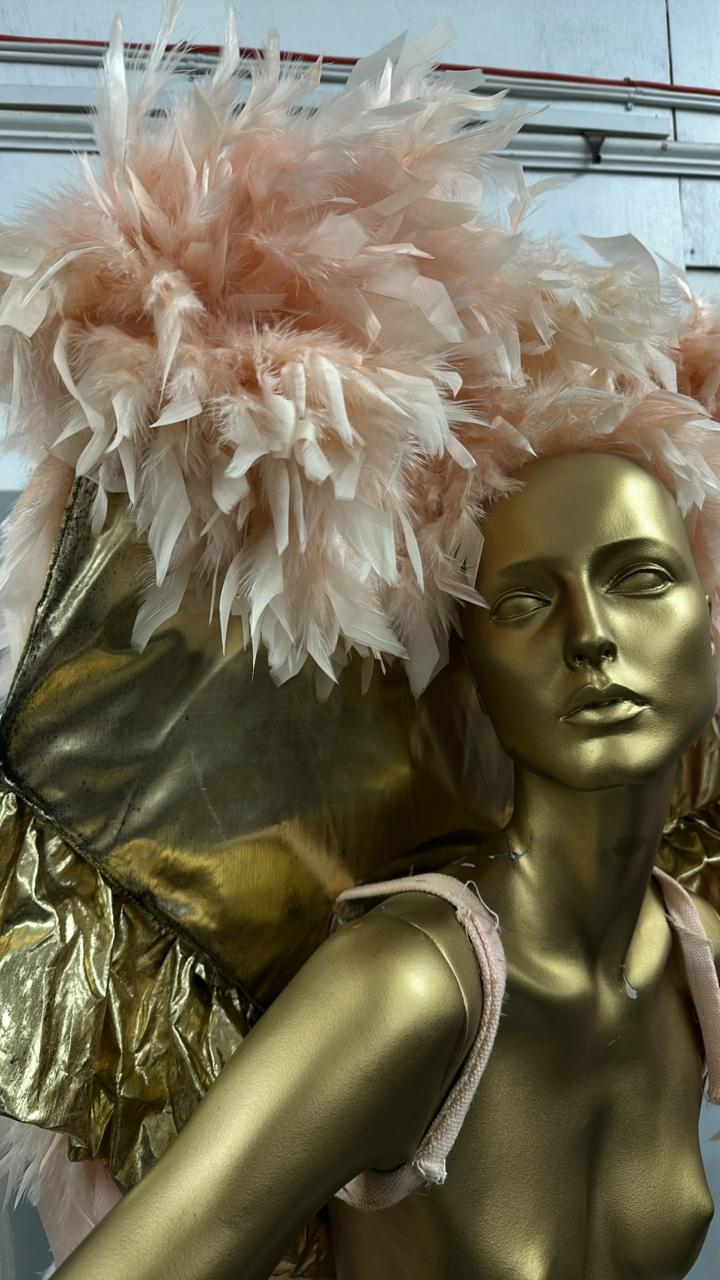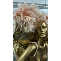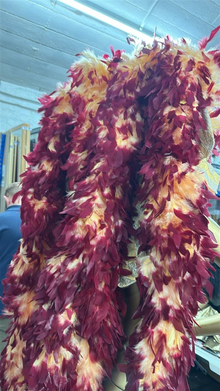 eight stage used showgirl peach and gold feather back pieces with one peach and red feathered back piece / Rail 4