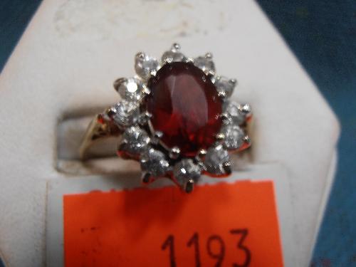 9 CT GOLD RING WITH LARGE GARNET & WHITE STONES