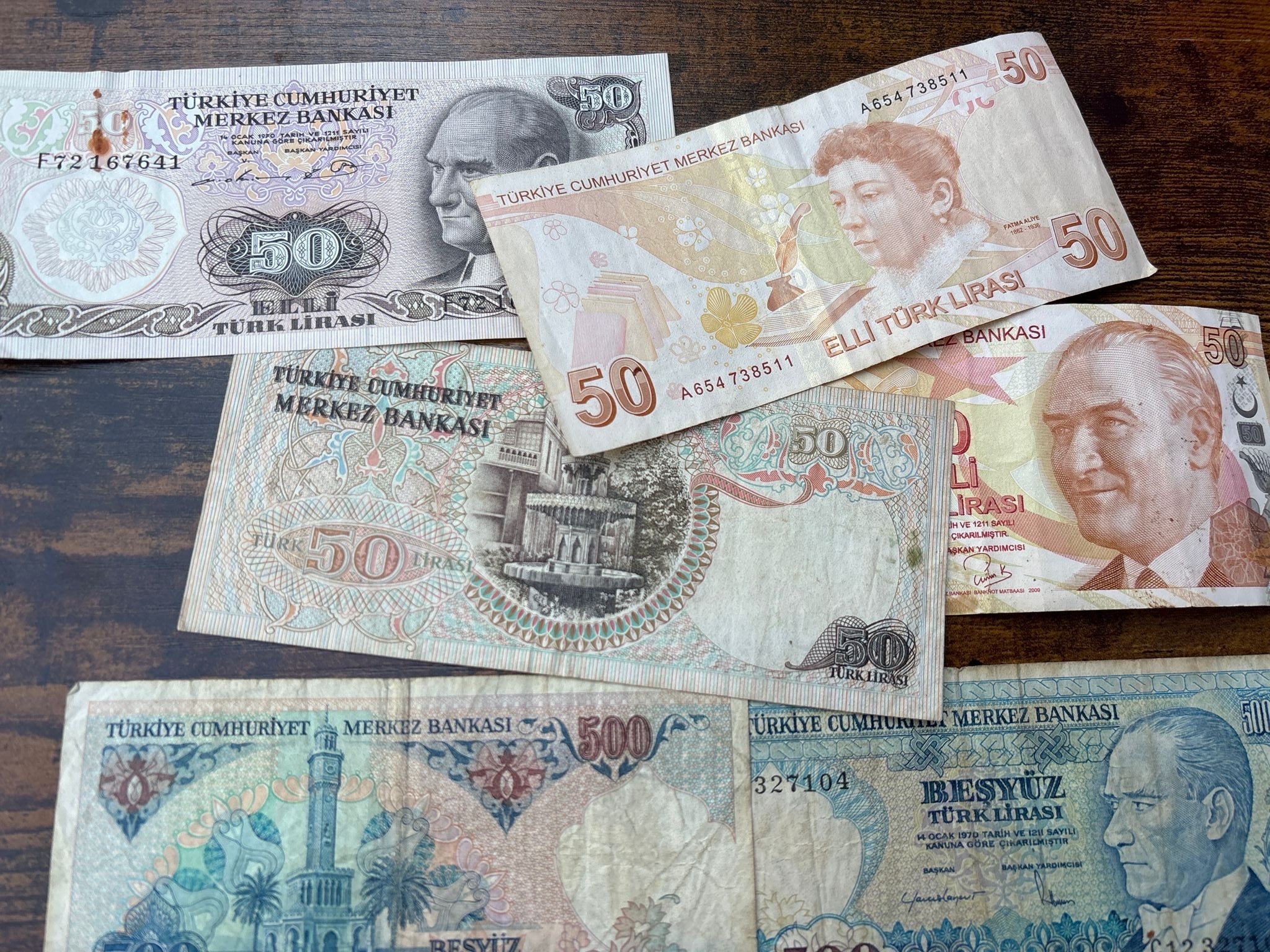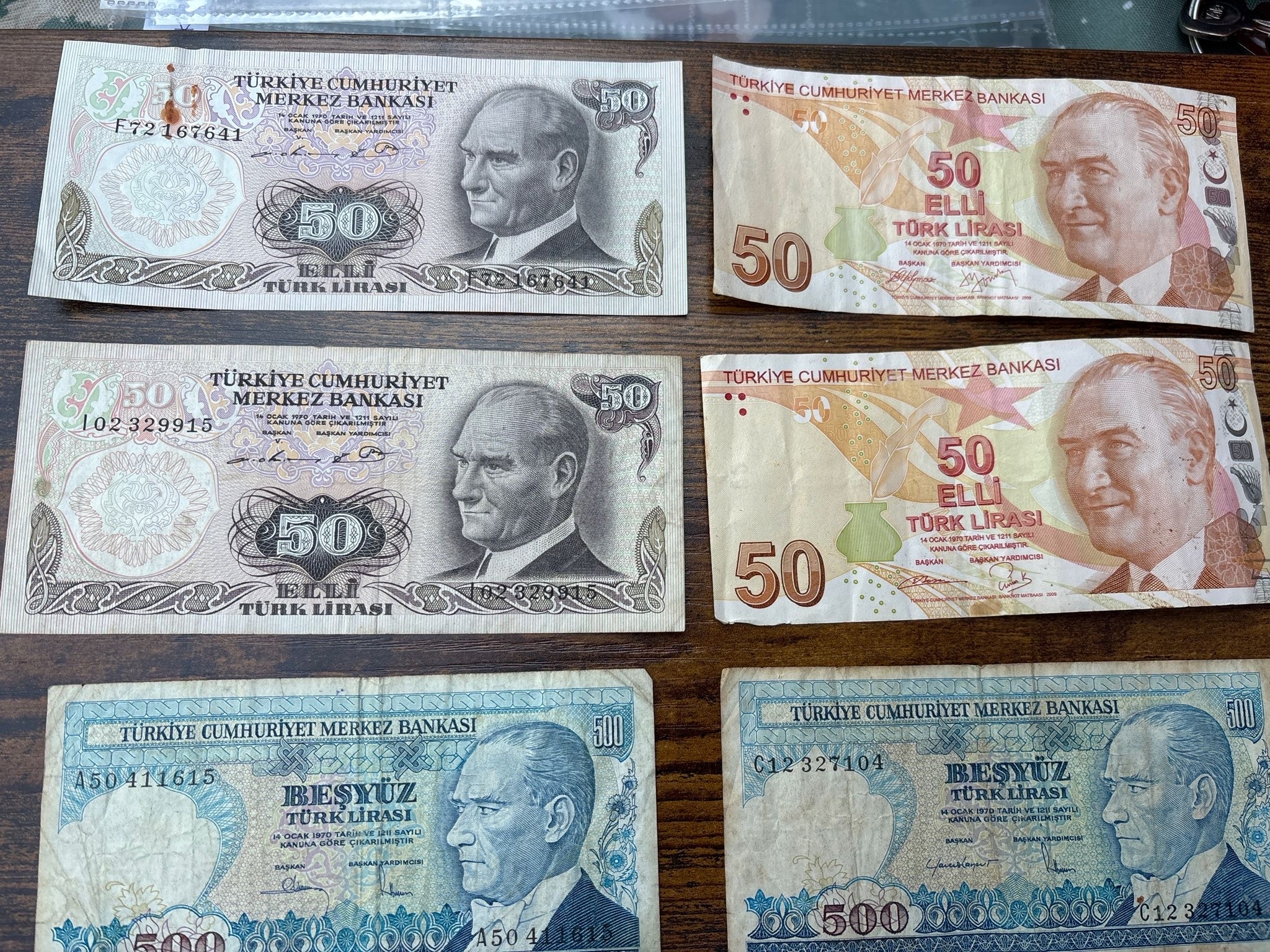 Turkey Banknote Collection – 6 Notes (Mixed Denominations, Atatürk Series) Mixed group of six Turkish banknotes featuring Mustafa Kemal Atatürk, including older 500 Lira notes alongside 50 Lira issues from both earlier and more modern series. A good blend showing the transition of Turkish currency over time. Condition is mixed with visible circulation, folds, and some staining to a few notes, but all remain complete and collectable. A decent mid-range collector lot with variety and higher denominations included.