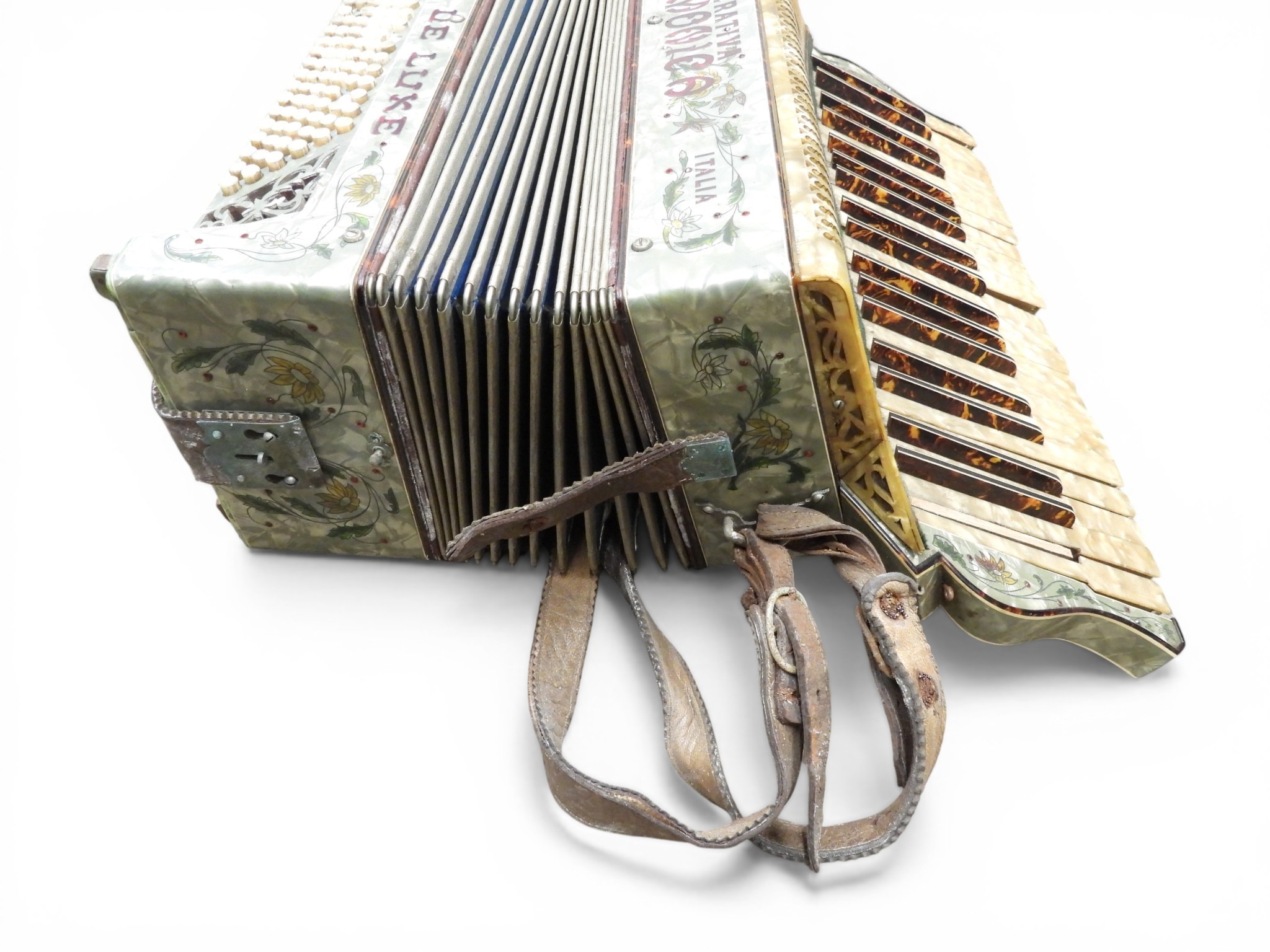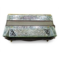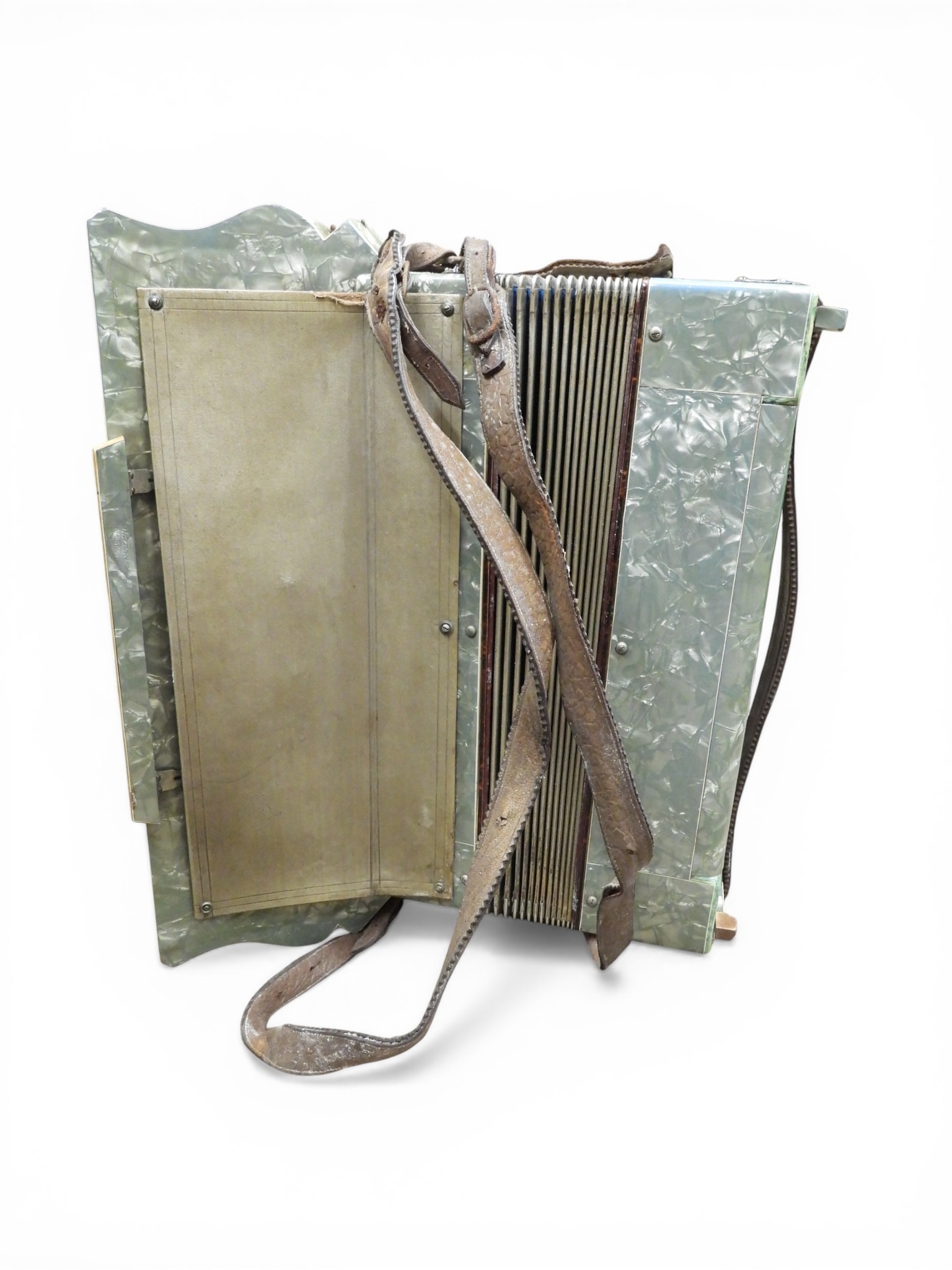 120 Bass keys, 41 Treble keys. Pearloid finish with light green colouring and warm amber coloured pearloid keys.