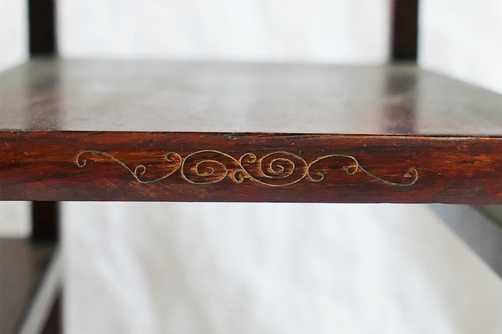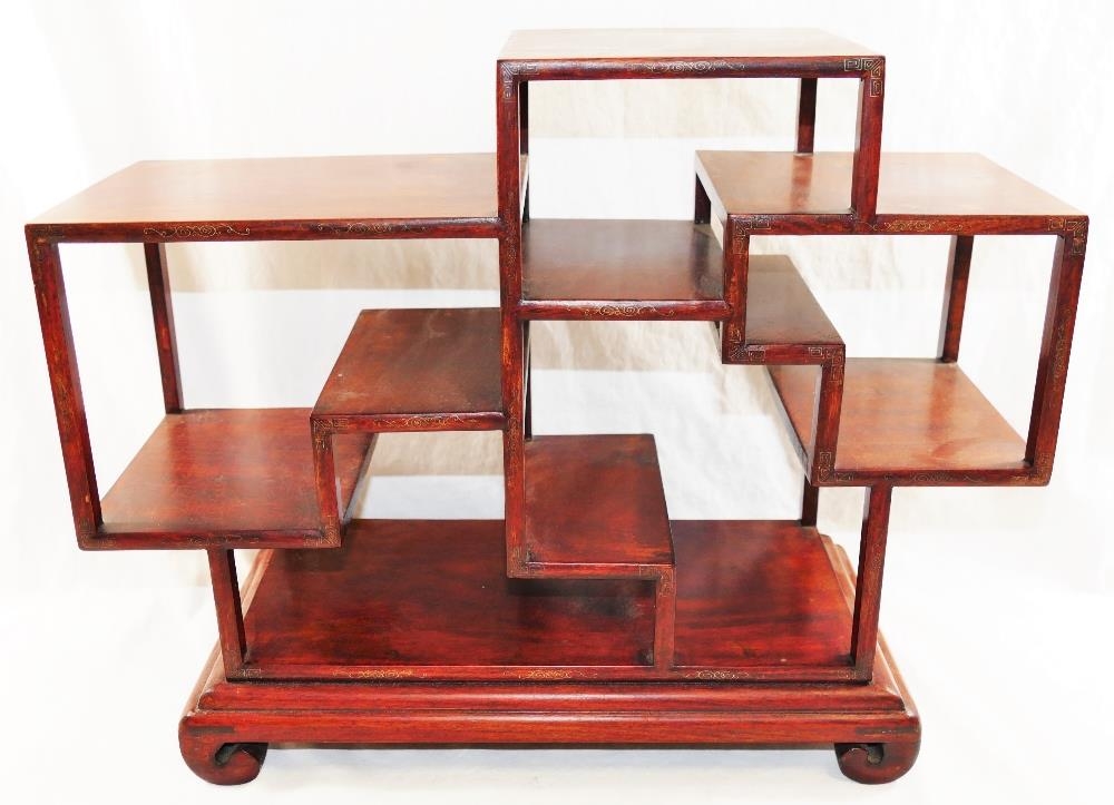 A set of 20th century Chinese table top hardwood shelves, inlaid with wire, 33cm x 15cm x 42.5cm