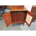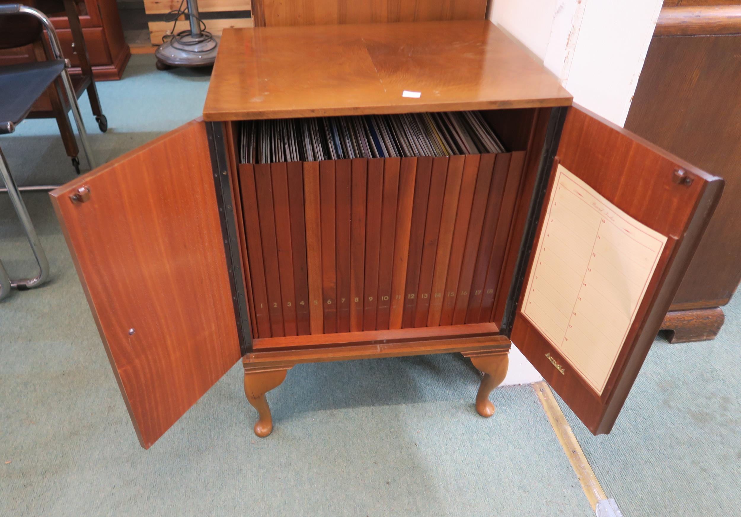 A 20th century mahogany "Arnold" record cabinet, contents and a mahogany trolley (2)