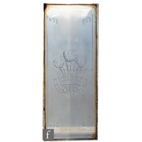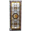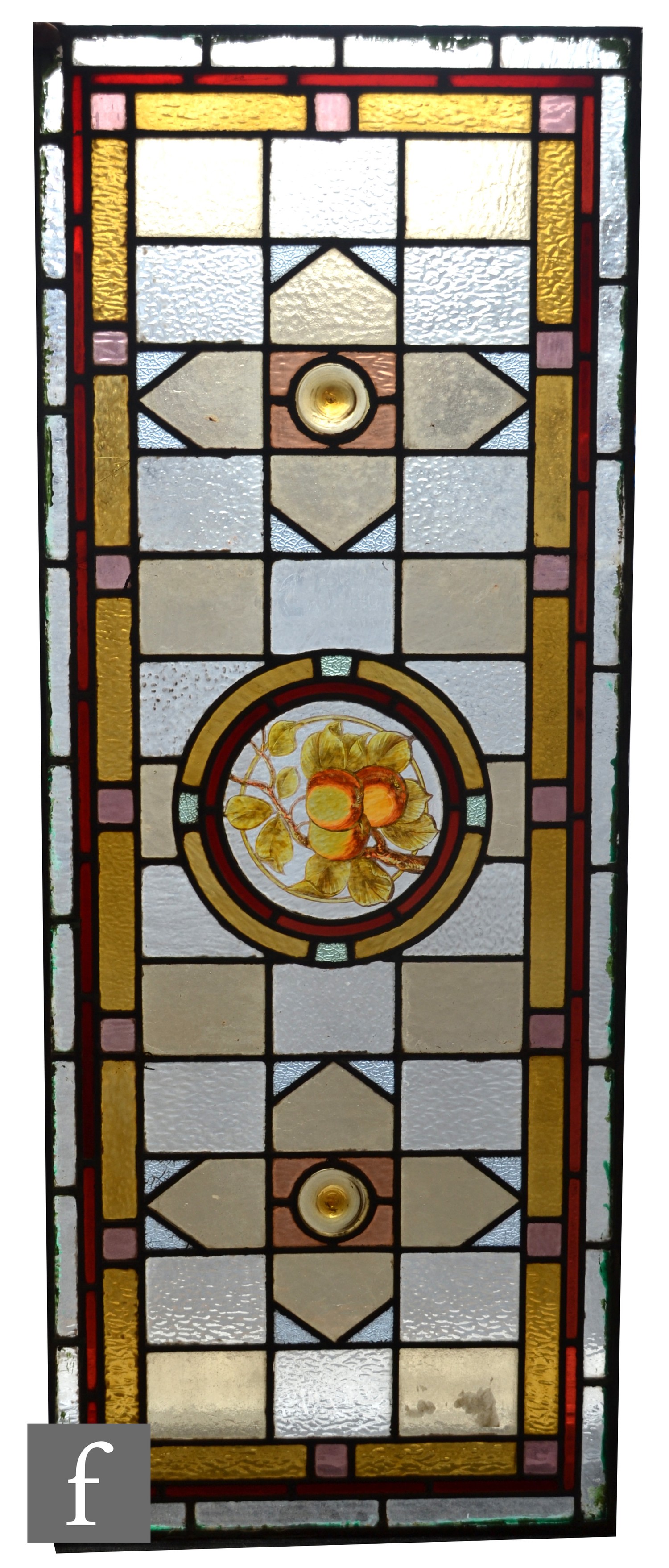 Unknown - A late Victorian stained and painted leaded glass panel, the central concentric reserve painted with apples and foliage, within a chequer crinkle and stained glass reserve, the two diamond shaped outer designs with central convex roundel, 137cm x 53cm.