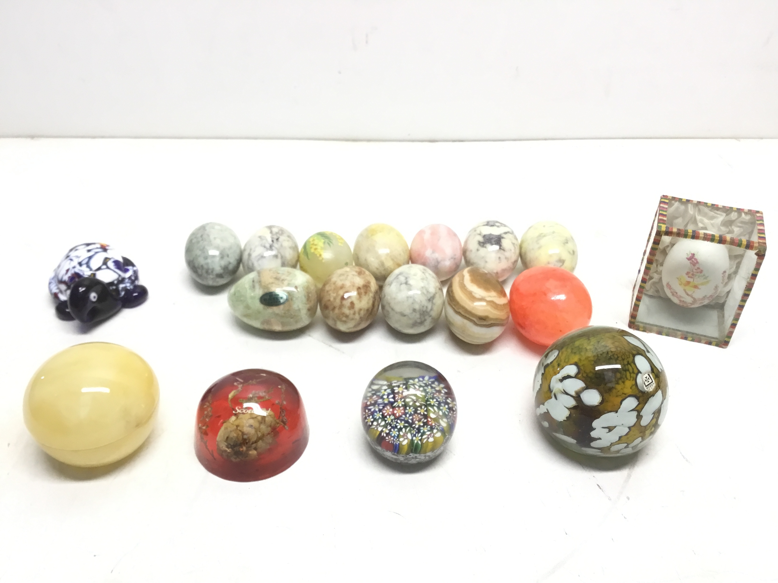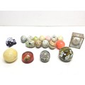 A collection of marble eggs and glass paperweights including Mdina