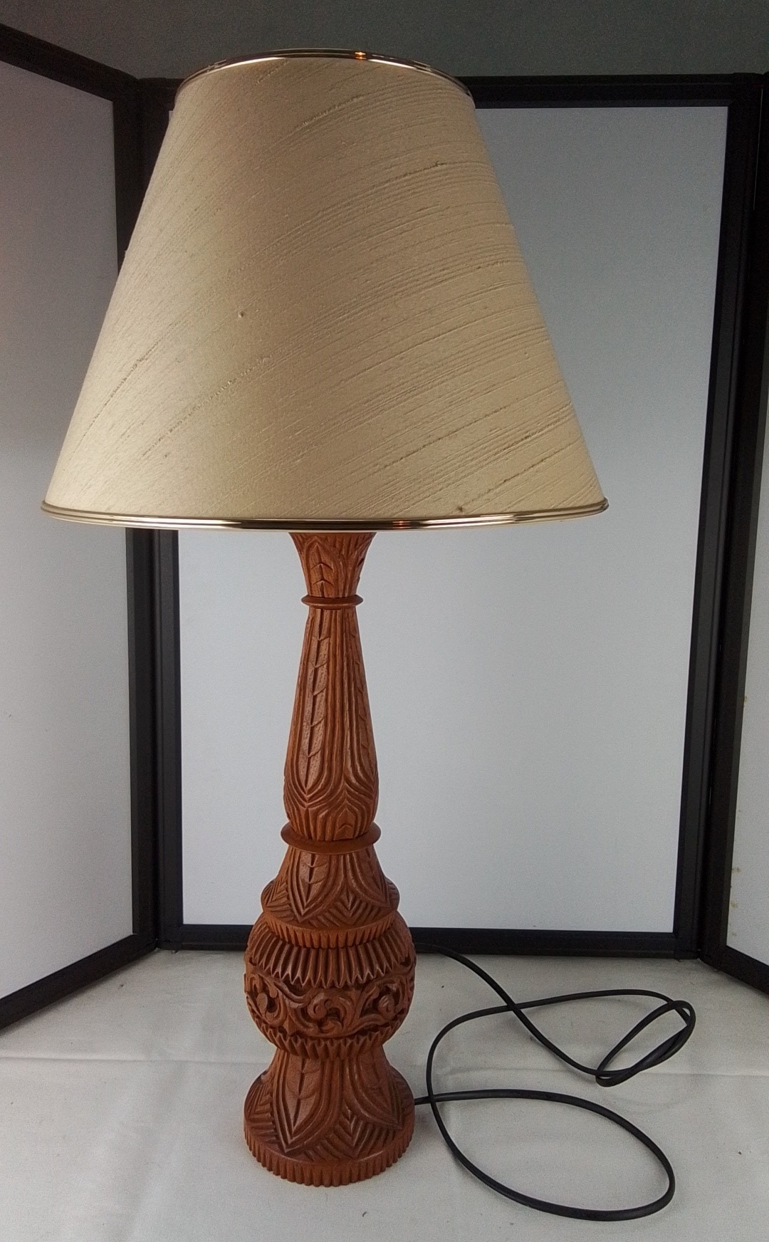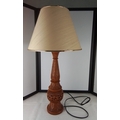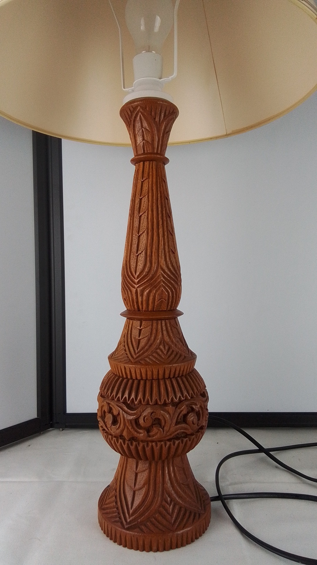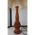 A carved wooden table lamp with floral and foliate relief decoration, 80cm height.
