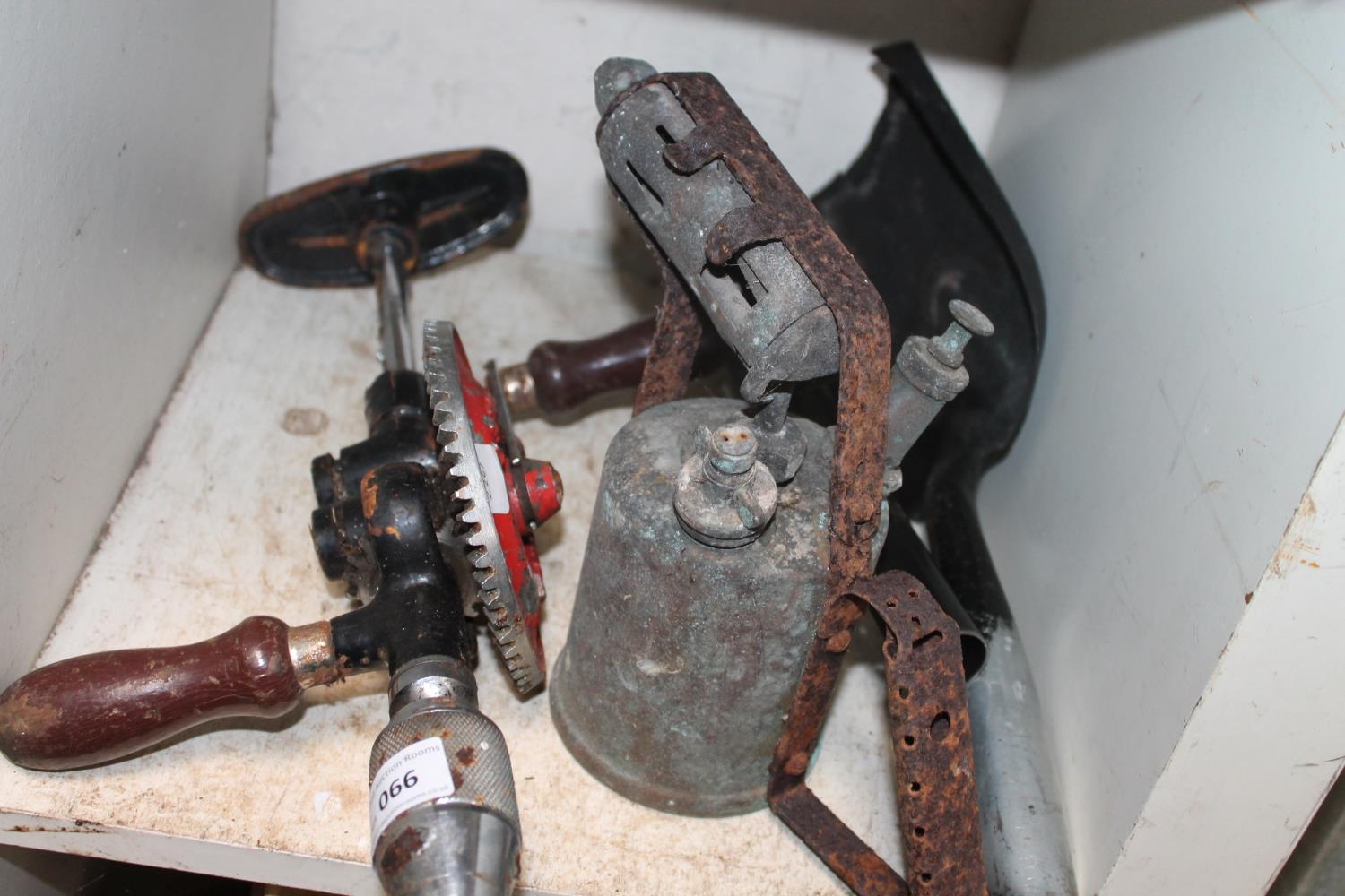 VINTAGE HAND DRILL, 2 X COAL SHOVELS AND A VINTAGE GAS BLOW-LAMP