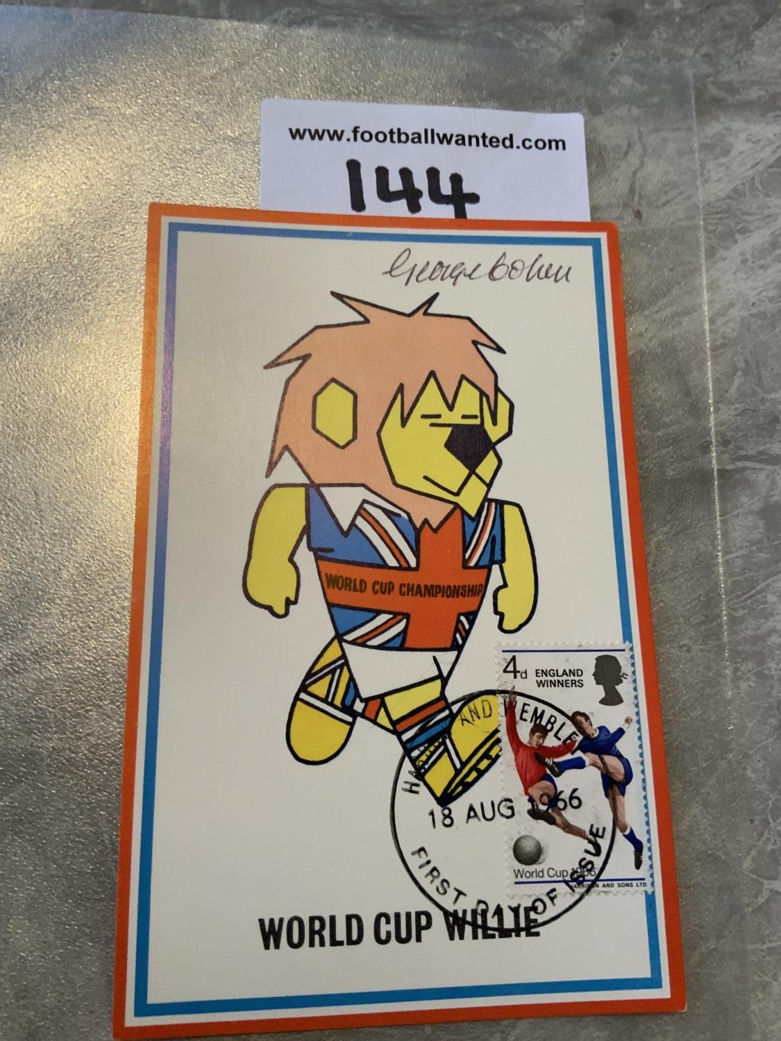 George Cohen 1966 Signed World Cup Willie Postcard: Original 55 year old postcard with 4d England Winners stamp, hand stamped Wembley 18 8 1966 the day of issue of the stamp. Signed clearly to the front in biro.