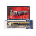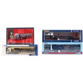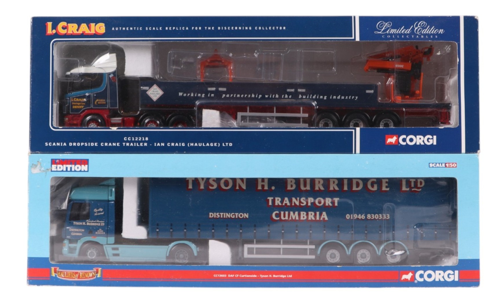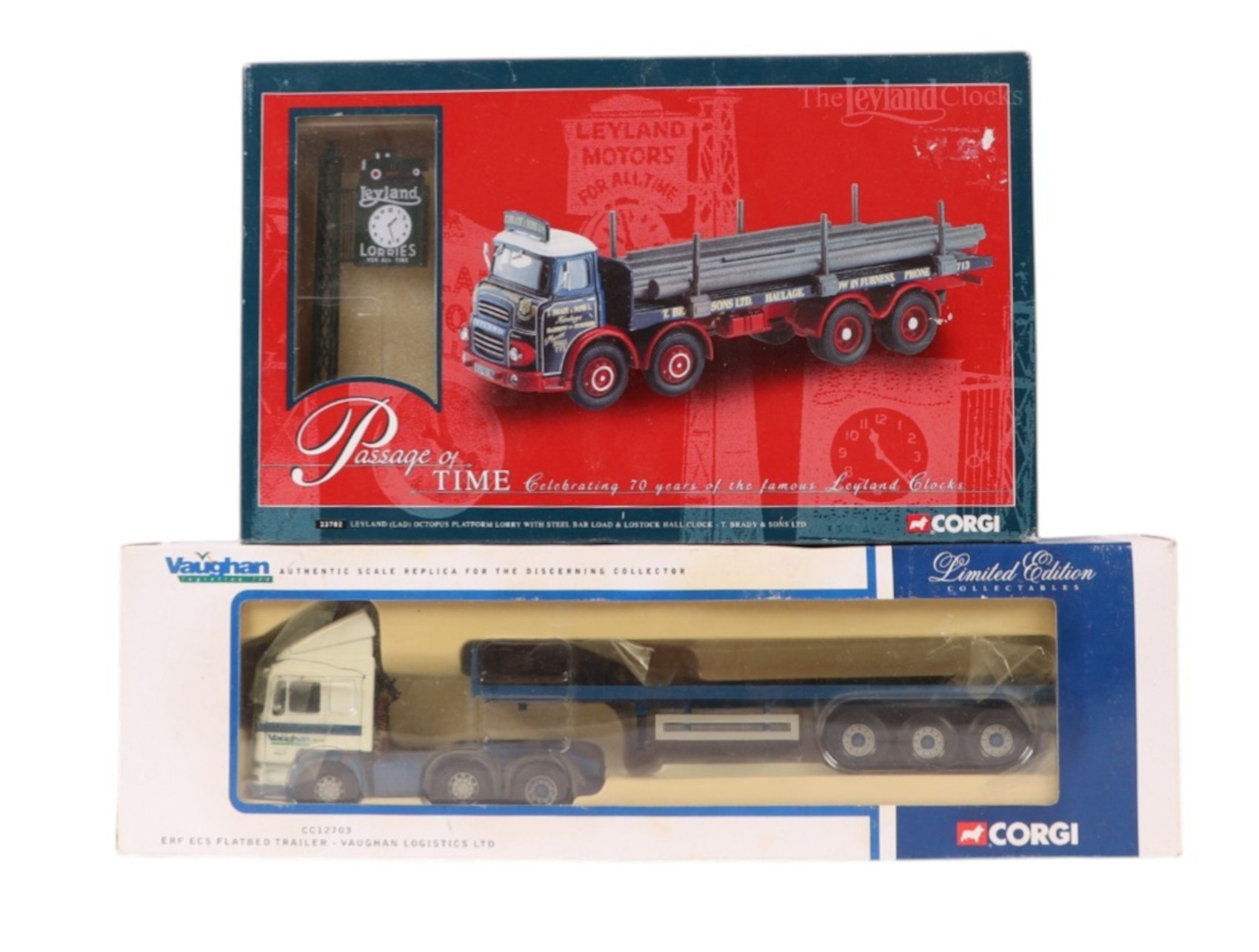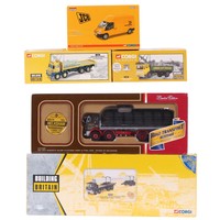 Four Corgi Commercial diecast vehicles, comprising ERF ECS flat bed trailer ( Vaughan Logistic Ltd ) CC12701, DAF CF curtain side, CC13603, Scania drop side crane trailer, Ian Craig ( Haulage Ltd ) CC12218 and Leyland Octopus platform lorry with steel bar load and Lostock Clock, 23702, all boxed (4).