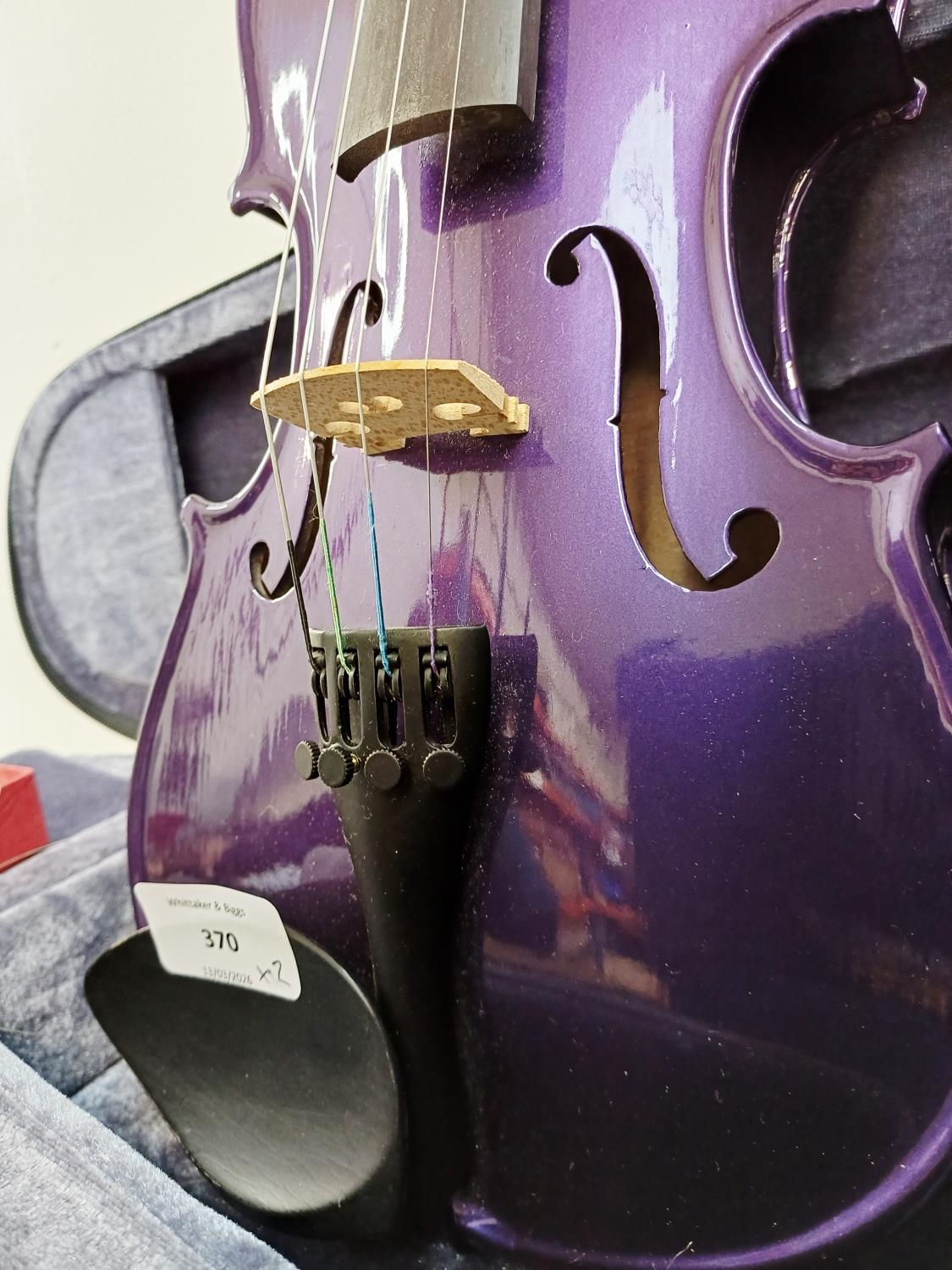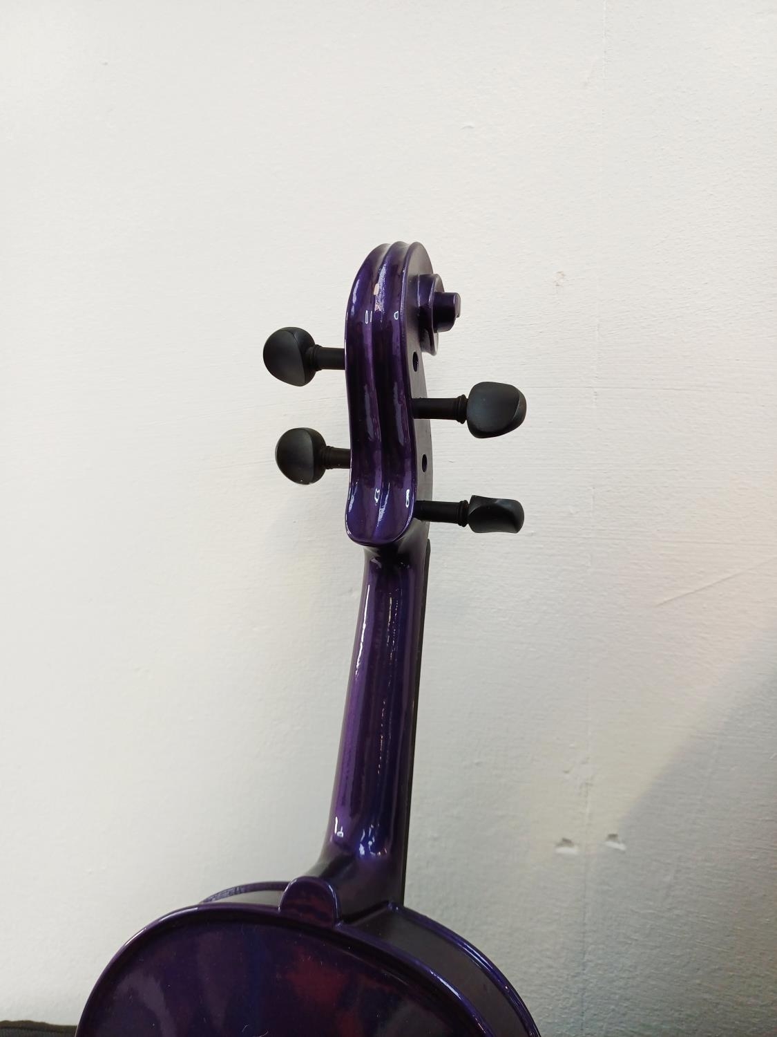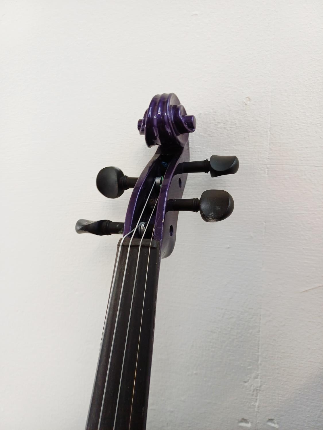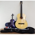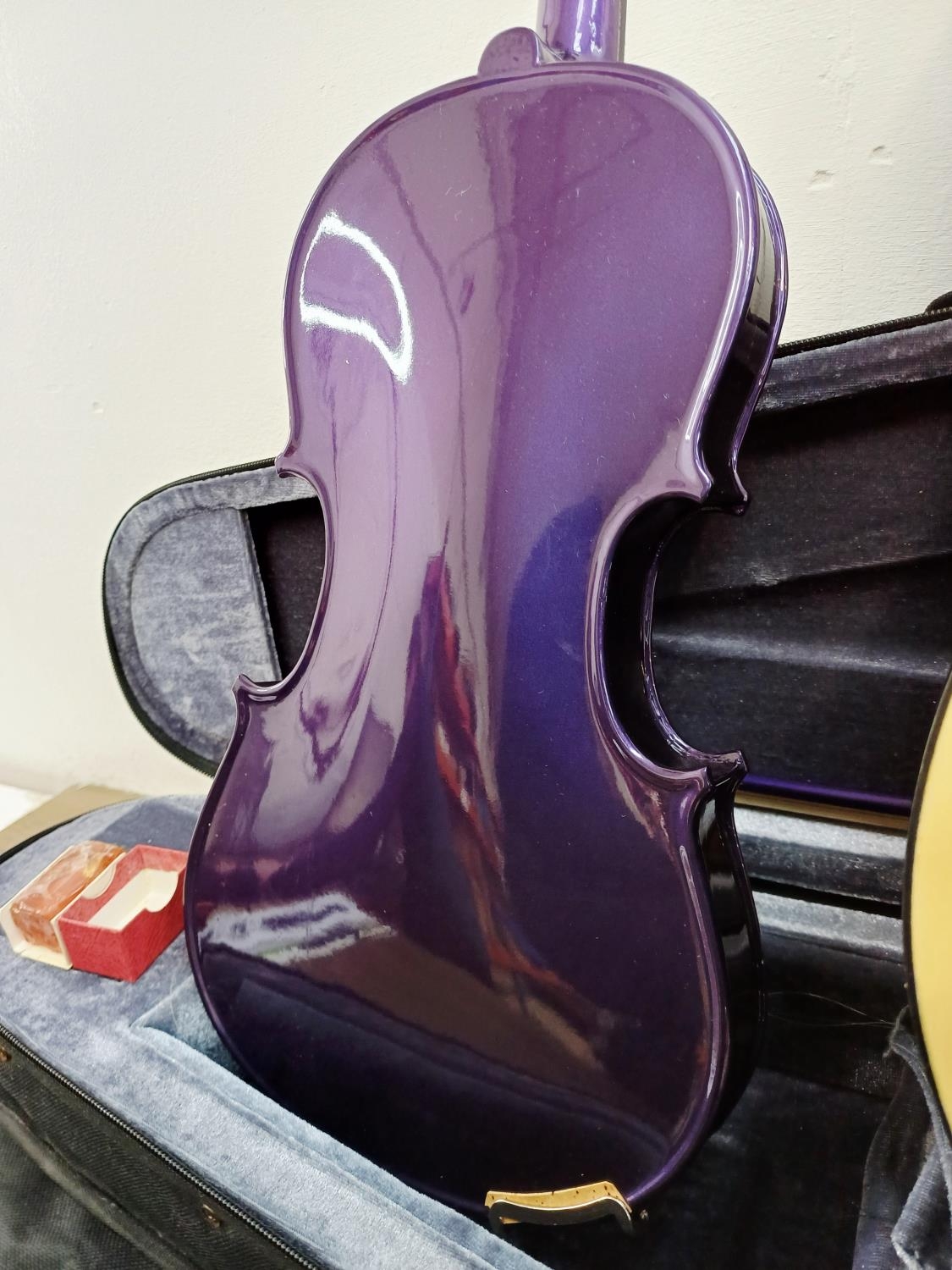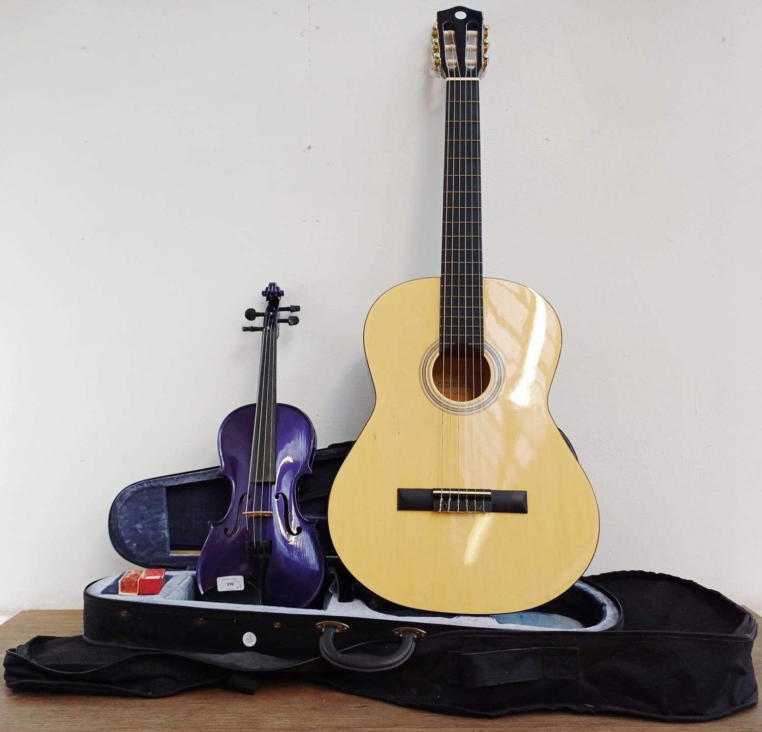 Two cased full-size musical instruments, one The Rainbow Violin Company Ltd. purple violin with bow and rosin and one Elevation 540/6441(D) nylon strung classical guitar