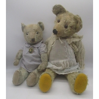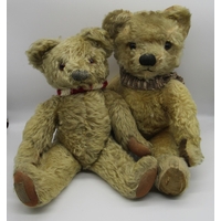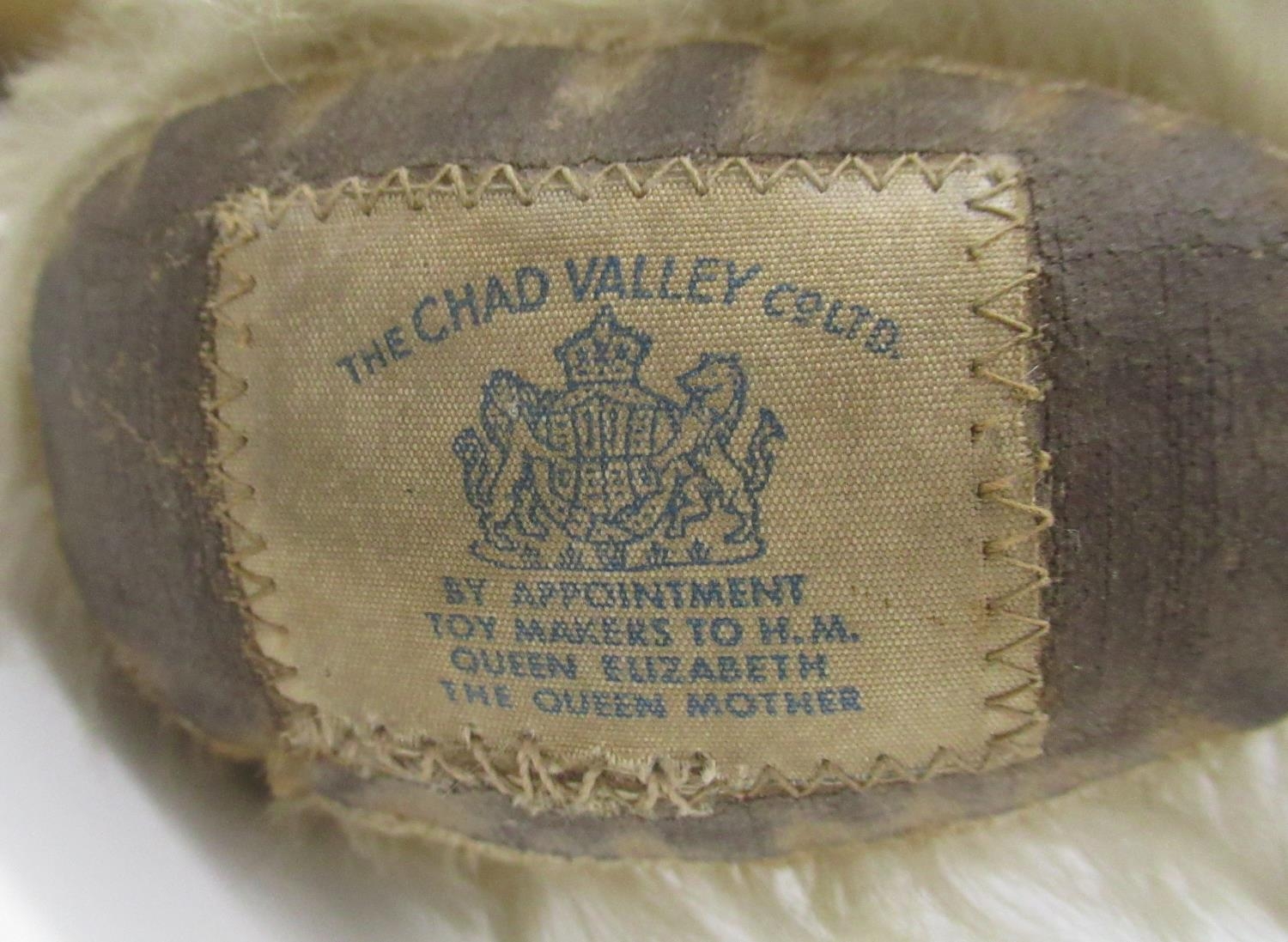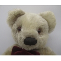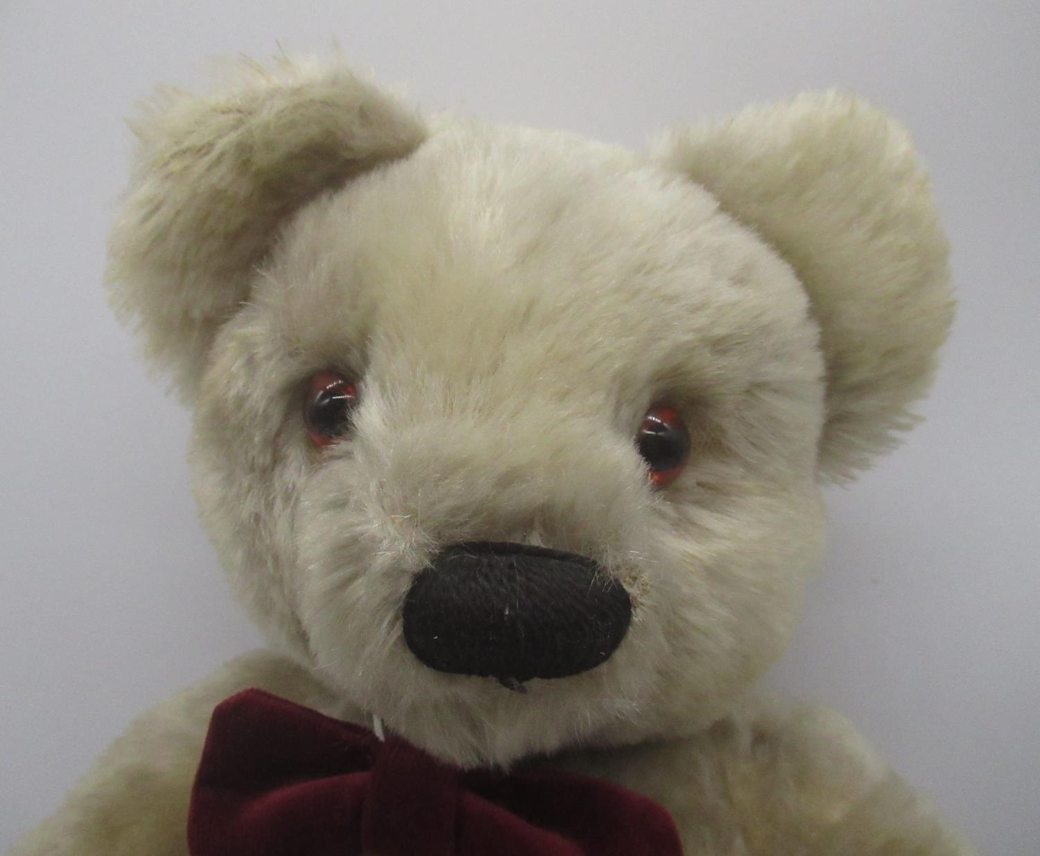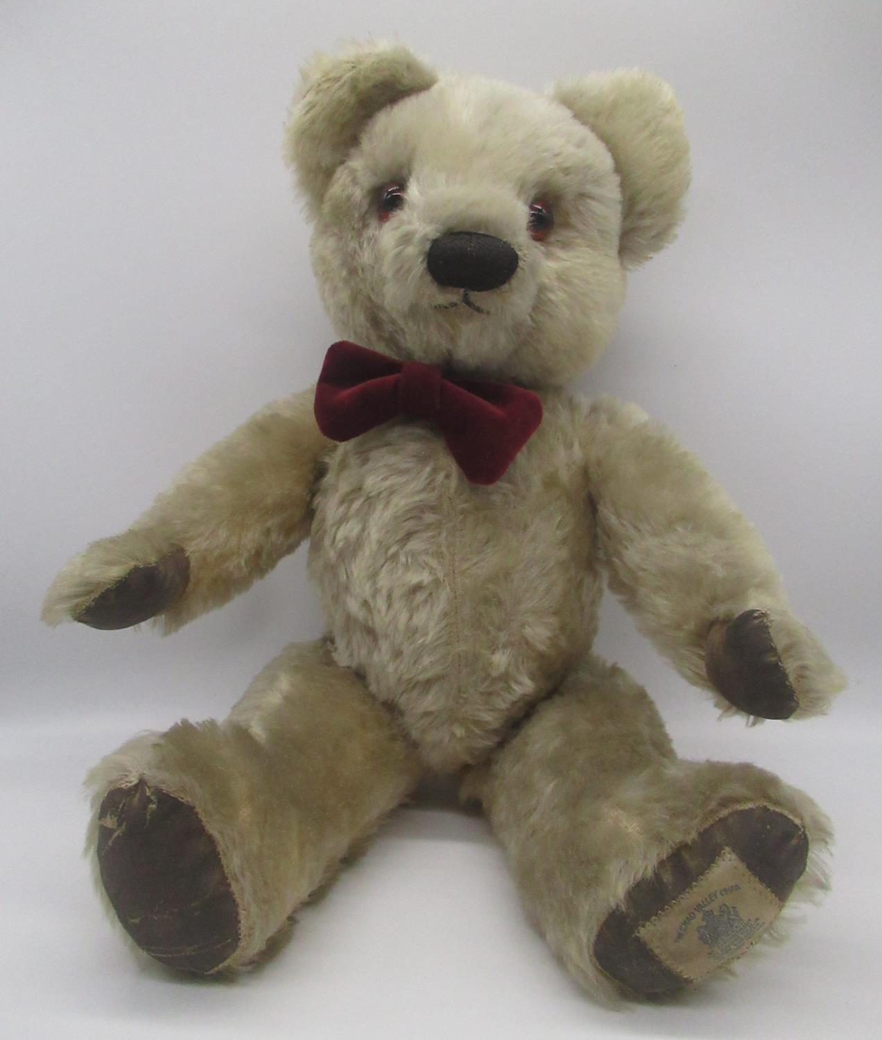 Circa 1940's Chad Valley teddy bear in blonde mohair, with glass eyes, jointed arms and legs, stitched nose and rexine pads, wearing velvet bowtie with Chad Valley label on foot, H50.5cm