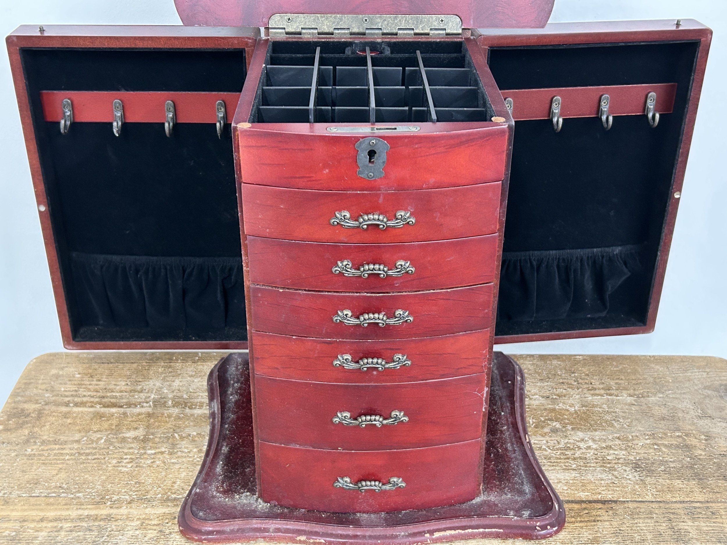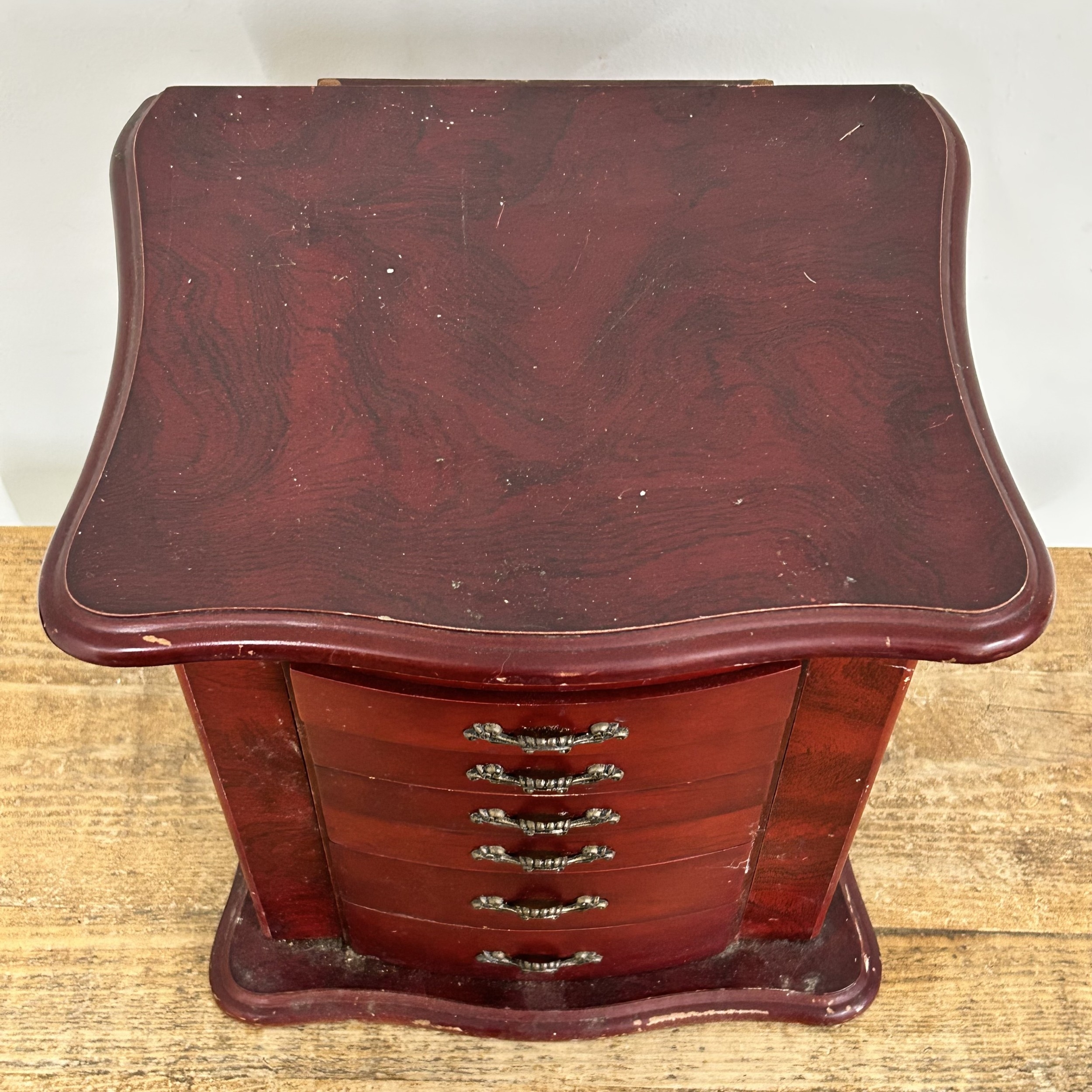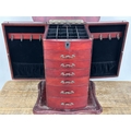 A vintage Oriental style multi drawer jewellery chest with side doors, lift lid and secret drawer lock, approx. 13" high (signs of age and use)
