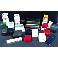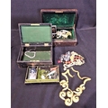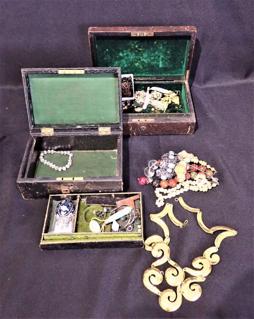 A SMALL COLLECTION OF COSTUME JEWELLERY contained within two leather jewellery boxes, 20cm and 24cm wide (a lot)