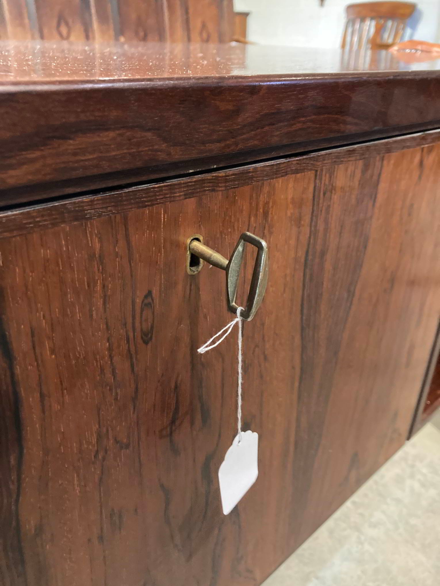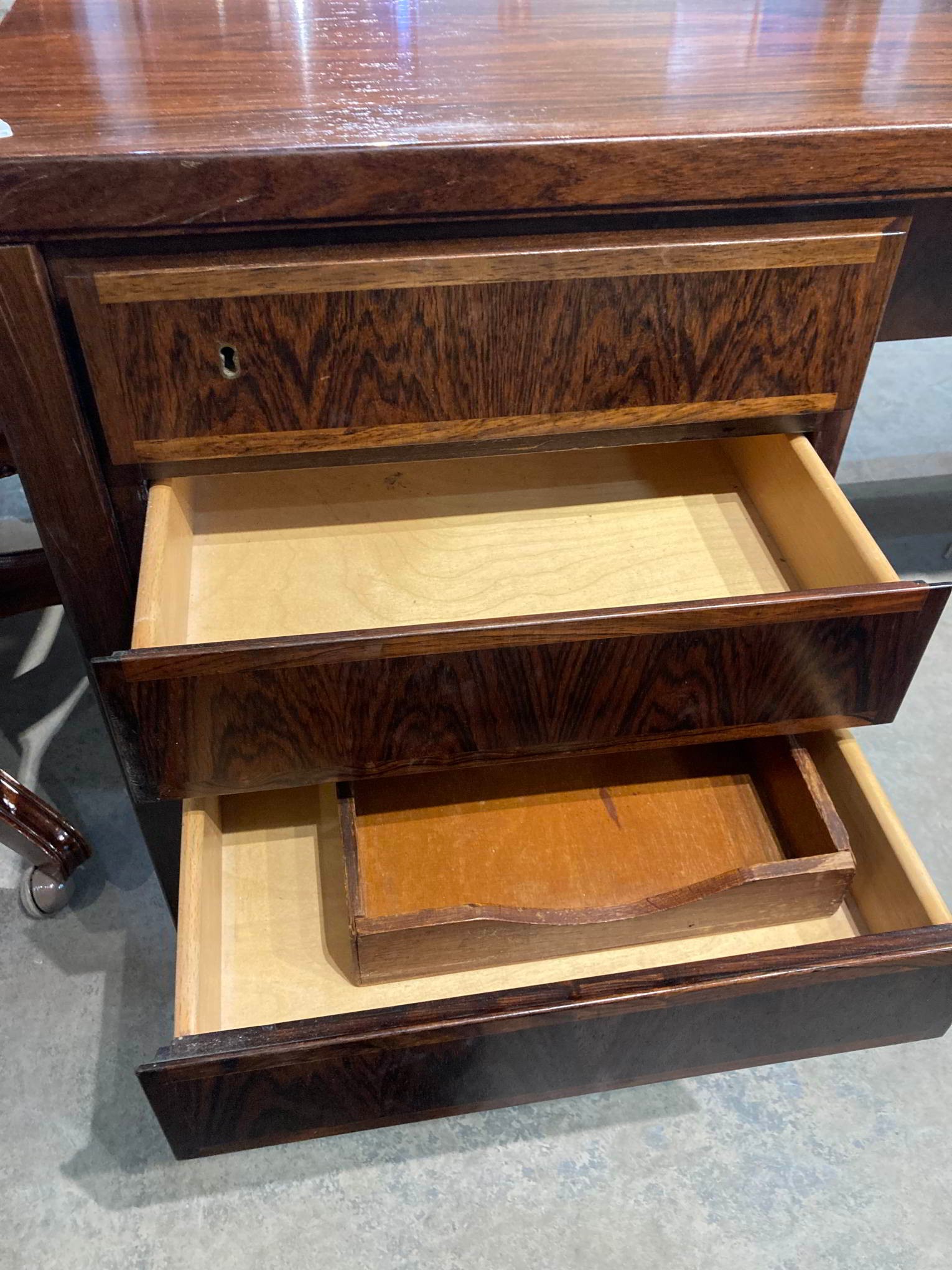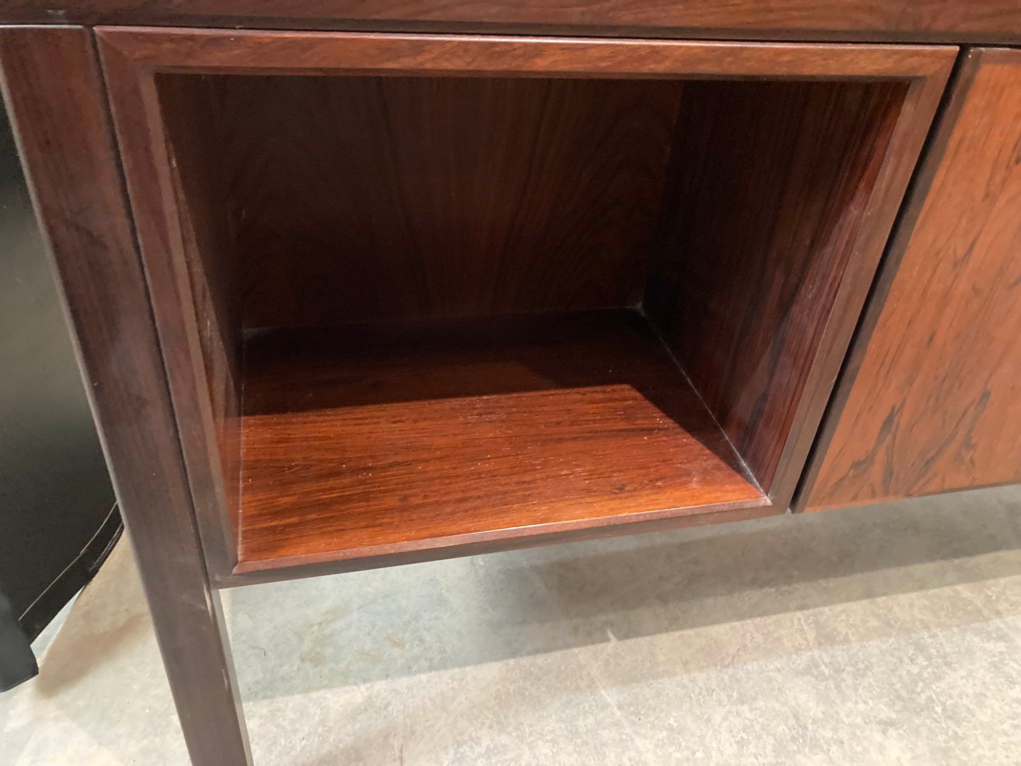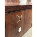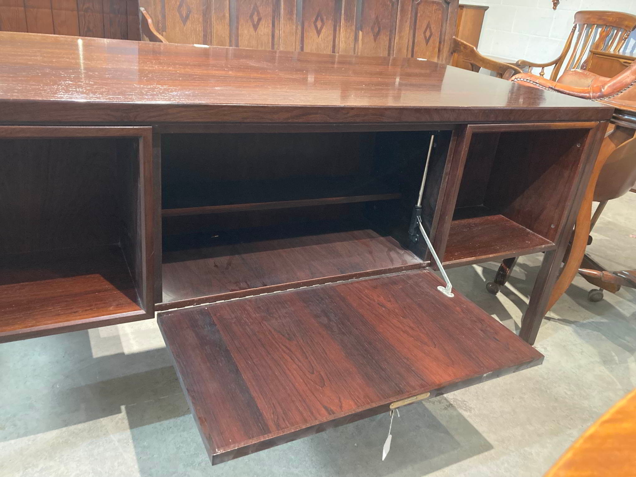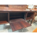 1960's Gunni Omann for Omann Jun Mobelfabrik, Model 77 desk in rosewood - six drawers to the front and to the rear are two storage areas and a central bar cabinet with fold down door 72H 156W 79D (key in office)
