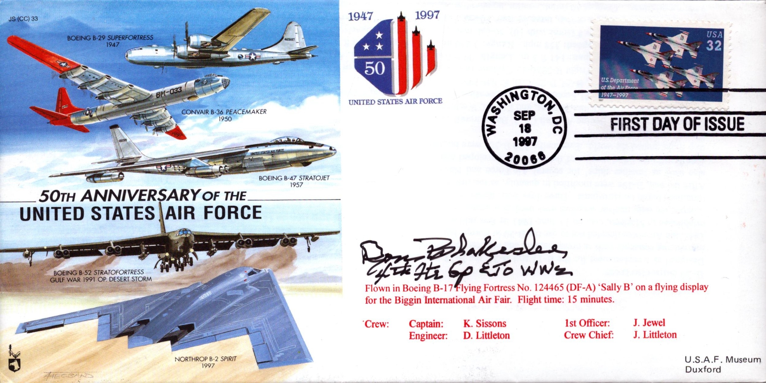 Donald Blakeslee signed FDC 50th Anniversary of the United States Air Force. Signed on reverse Squadron Leader D. Hill Raf 180 of 250. Donald James Matthew Blakeslee (September 11, 1917 September 3, 2008) was an American pilot and officer in the United States Air Force, whose aviation career began as a pilot in the Royal Canadian Air Force flying Spitfire fighter aircraft during World War II. He then became a member of the Royal Air Force Eagle Squadrons, before transferring to the United States Army Air Forces in 1942. He flew more combat missions against the Luftwaffe than any other American fighter pilot, and by the end of the war was a flying ace credited with 15.5 aerial victories.