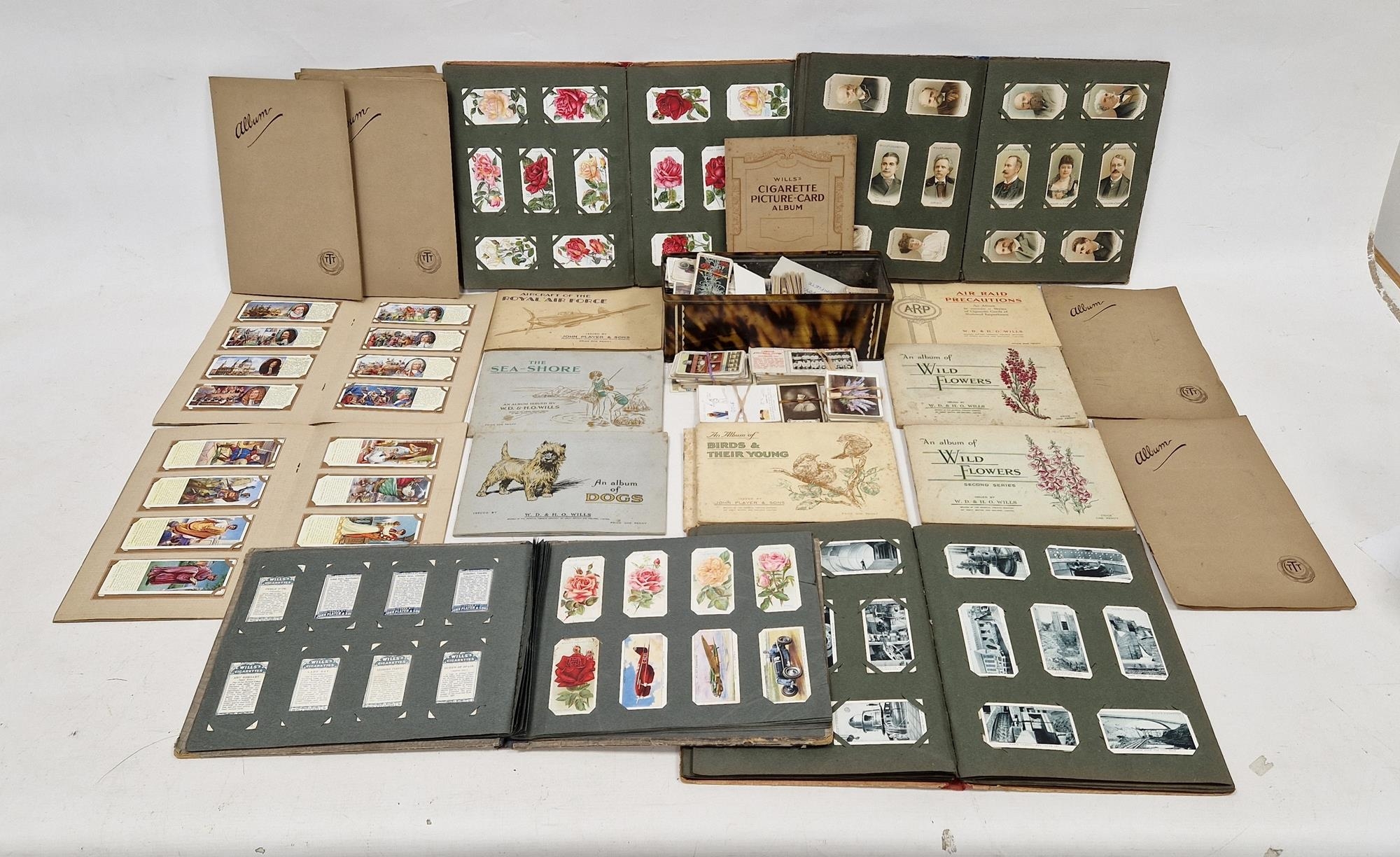 Large collection of cigarette cards, predominantly in albums, including an album of dogs, Wills 'Seashore', Aircraft of the Royal Air Force by Players, Air Raid Precautions, Wills 'Wild Flowers' series, cigarette pictures album mounted with Wills Naval Dress and Badges, Botanical Specimens, various albums of Typhoo tea cards including Swiss Family Robinson, Wonder Cities of the World, Famous Voyages, Wildflowers, Trees and others, and a tin containing miscellaneous cards, some cigarette, some tea and others