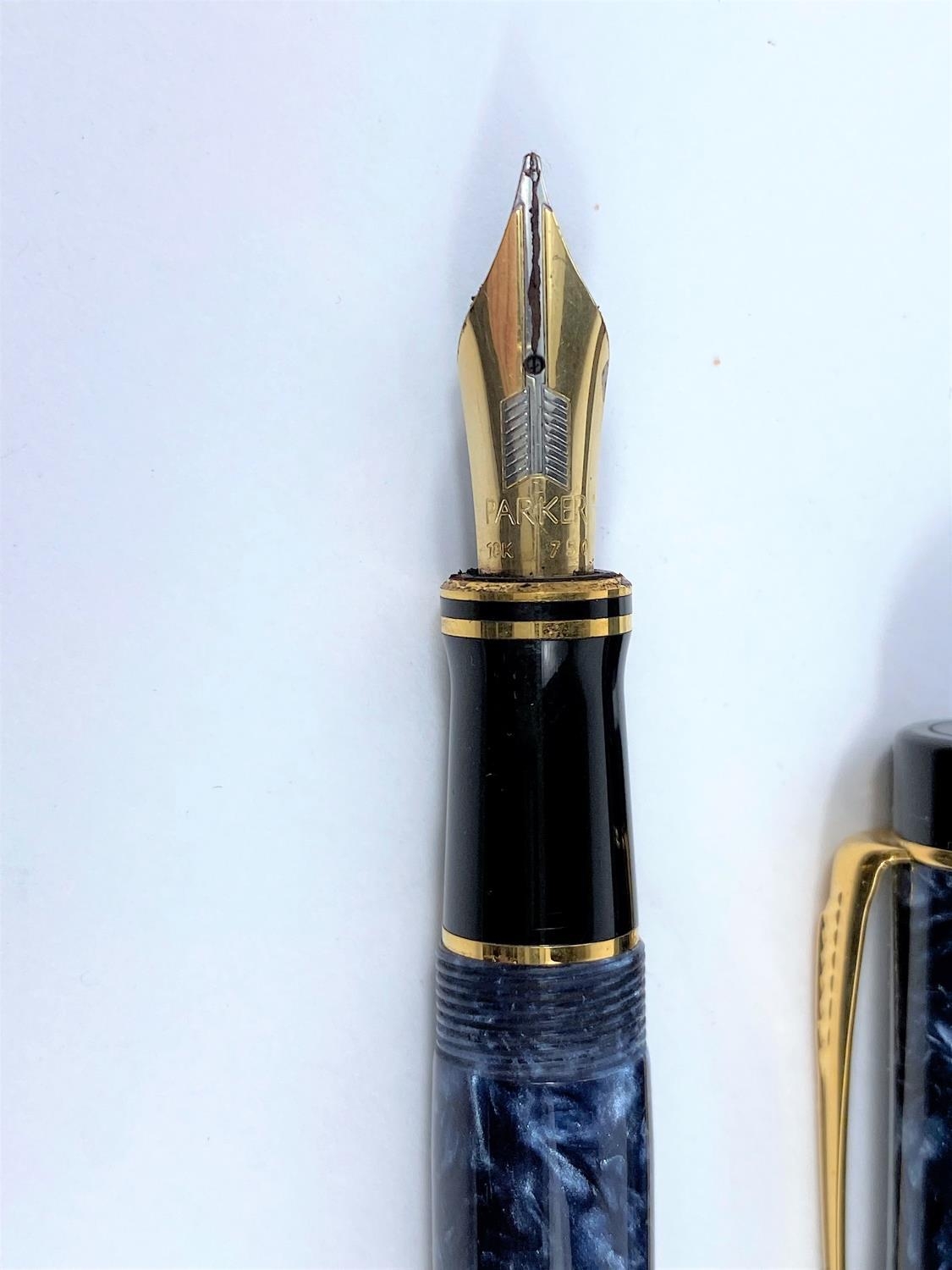 A Parker 'The Duofold' fountain pen with yellow and white metal nib stamped 18ct, with blue marble effect body & gilt metal fittings.