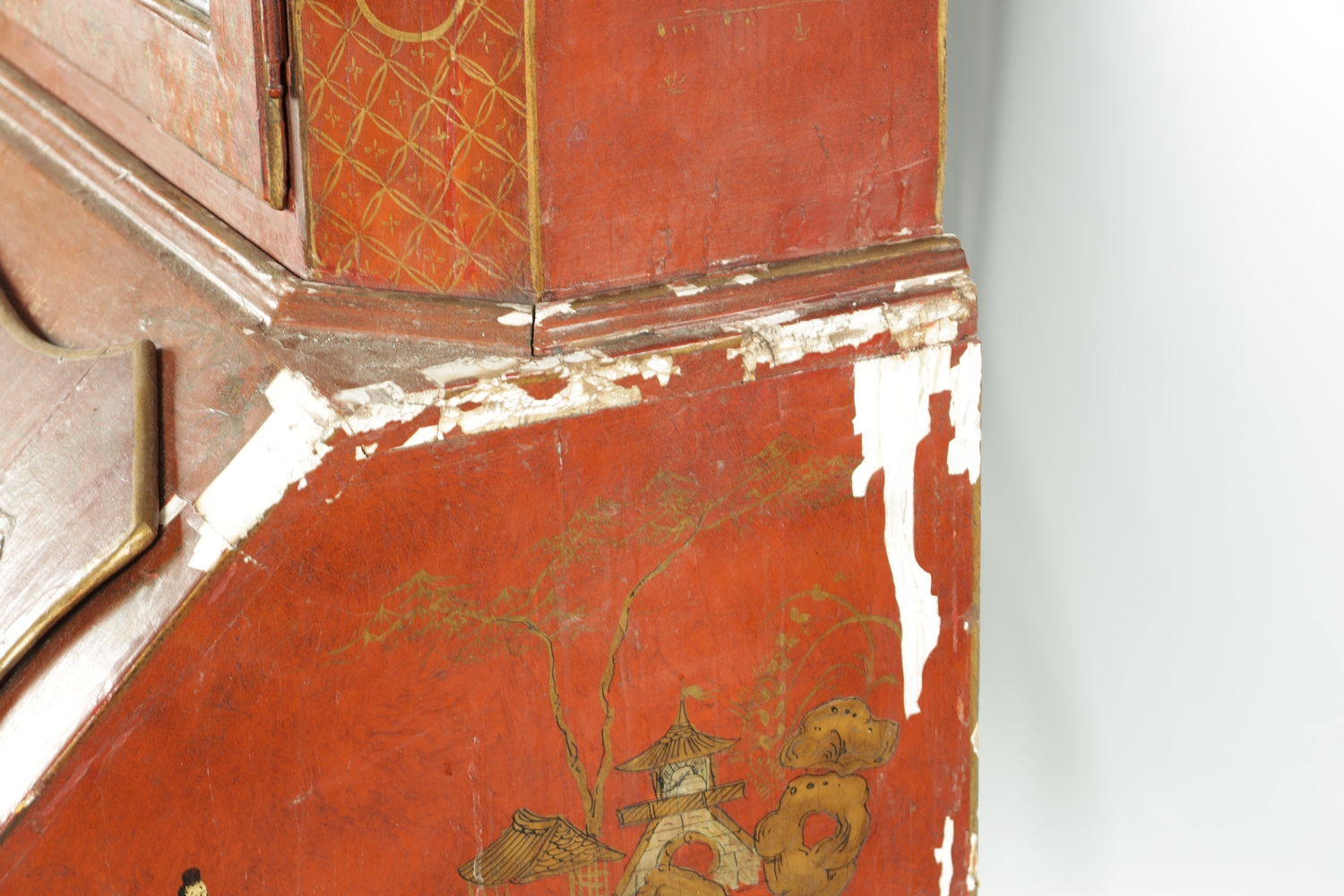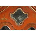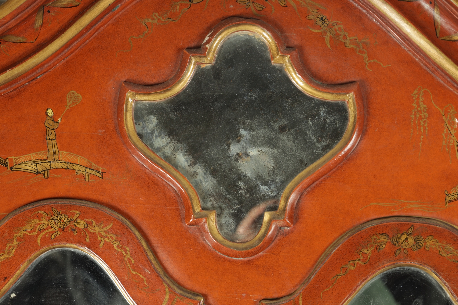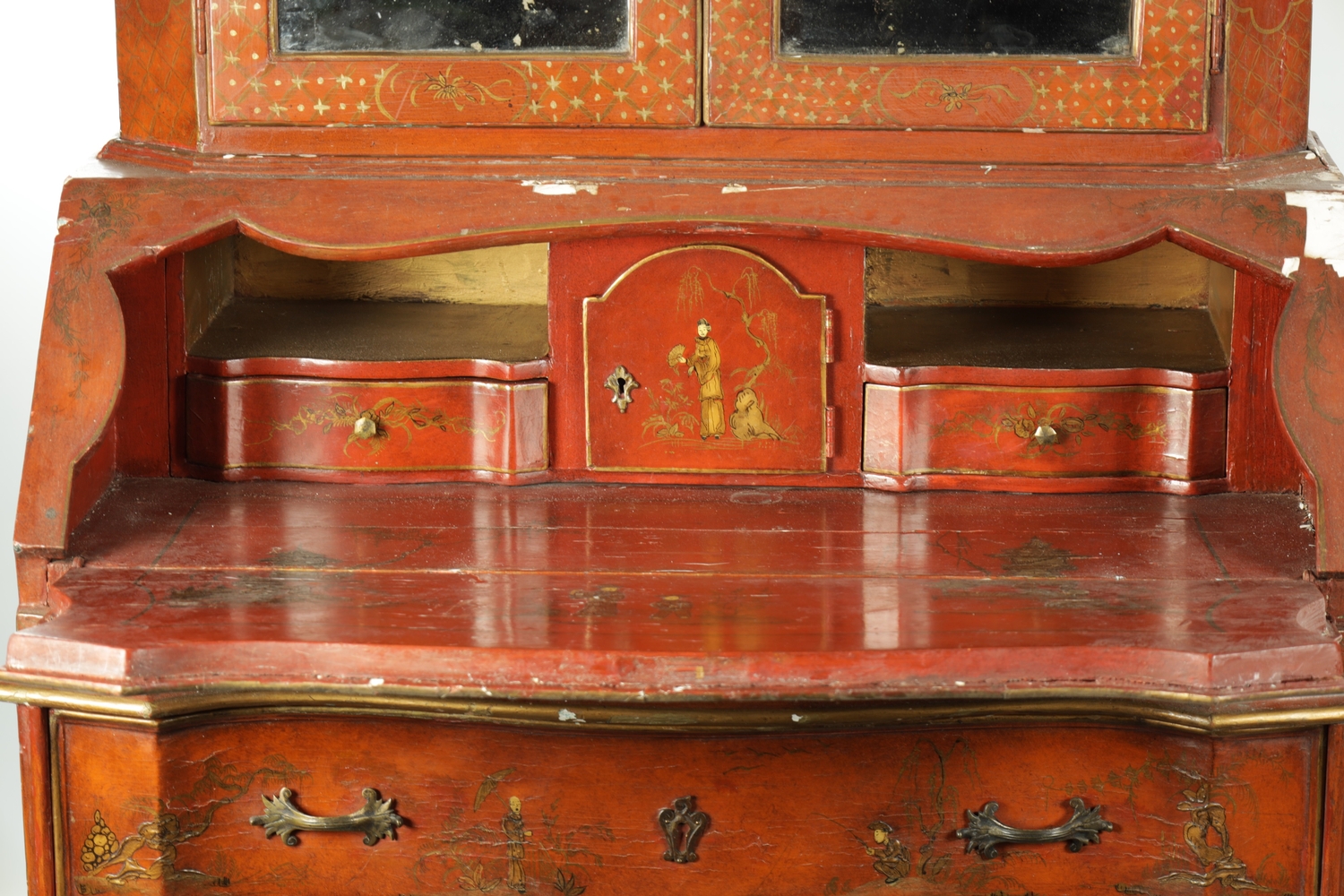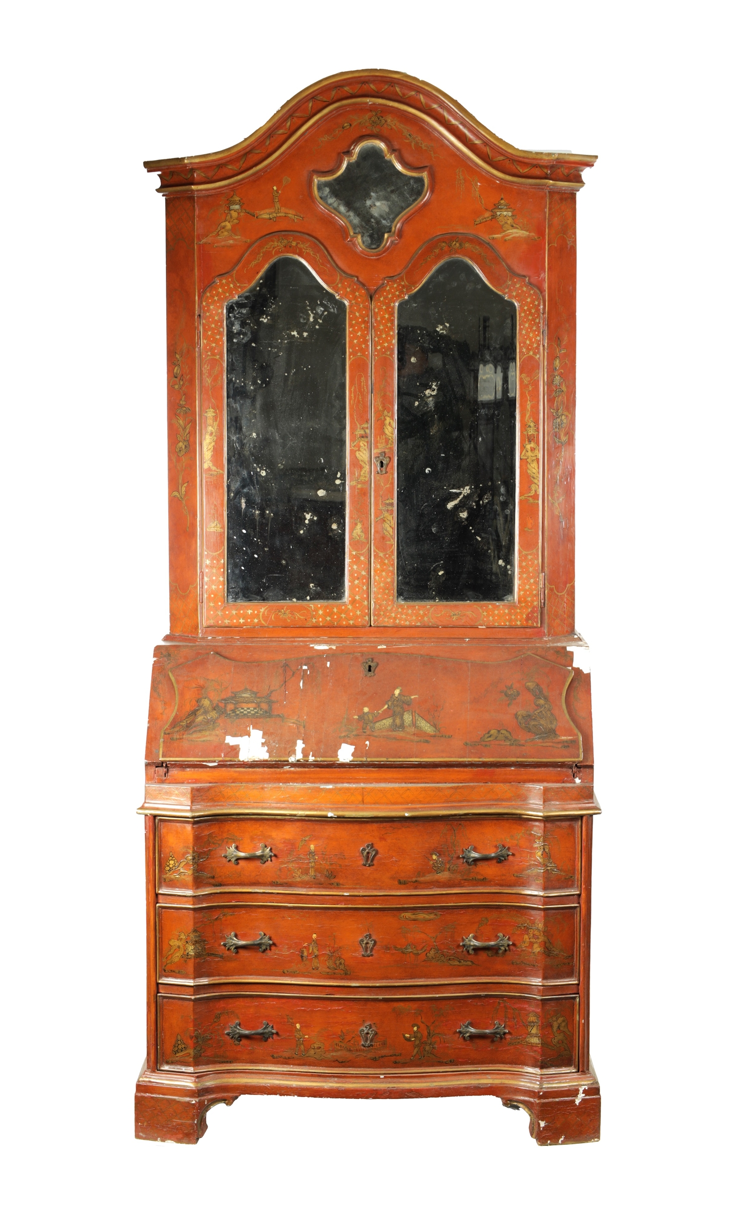 AN 18TH CENTURY CONTINENTAL SCARLET LACQUERED CHINOSORIERE BUREAU BOOKCASE with mirrored top having two hinged doors and shaped pediment above a serpentine shaped base with an angled fall revealing a fitted interior, four long drawers; standing on bun feet