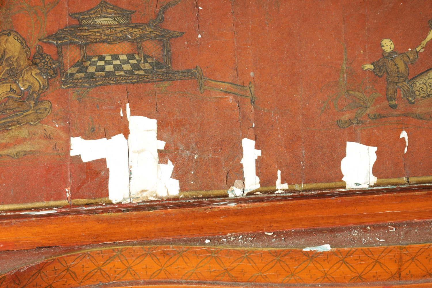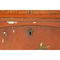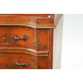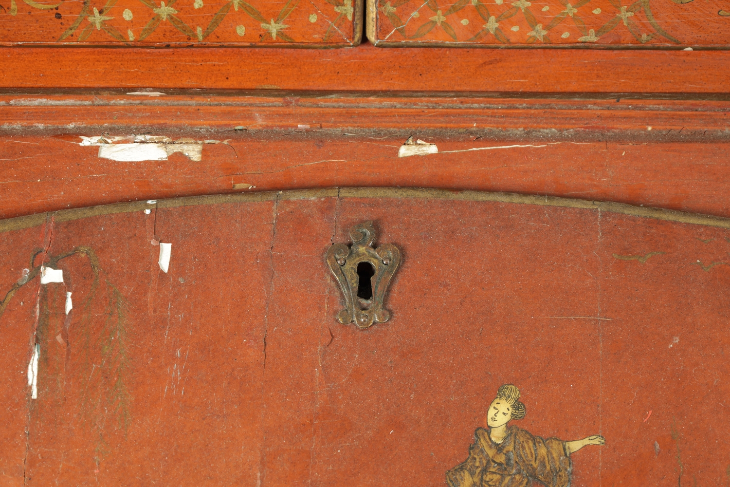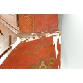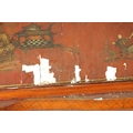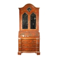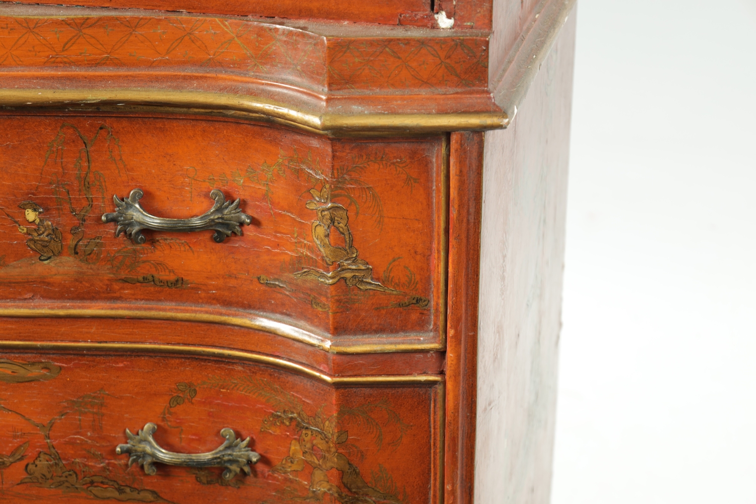 AN 18TH CENTURY CONTINENTAL SCARLET LACQUERED CHINOSORIERE BUREAU BOOKCASE with mirrored top having two hinged doors and shaped pediment above a serpentine shaped base with an angled fall revealing a fitted interior, four long drawers; standing on bun feet