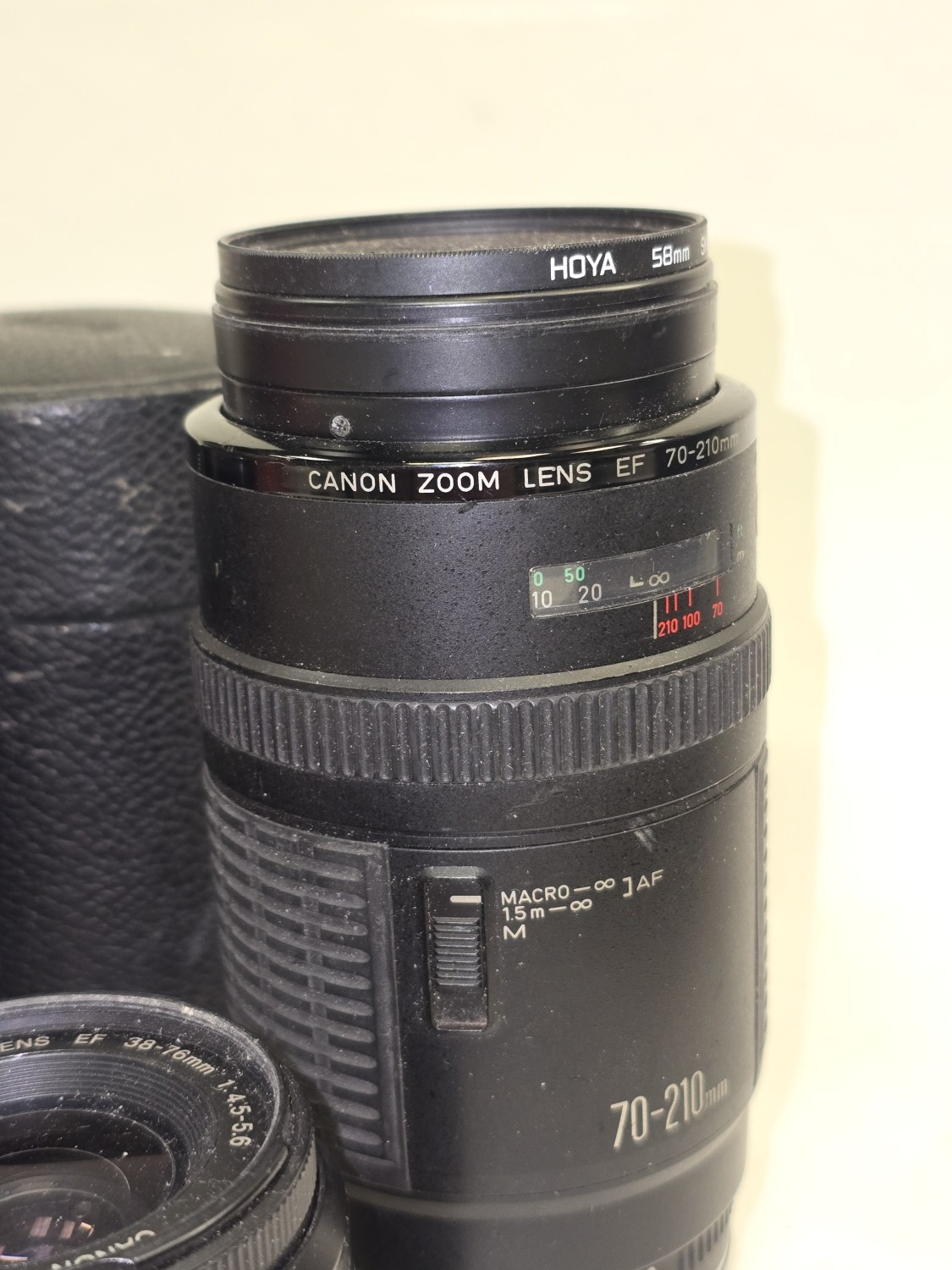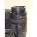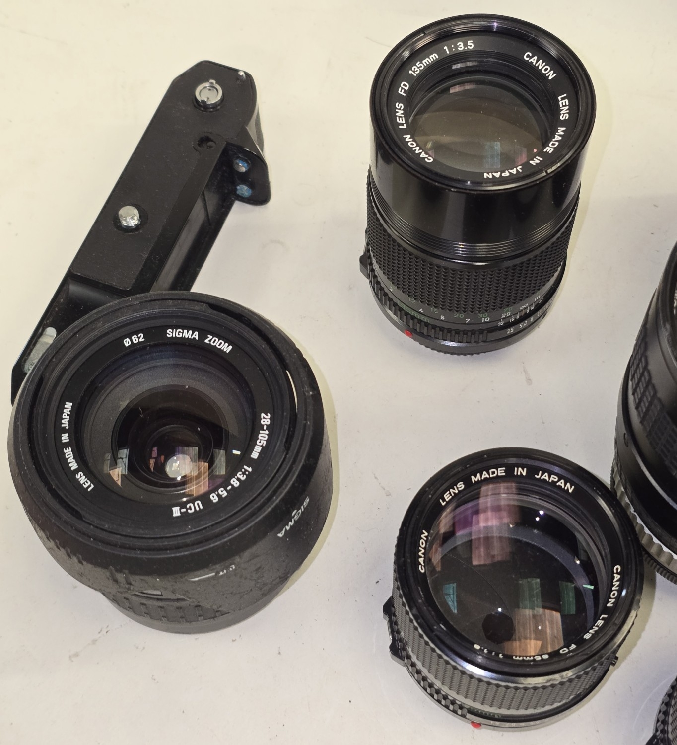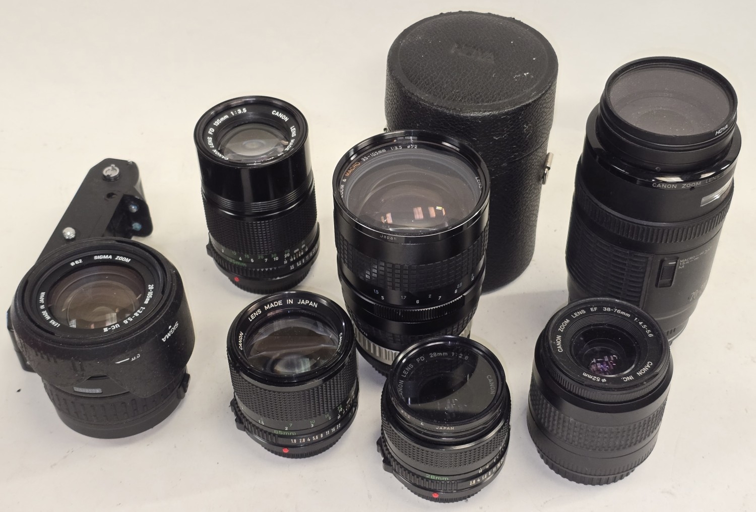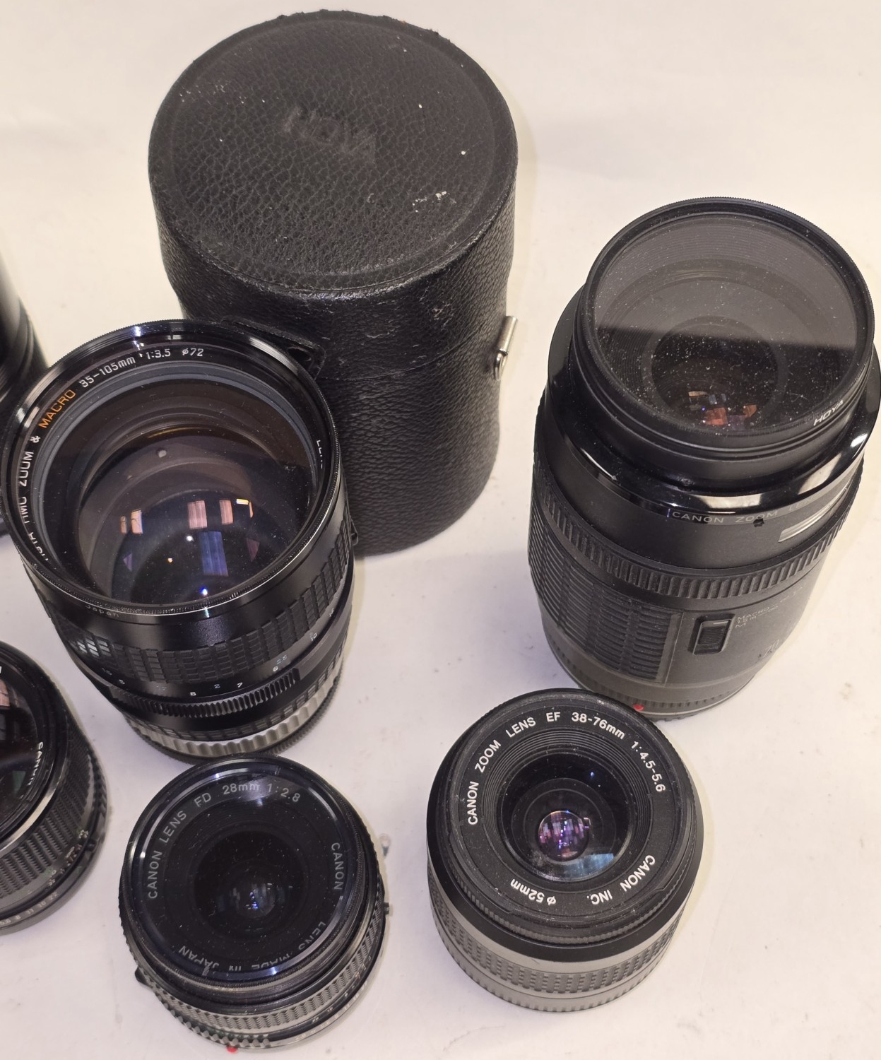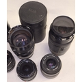 Collection of camera lenses to include Canon. Seven in all.